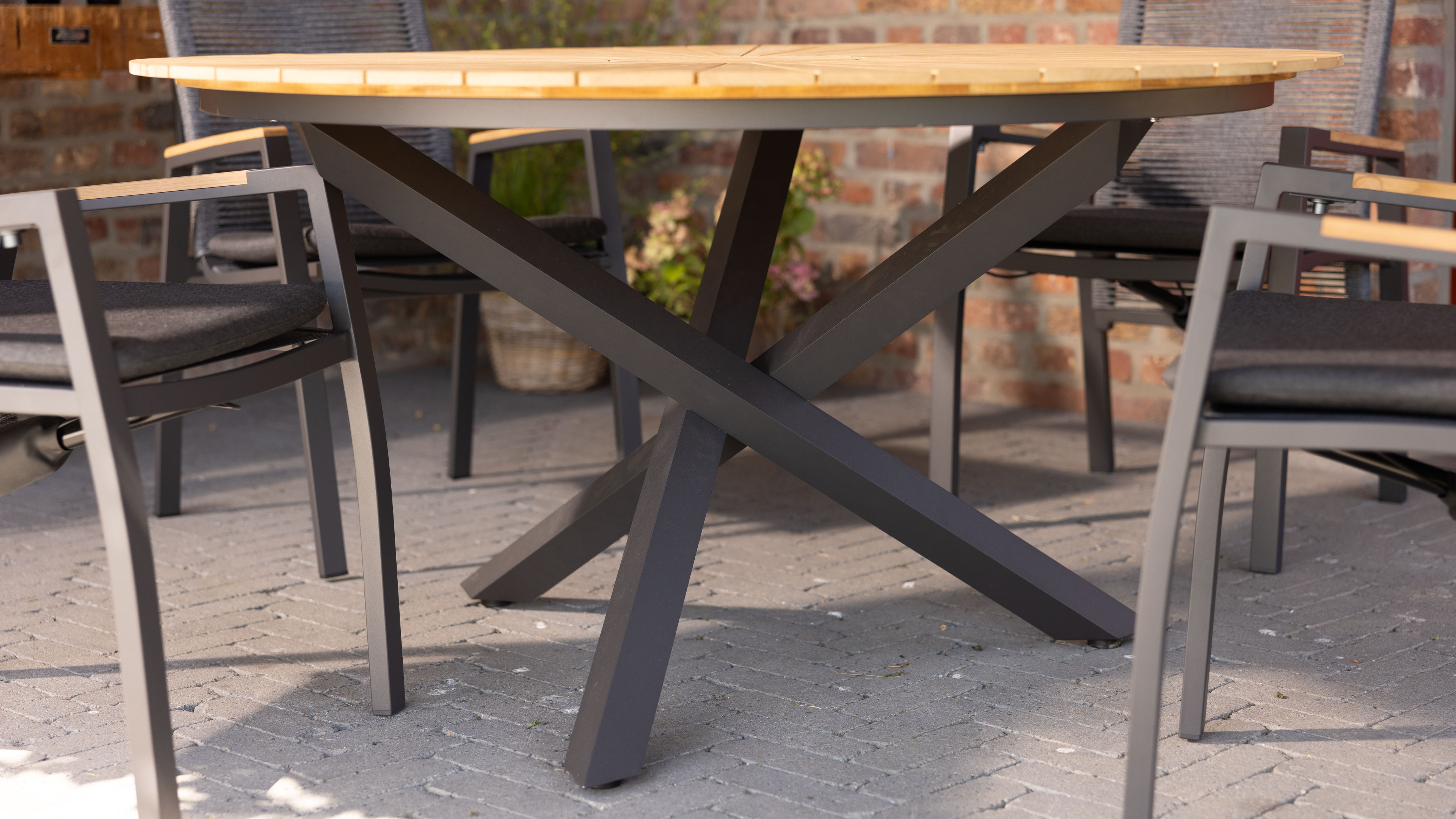 Runder Gartentisch mit stilvoller Teakholz-Tischplatte im modernen Sonnenstrahl-Design und stabilem Aluminium-Gestell