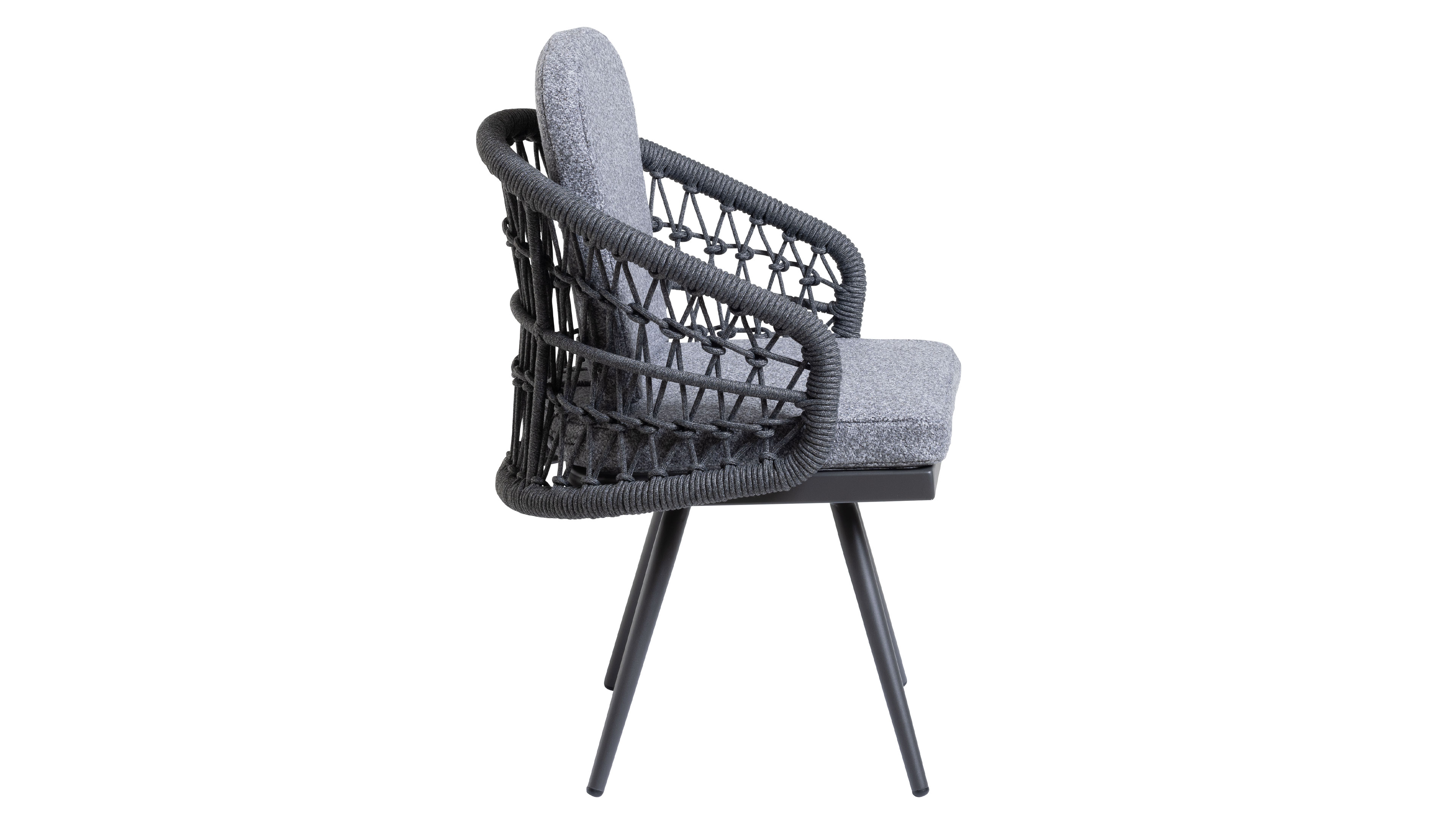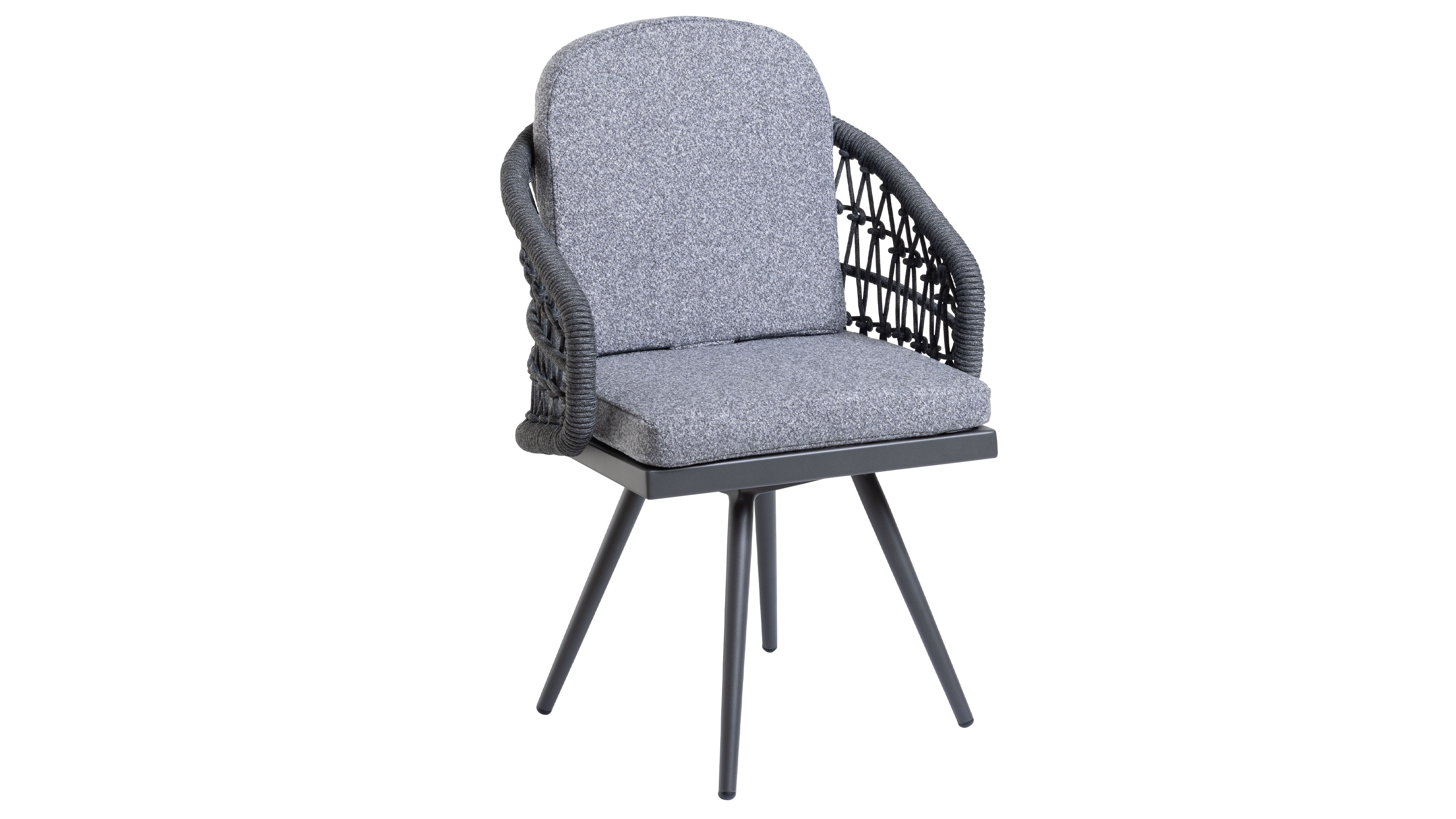 Eleganter Gartenstuhl mit grauer Sitzschale, komfortabler Polsterung, dekorativer Rope-Bespannung und praktischer Drehfunktion