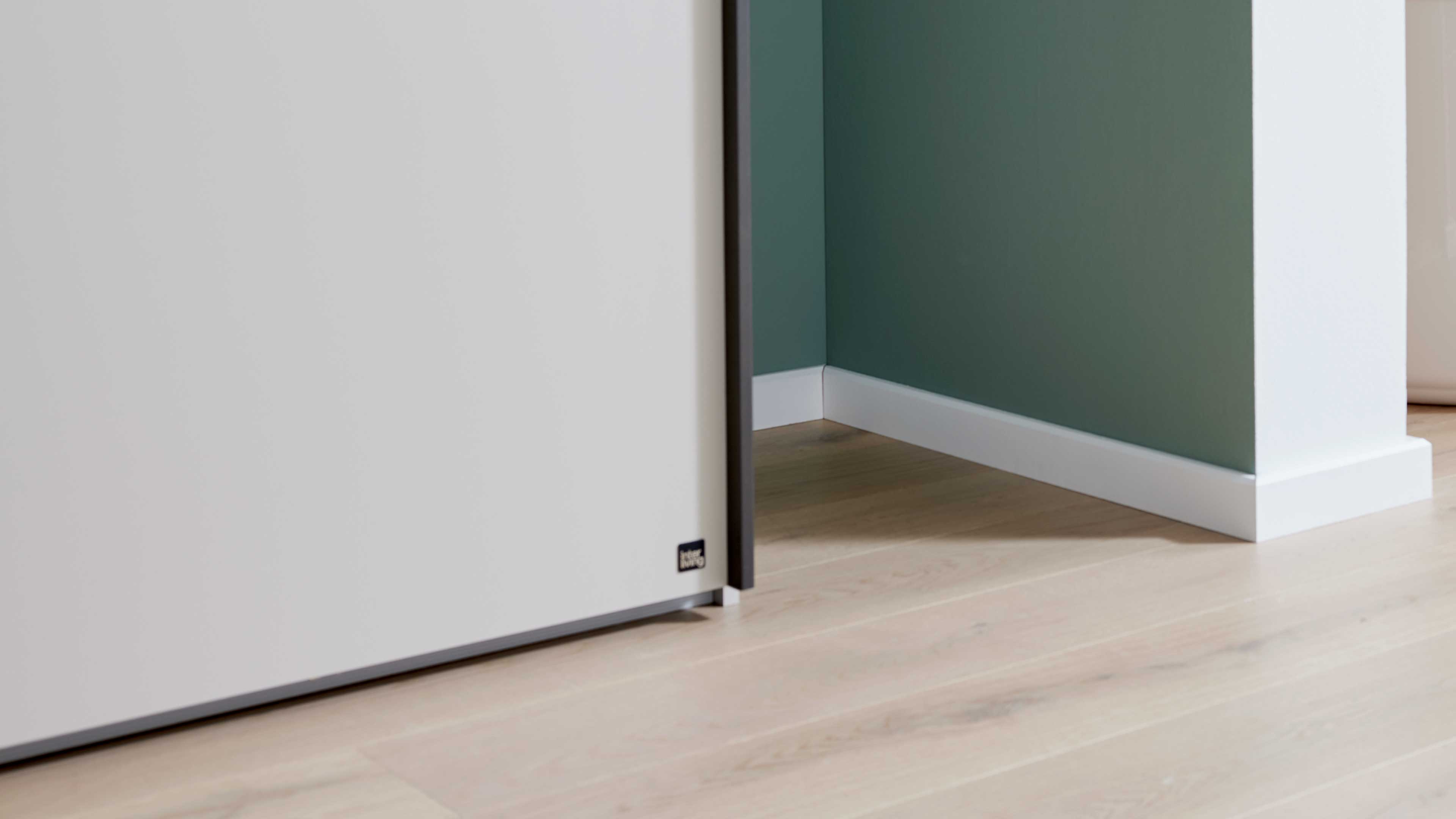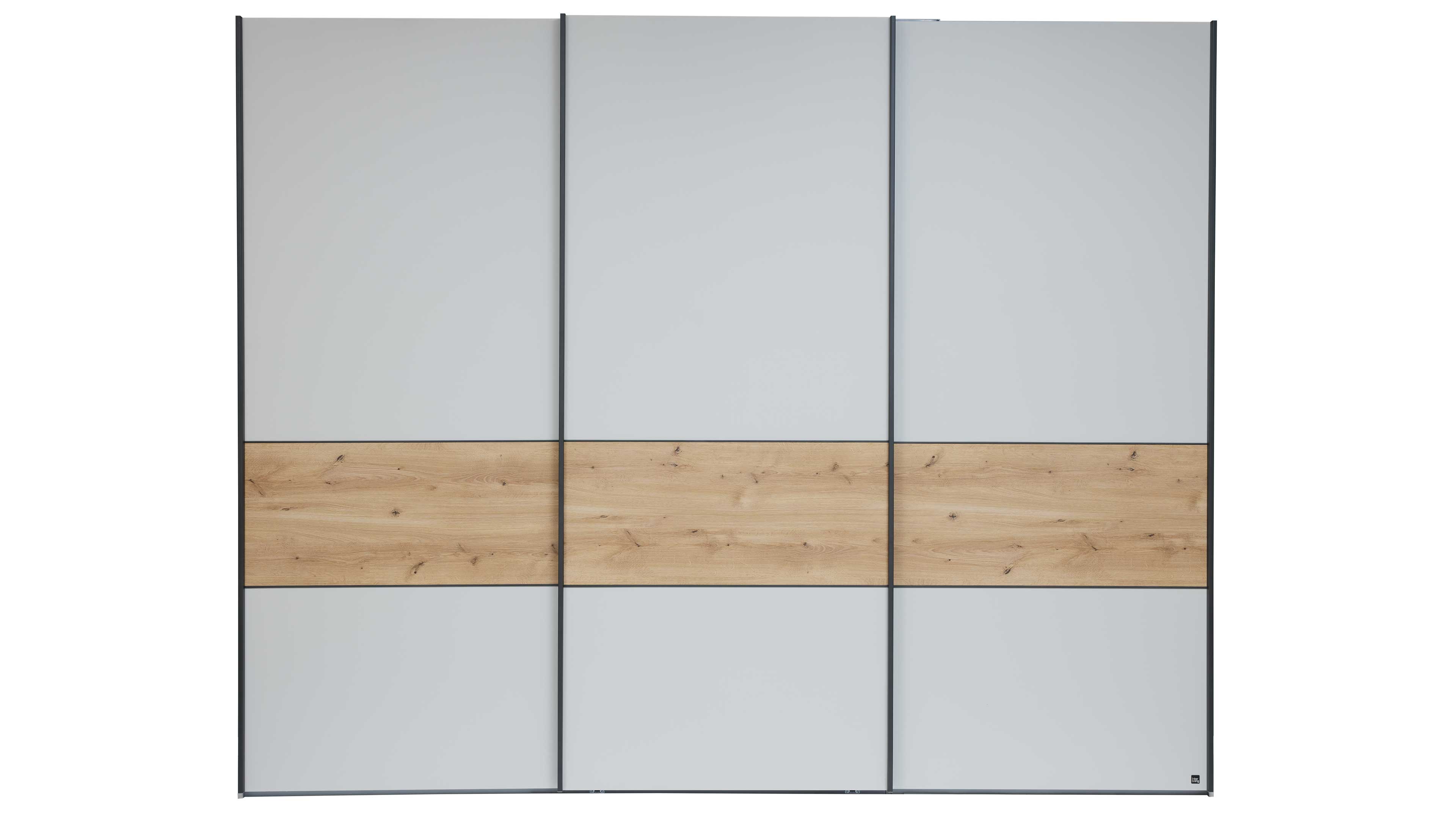 Schwebetürenschrank in Sand matt mit durchgehender Absetzung in Eiche-Nachbildung