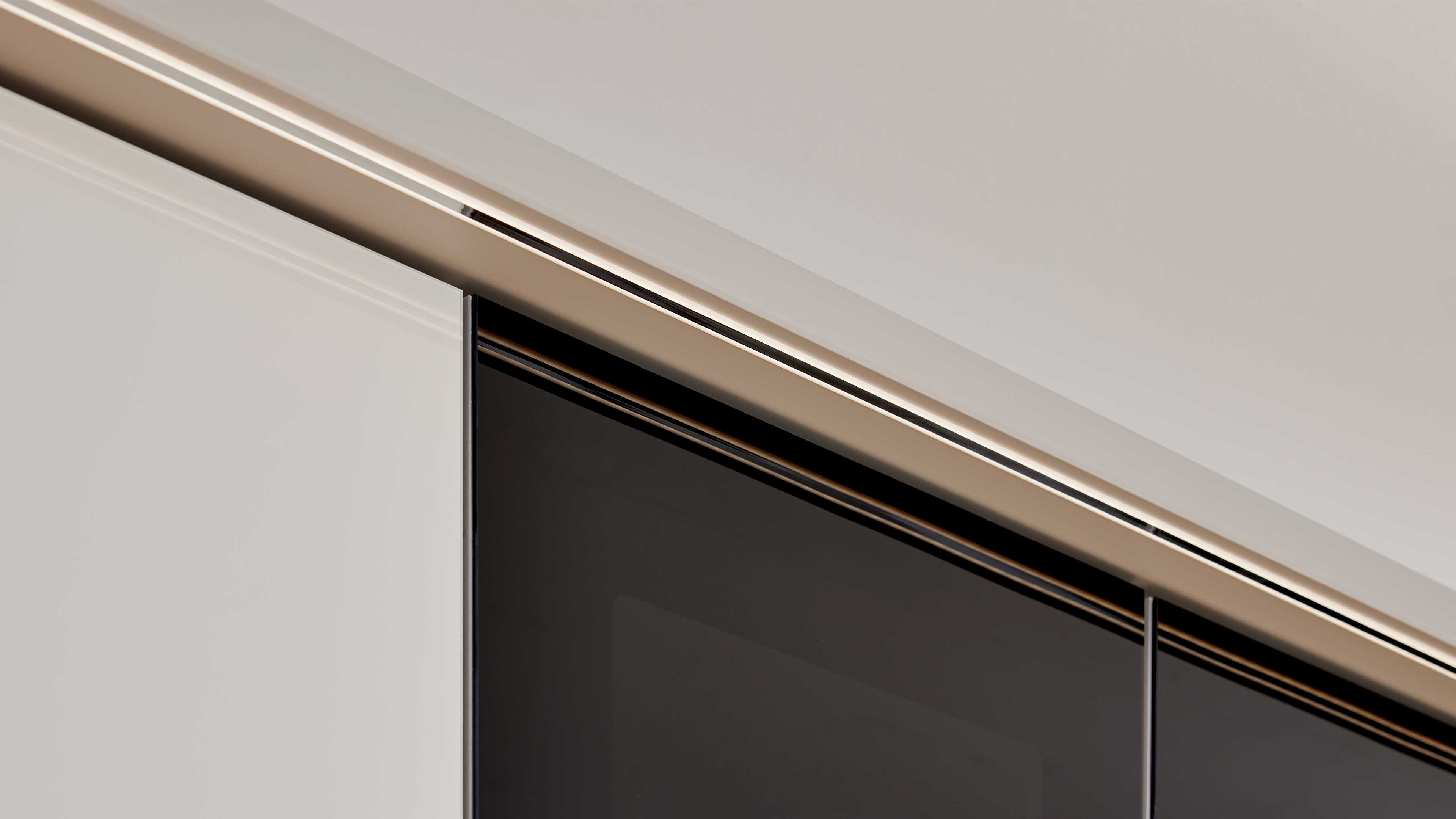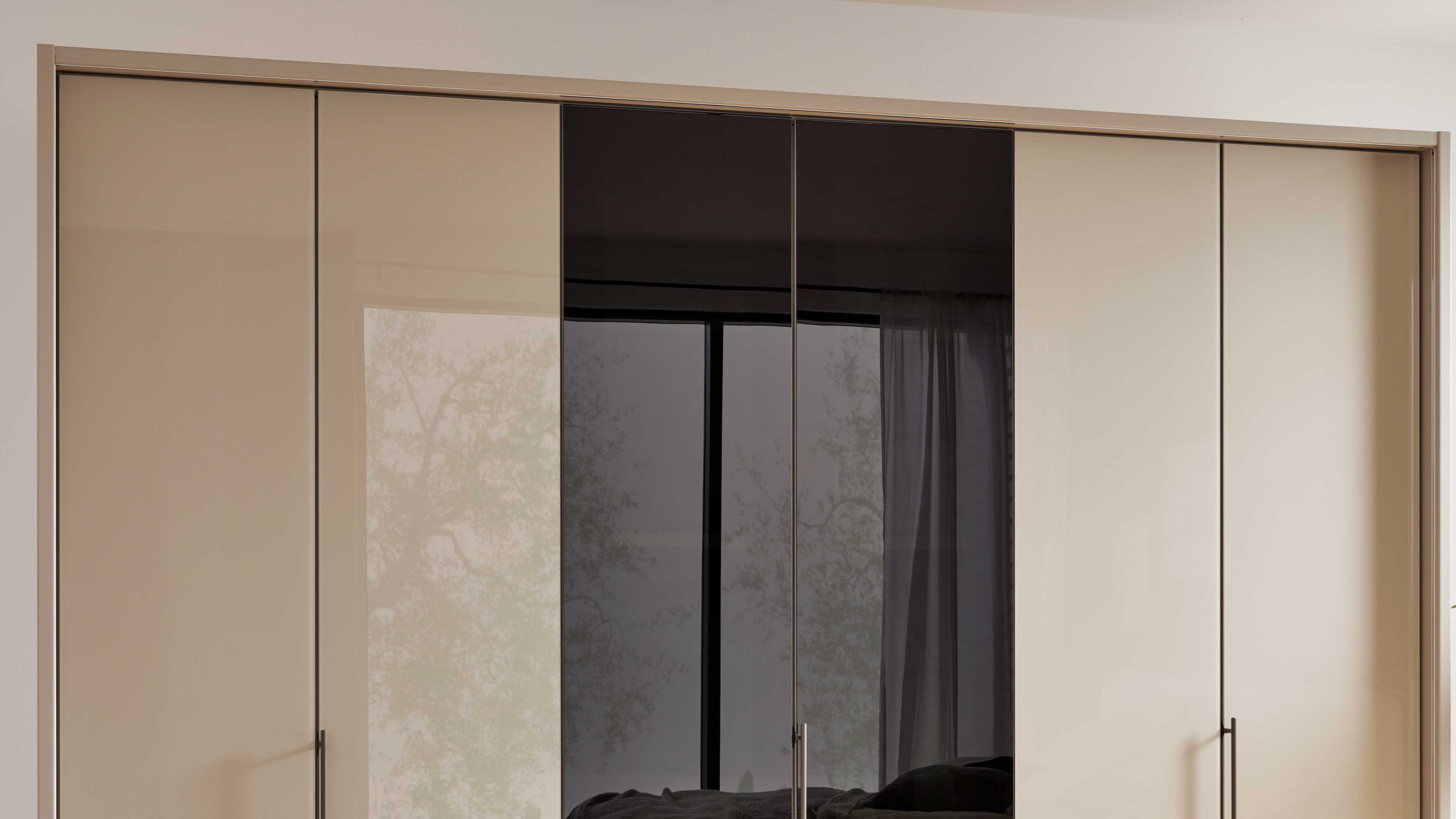Drehtürenschrank in Sandbeige mit Glasakzent und integrierter Beleuchtung