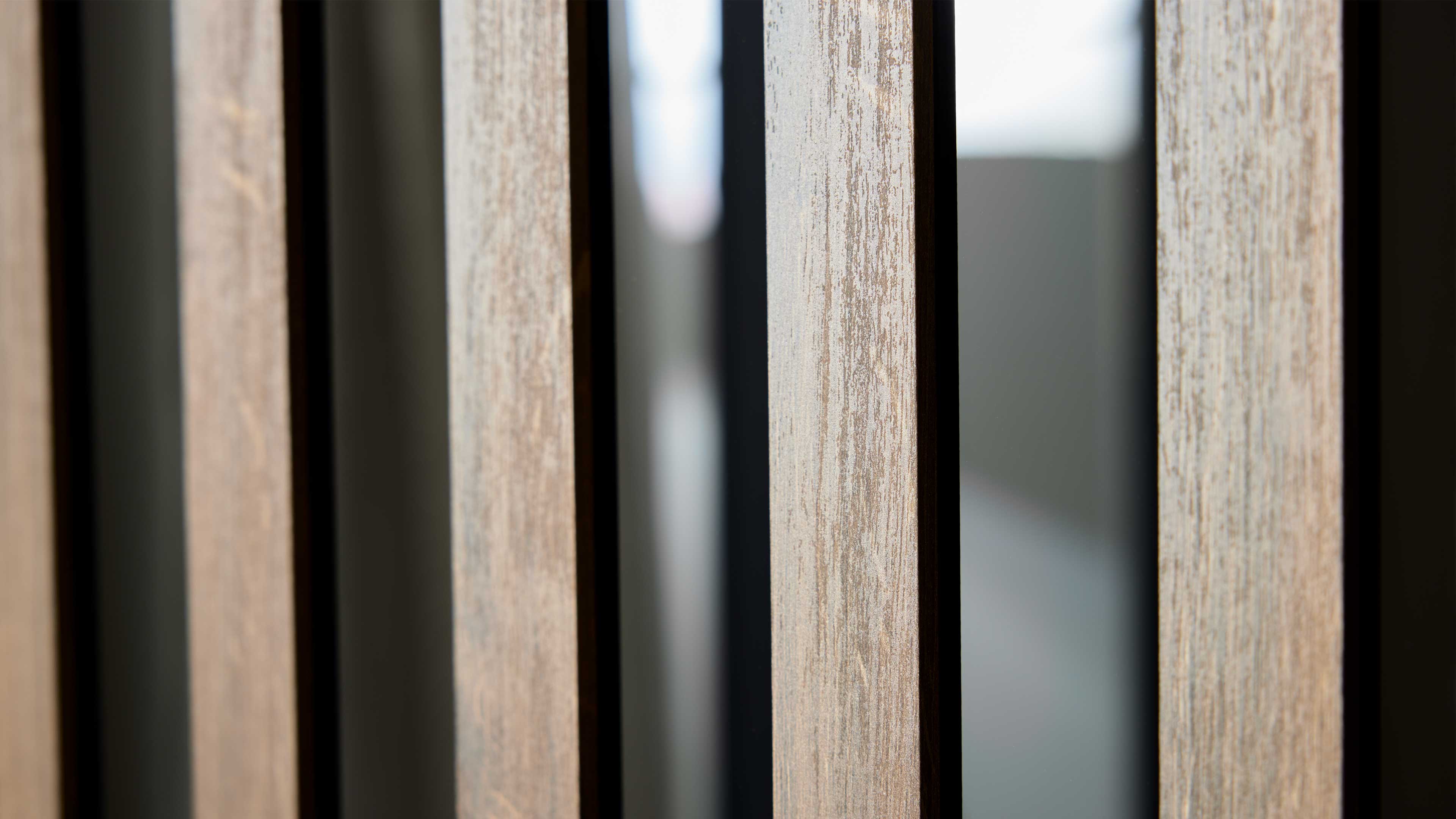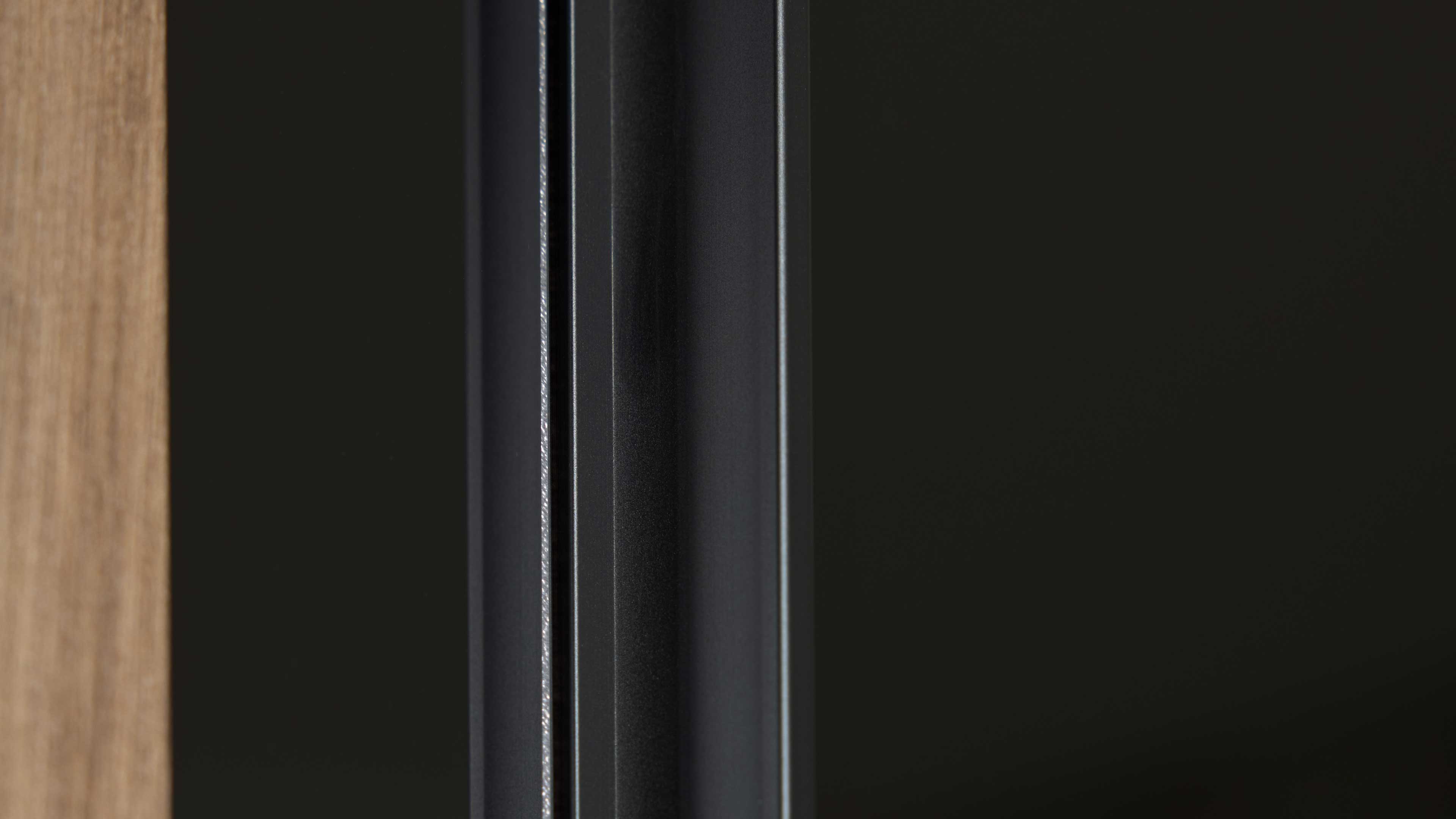 Schwebetürenschrank in Schwarzglas mit senkrechten Eiche-Applikationen