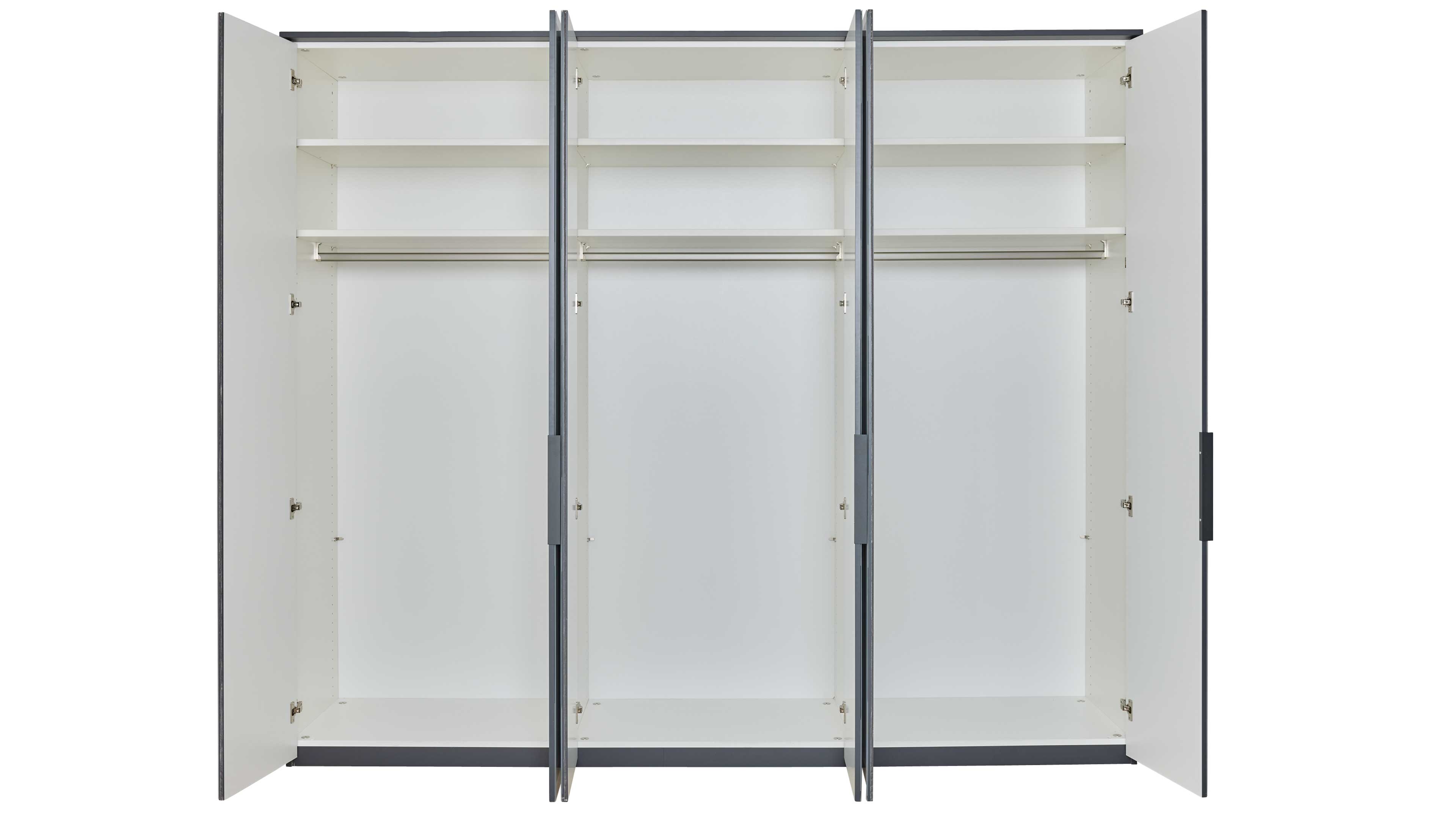 Der Kleiderschrank bringt Ordnung und Eleganz in dein Schlafzimmer. Mit seidengrauen Glasauflagen-Fronten, einem basaltfarben lackierten Korpus und anthrazitfarbenen Metallgriffen Basic überzeugt er optisch auf ganzer Linie. Hinter seinen sechs Türen findest du sechs Einlegeböden und drei stabile Metall-Kleiderstangen – perfekt für Kleidung, Accessoires und Wäsche. Mit Maßen von ca. 299 x 229 x 60 cm (B/LxHxT) bietet er dir großzügigen Stauraum, ohne übermäßig viel Platz zu beanspruchen.
