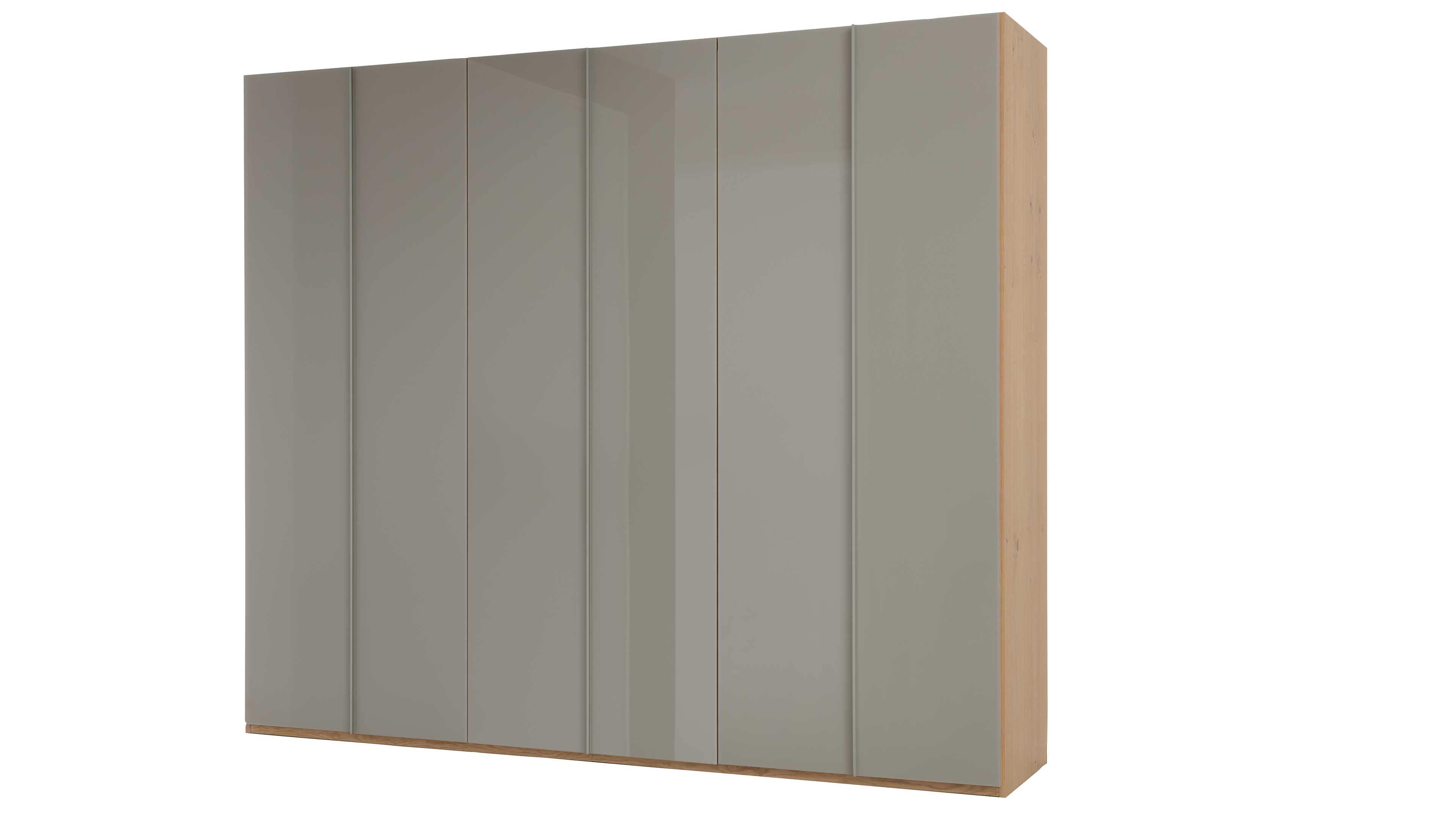 Drehtürenschrank mit Front in Glas Grau und Absetzungen in Eiche Nachbildung