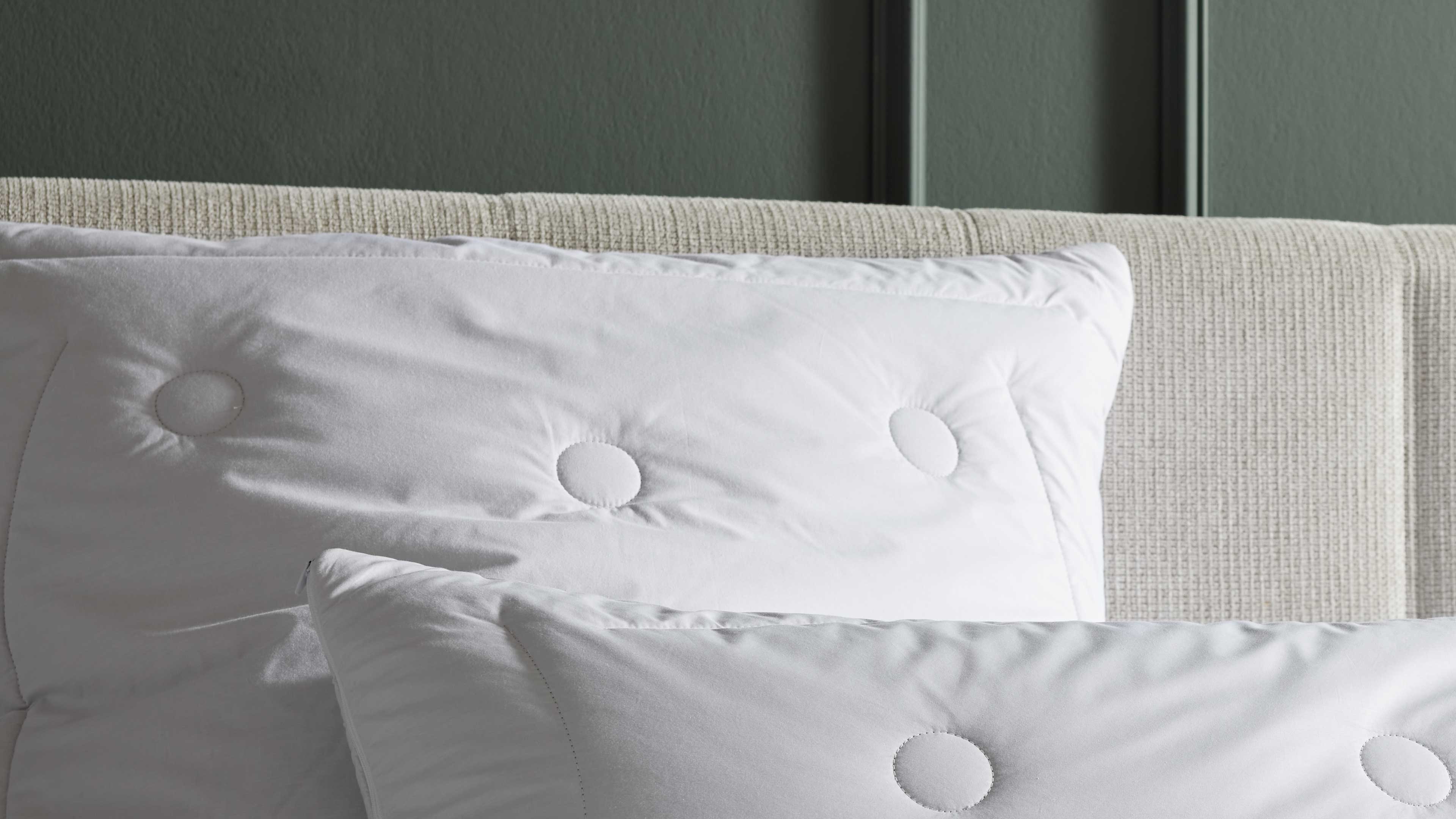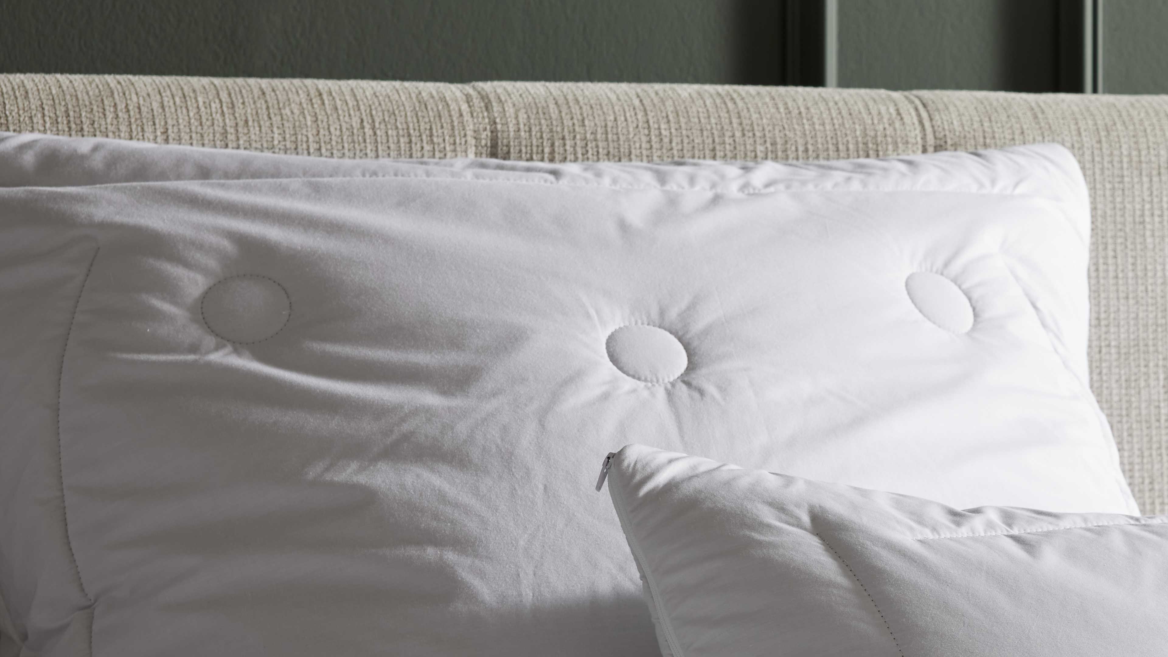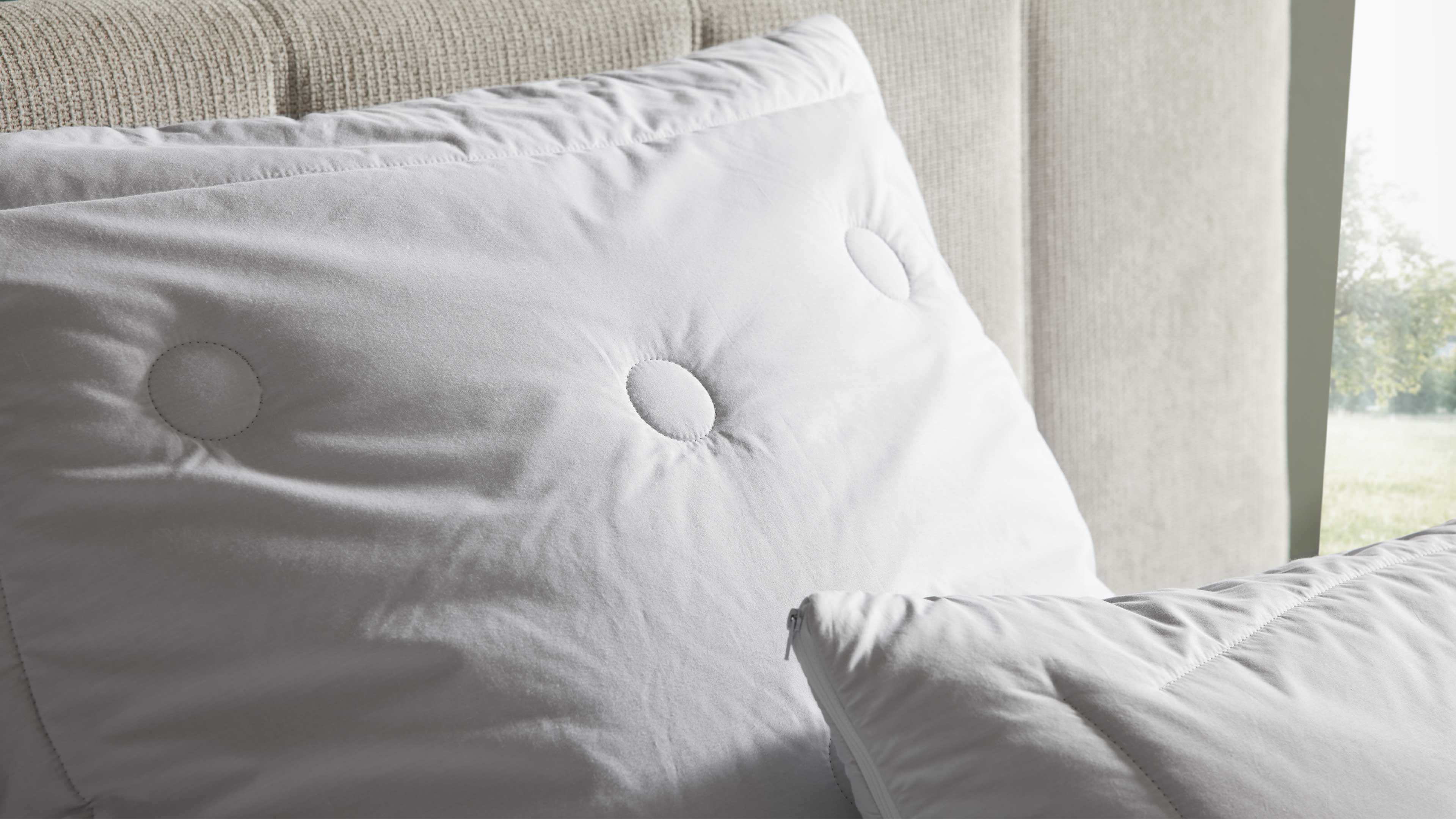 Ein Bezug aus weißem Baumwoll-Edel-Batist mit soft Finish bettet selbst sensible Haut besonders sanft. Die gesteppte Kissenhülle mit Reißverschluss ist abnehmbar und laut Etikett waschbar.
