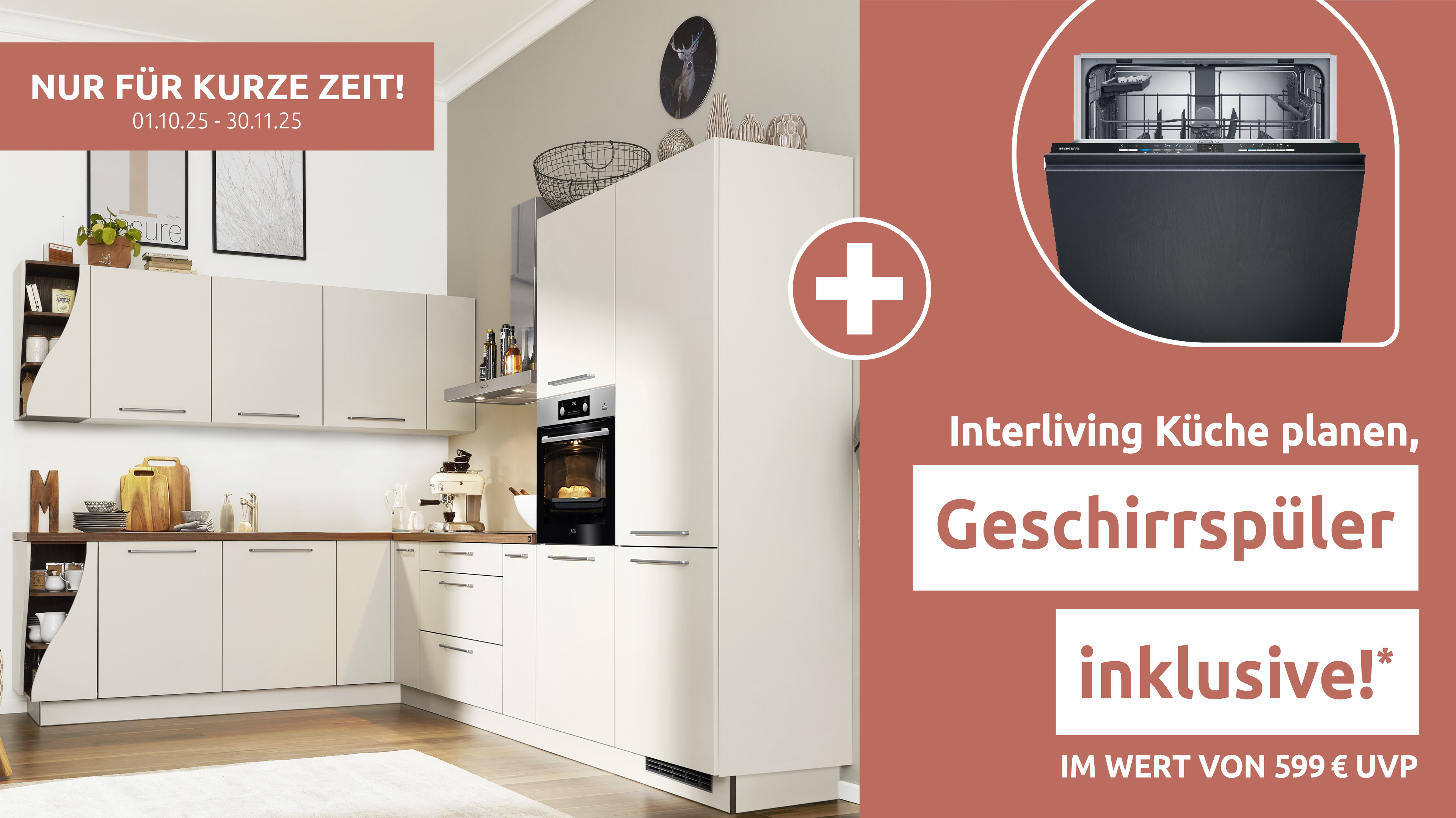 * Bei Planung einer Interliving Küche Serie 3085 erhältst du einen Siemens Geschirrspüler SN6IX14TE im Wert von 599 € UVP inklusive. UVP des Herstellers: 599 €, Stand: 10/2025. Gilt nur für Neuverträge frei geplanter Küchen im Aktionszeitraum 01.10.25 - 30.11.25. Es gelten die AGB des jeweiligen teilnehmenden Hauses.
