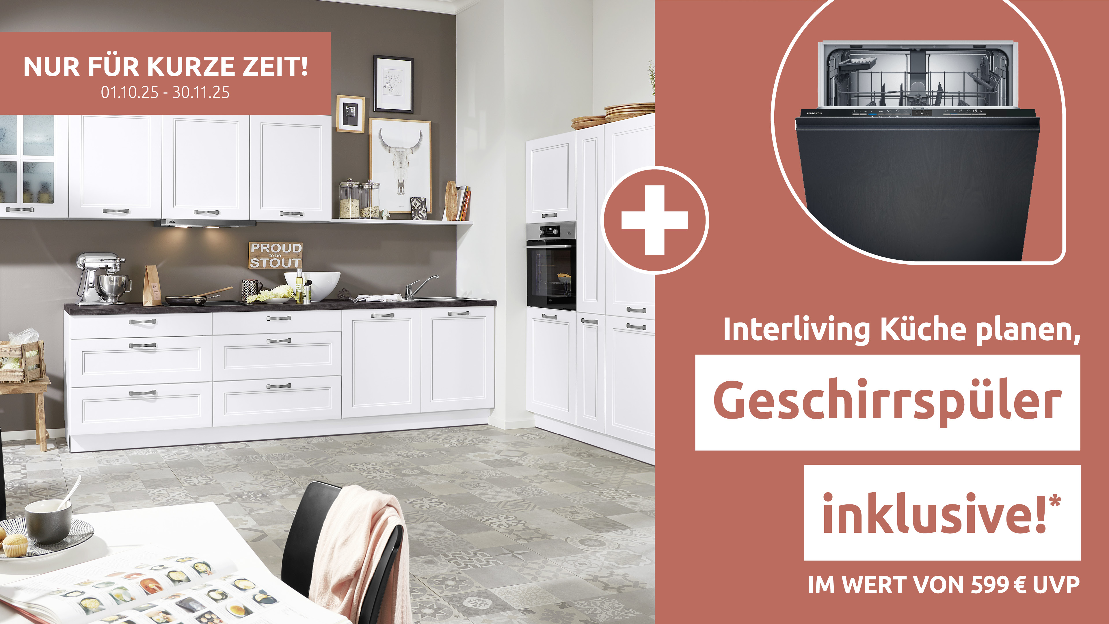 * Bei Planung einer Interliving Küche Serie 3023 erhältst du einen Siemens Geschirrspüler SN6IX14TE im Wert von 599 € UVP inklusive. UVP des Herstellers: 599 €, Stand: 10/2025. Gilt nur für Neuverträge frei geplanter Küchen im Aktionszeitraum 01.10.25 - 30.11.25. Es gelten die AGB des jeweiligen teilnehmenden Hauses.