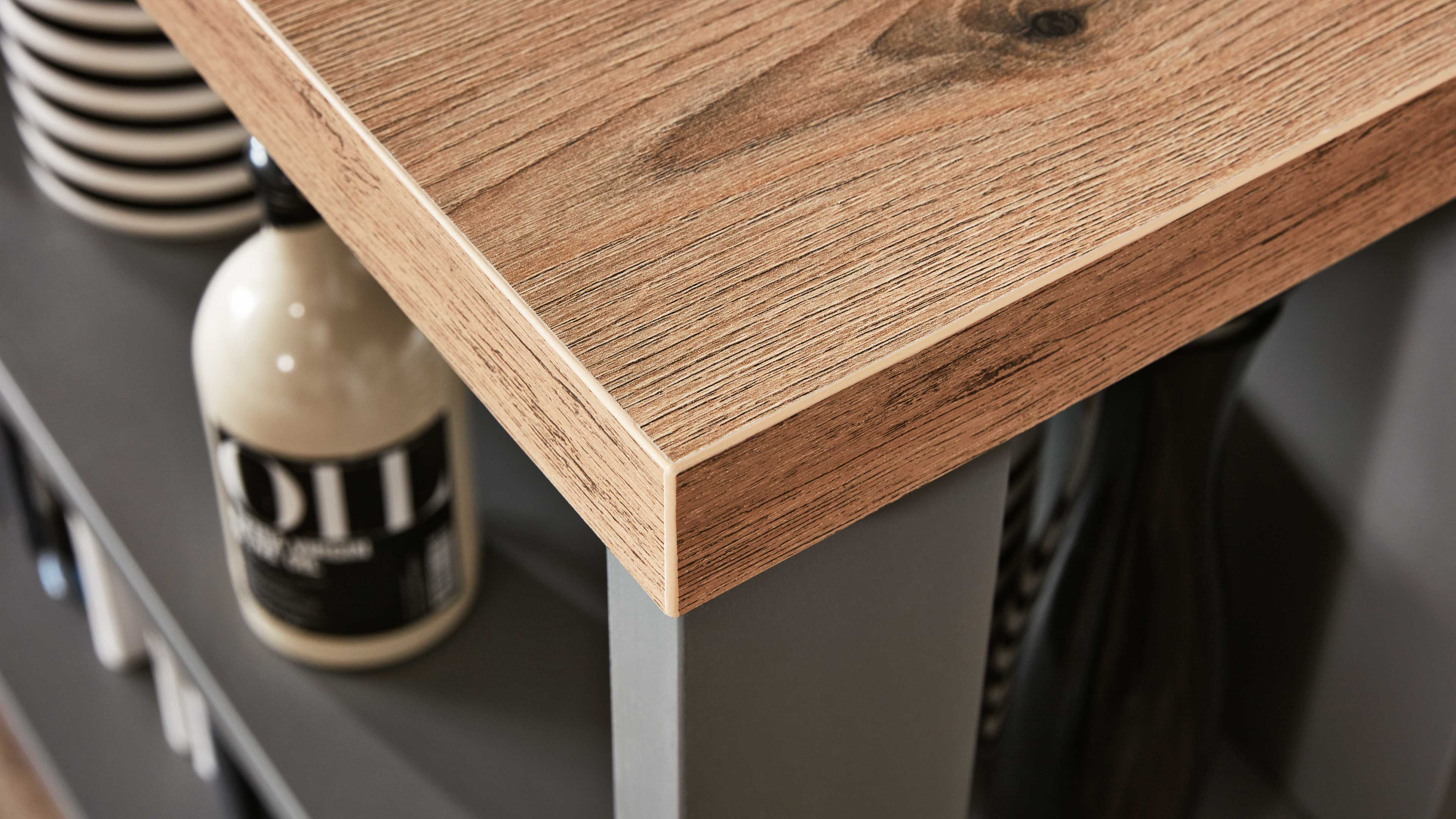 Die zweizeilige Küche bietet reichlich Platz und Stauraum für all deine Bedürfnisse. Die Hochschranklösung misst ca. 120 cm, während die Stellfläche der L-Zeile mit ca. 318 x 217 cm (BxL, von links nach rechts) ein großzügiges Schenkelmaß ergibt. Schränke, Auszüge und offene Regale sorgen für Ordnung und Übersicht bei Geschirr, Küchenutensilien und Vorräten.
