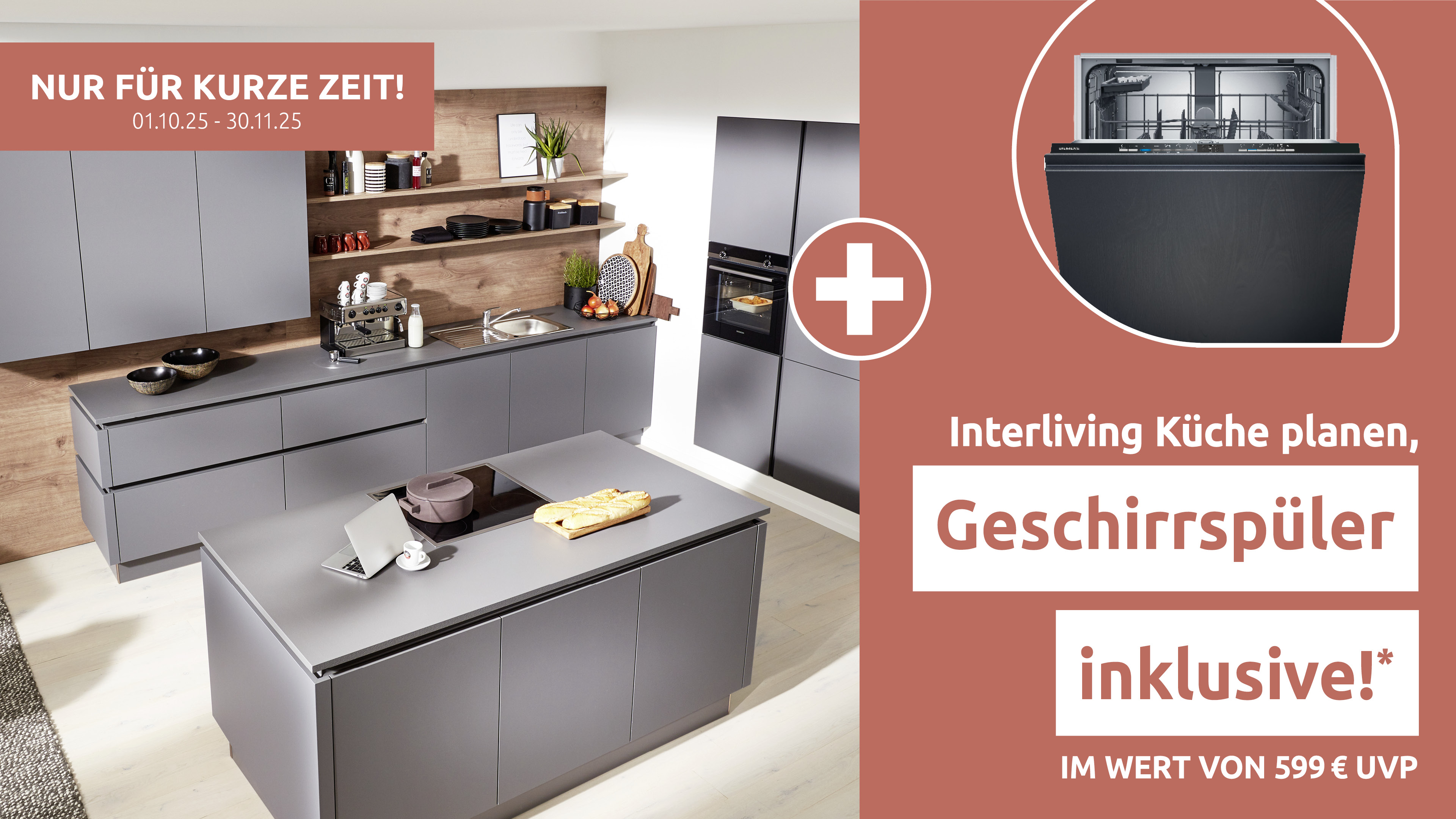 * Bei Planung einer Interliving Küche Serie 3030 erhältst du einen Siemens Geschirrspüler SN6IX14TE im Wert von 599 € UVP inklusive. UVP des Herstellers: 599 €, Stand: 10/2025. Gilt nur für Neuverträge frei geplanter Küchen im Aktionszeitraum 01.10.25 - 30.11.25. Es gelten die AGB des jeweiligen teilnehmenden Hauses.