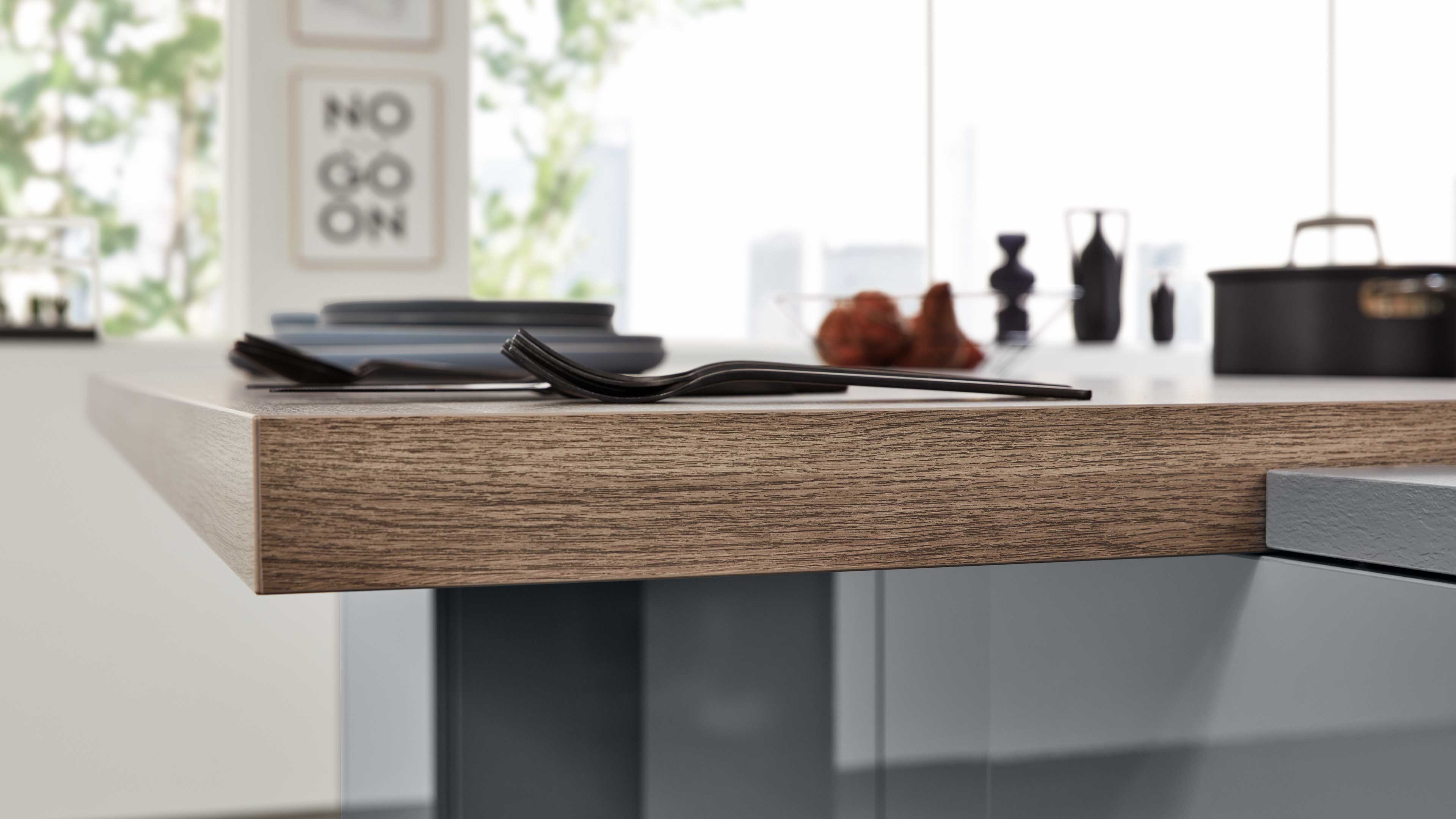 Die Interliving Küche Serie 3042 verbindet modernes Design mit edler Ausstrahlung. Hochglänzende Lacklaminatfronten in Quarzgrau treffen auf die elegante Eiche-Nachbildung in Graphitsilber. Korpusse und Sockelblenden greifen das Quarzgrau erneut auf, während Regale, Nischenverkleidung und Frühstückstheke die Eiche-Nachbildung betonen. Abgerundet wird das stilvolle Gesamtbild durch Arbeitsplatten in beiden Farbwelten sowie die grifflos umgesetzten Fronten, die der Küche eine puristische Eleganz verleihen.
