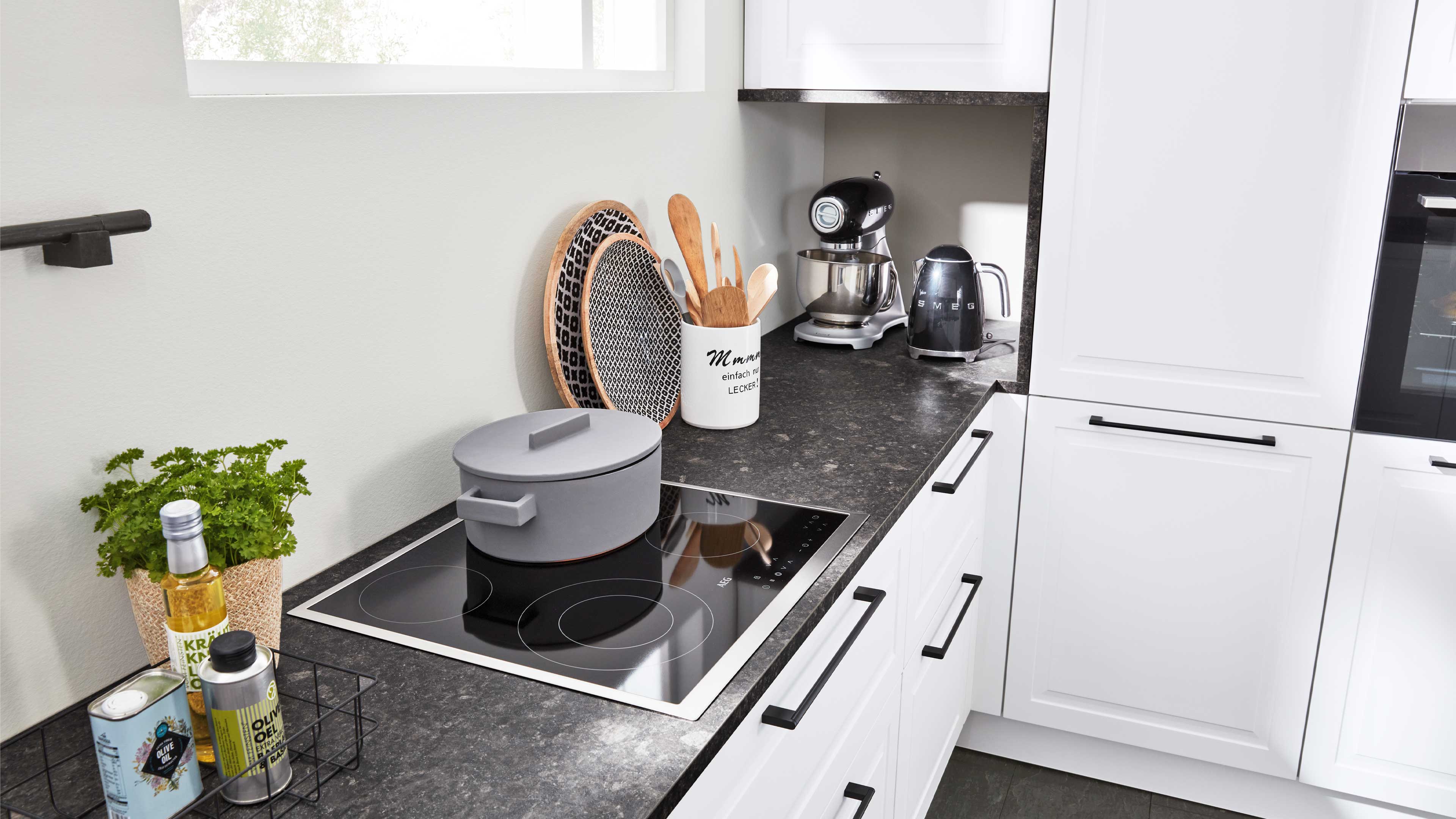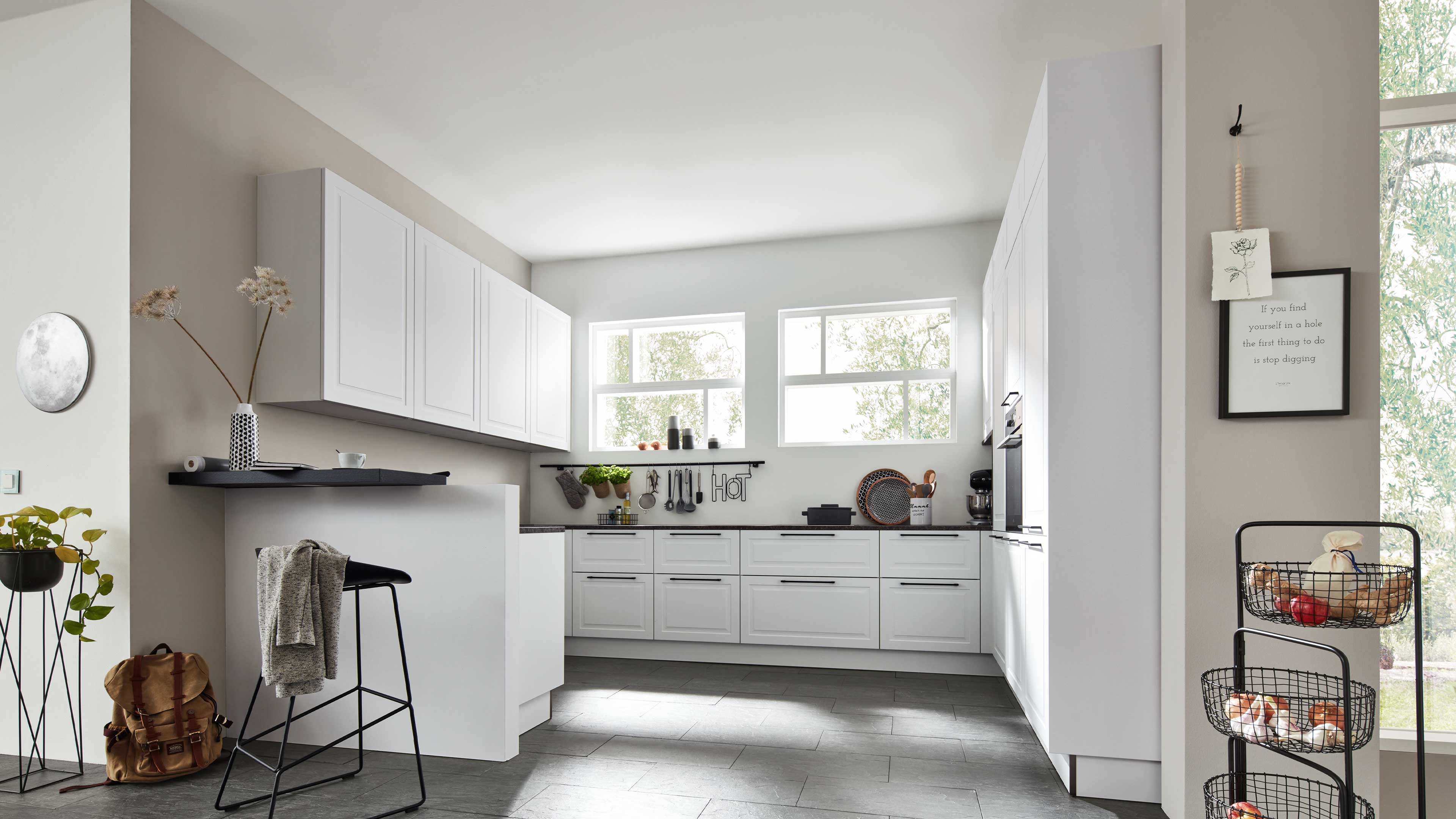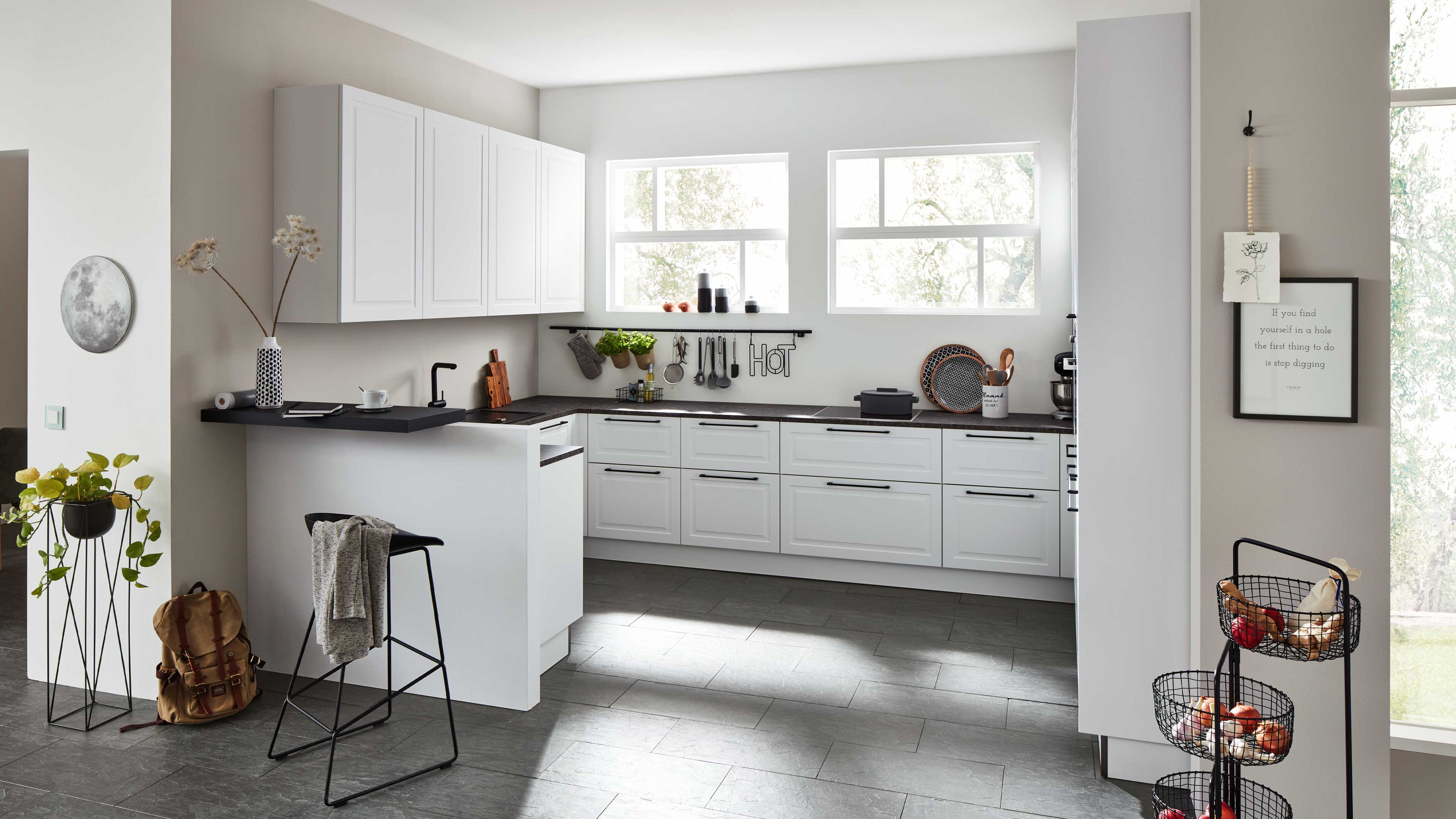 Die Interliving Küche Serie 3045 verbindet klassische Schlichtheit mit modernen Details. Ihre softmatten weißen Fronten wirken zeitlos elegant und harmonieren perfekt mit den premiumweißen Korpussen und Sockelblenden. Für spannende Kontraste sorgen die Arbeitsplatten im Farbton Terra Mare sowie die schwarzen Griffe und der schwarze Tresen, die dem Design eine stilvolle Landhausnote verleihen.