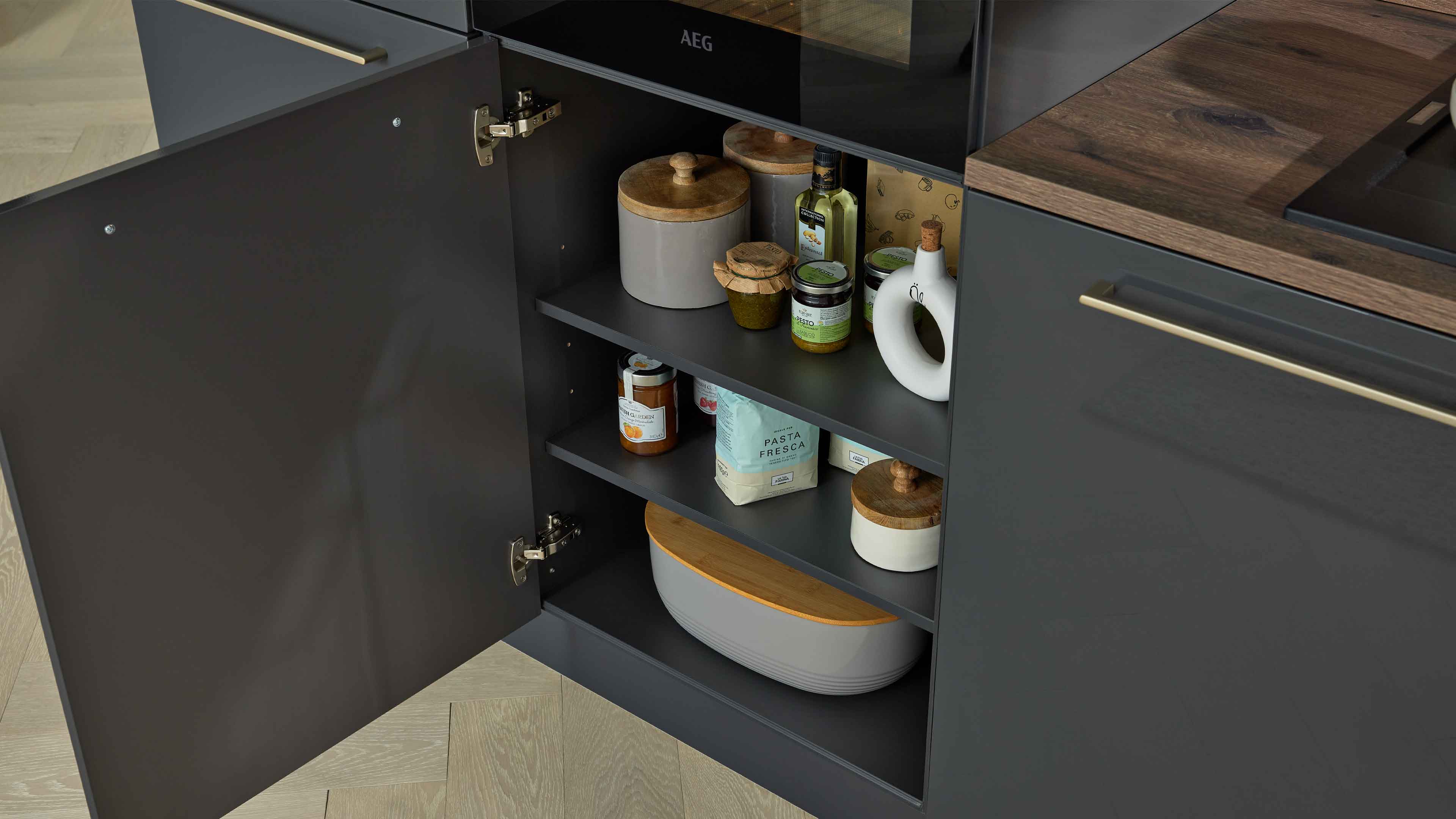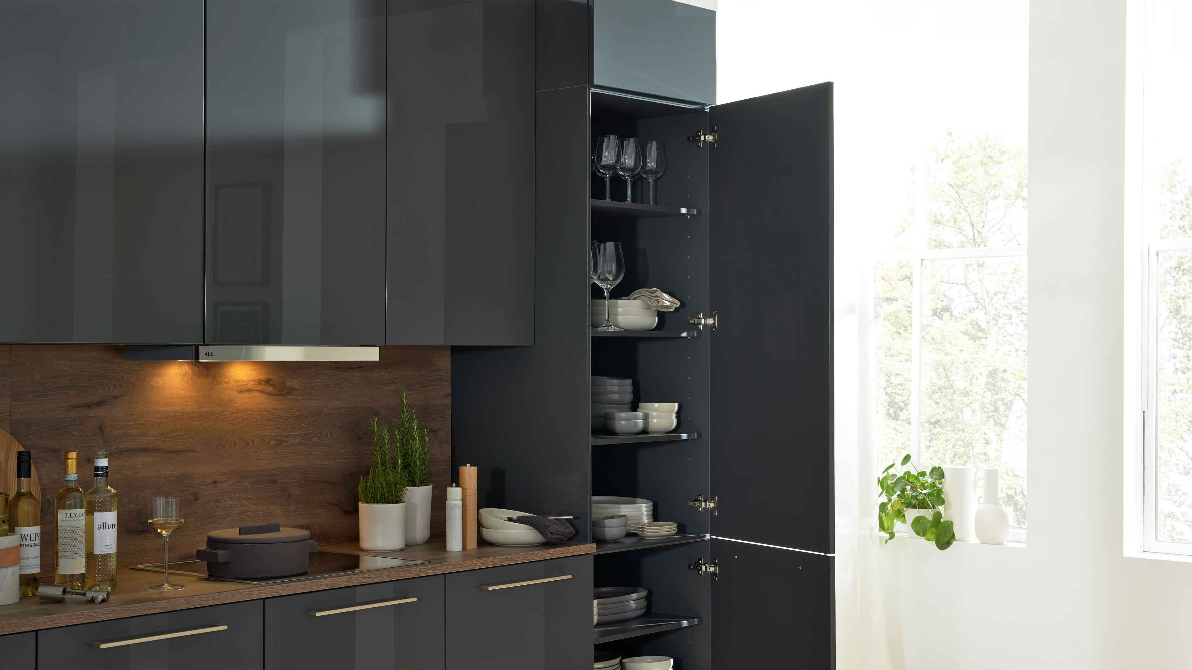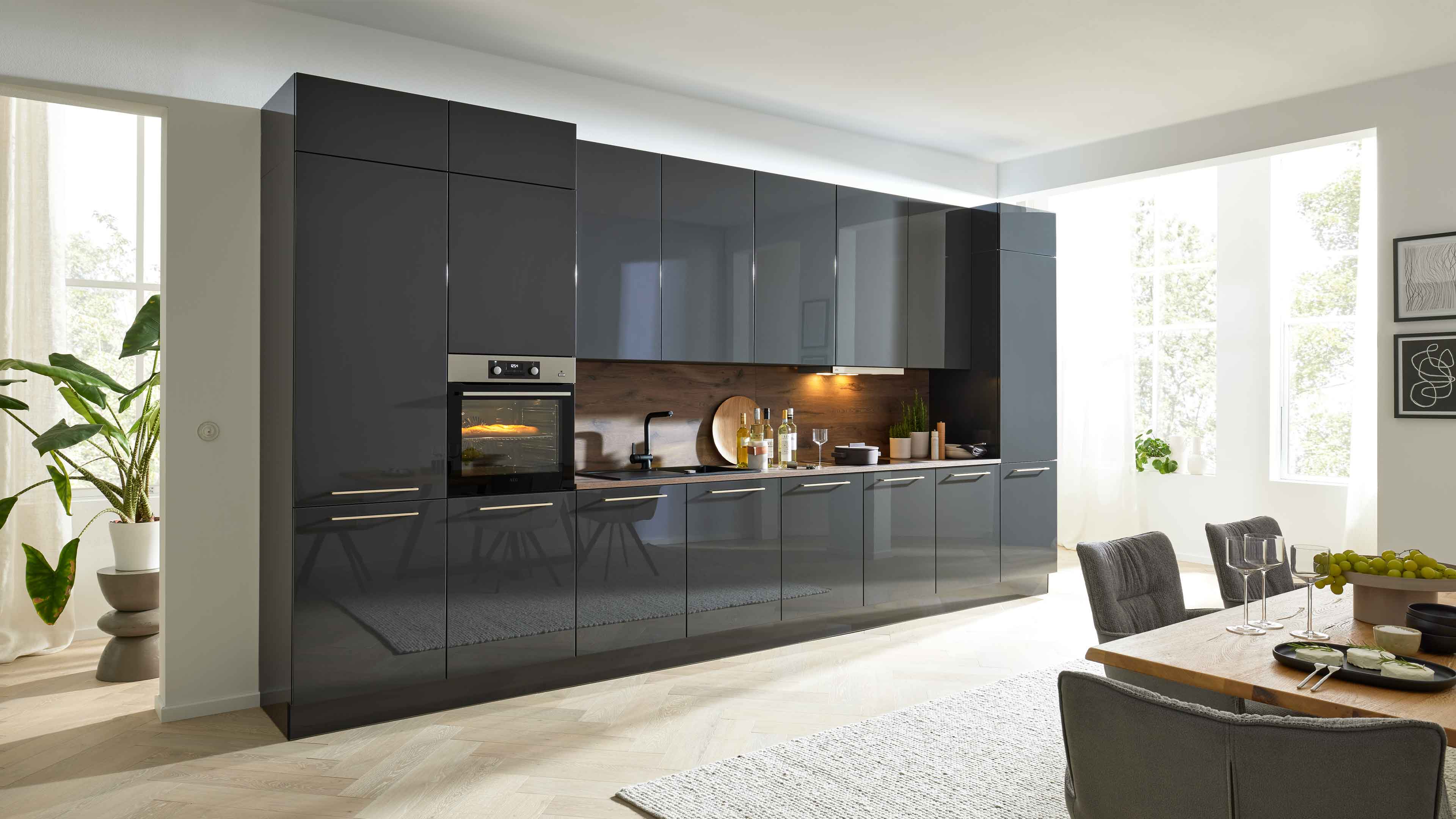 Interliving Küche Serie 3061 – moderne Hochglanzküche in Graphit mit AEG-Einbaugeräten
