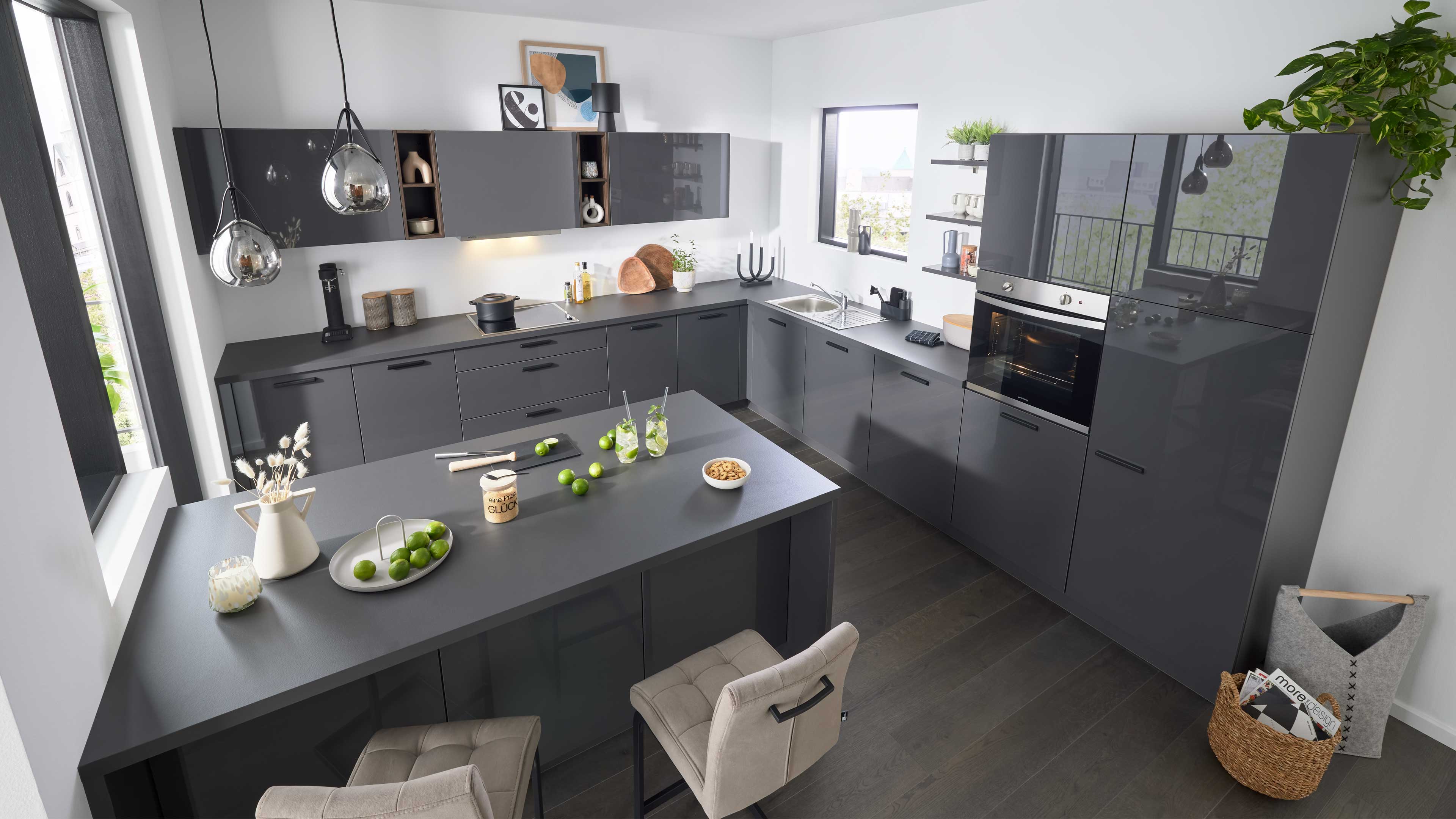 Hochglanzküche in Anthrazit mit Sitztheke und modernem Stauraumkonzept