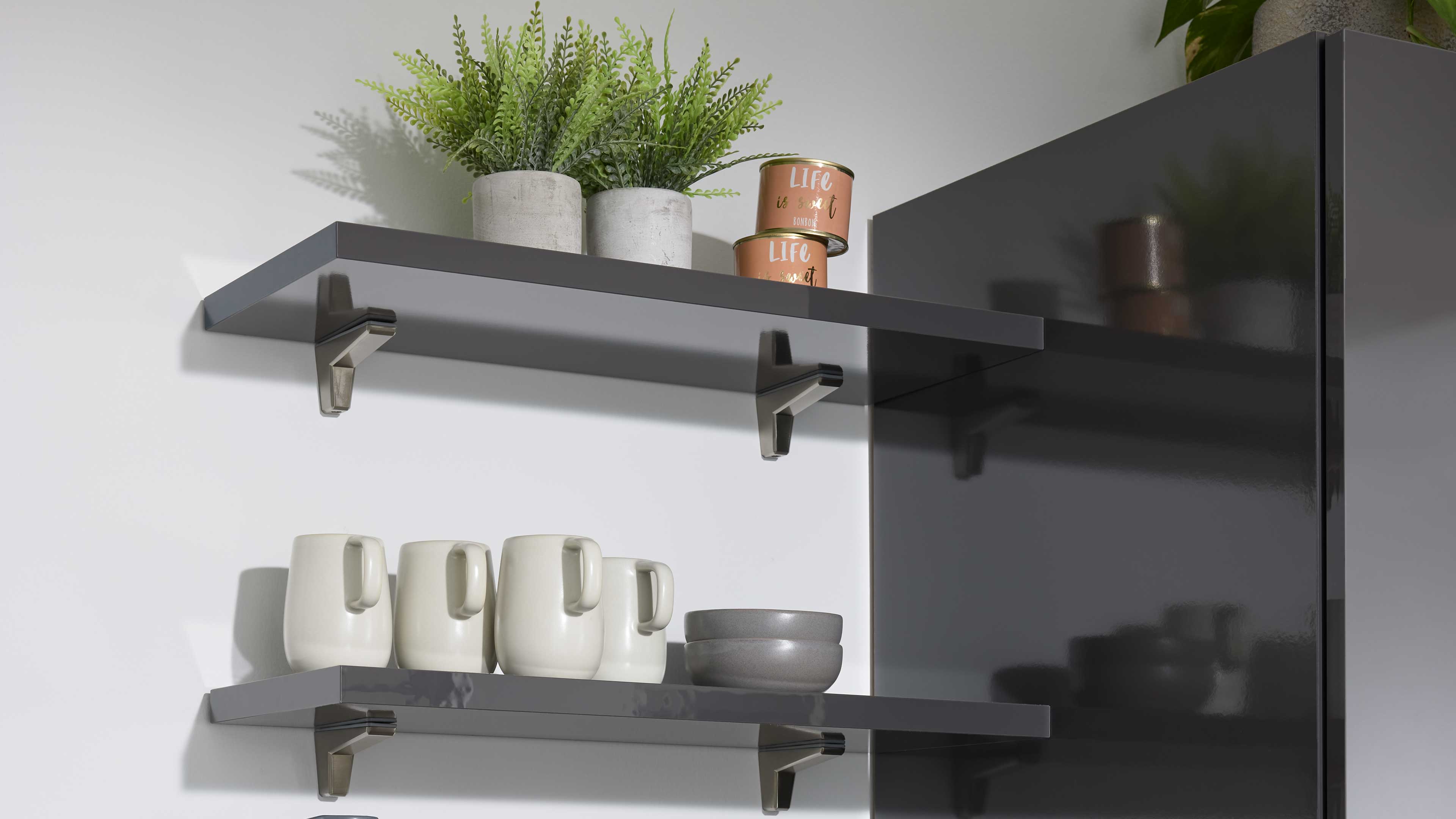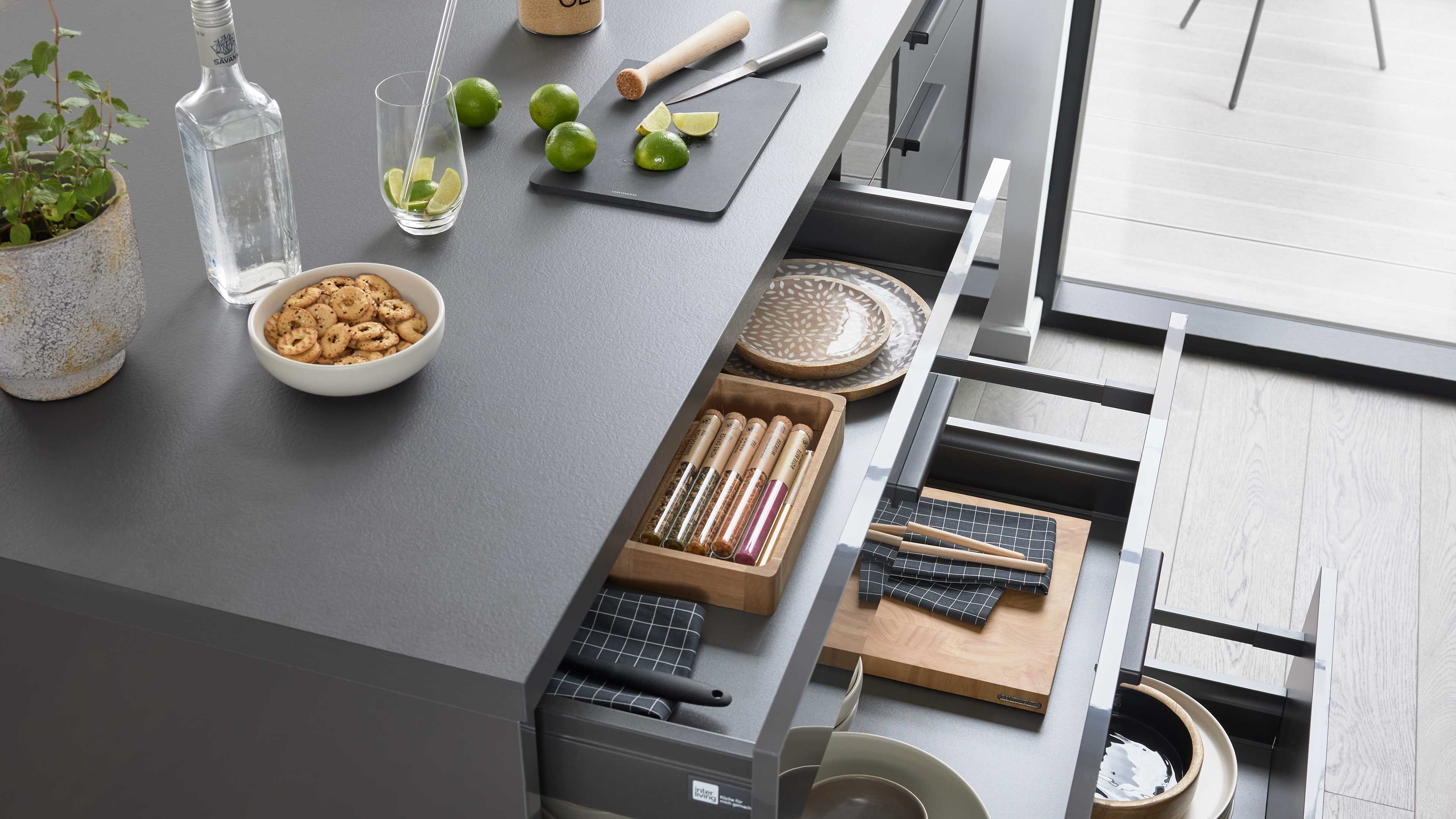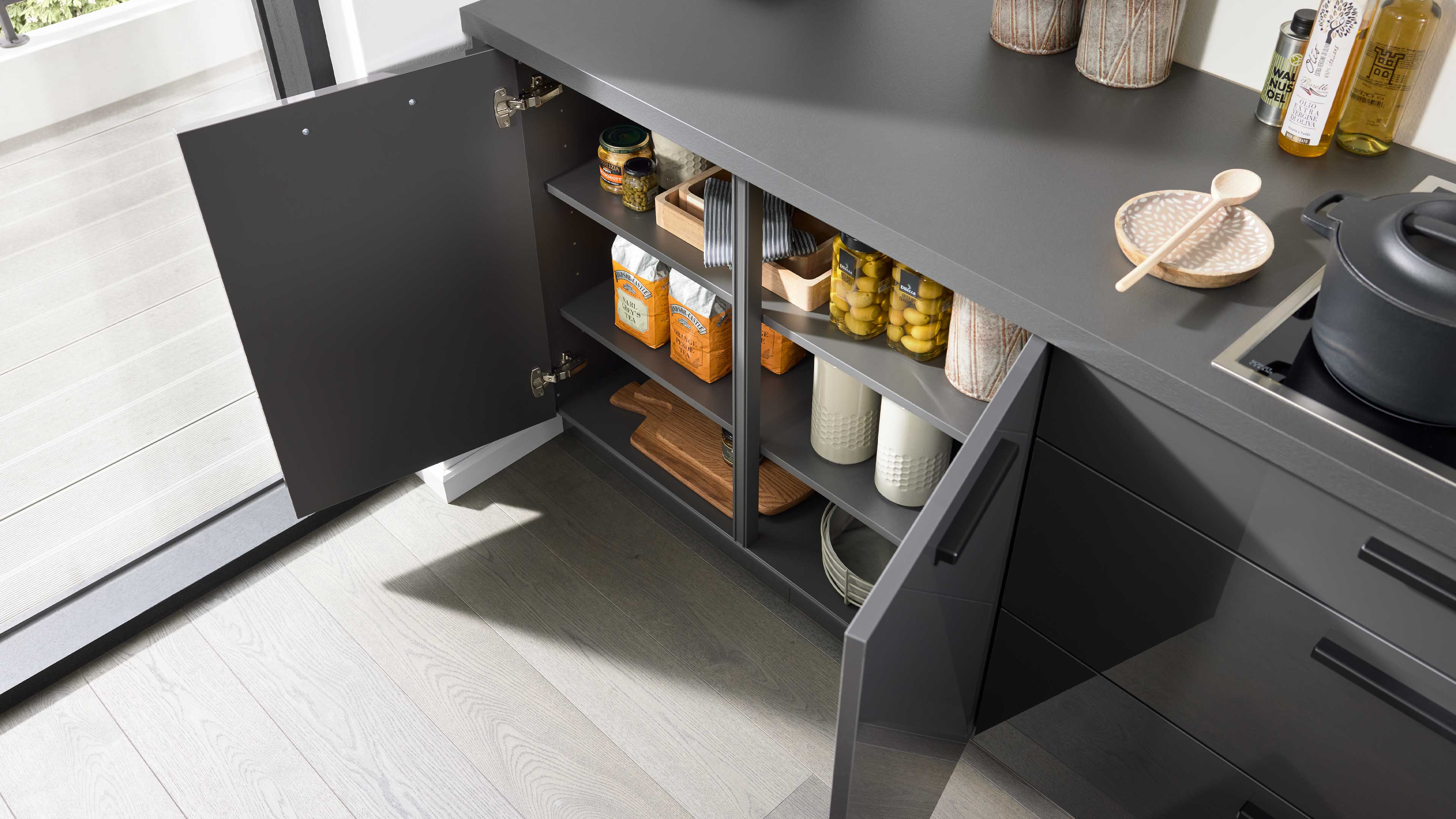 Die Interliving Küche Serie 3068 setzt auf ein edles Farbkonzept: graphitfarbene Lacklaminat-Hochglanzfronten, dazu passende Korpusse, Arbeitsplatten und Sockelblenden – alles Ton in Ton. Schwarze Griffe runden das Erscheinungsbild harmonisch ab und verleihen der Küche eine elegante, zeitlose Ausstrahlung.