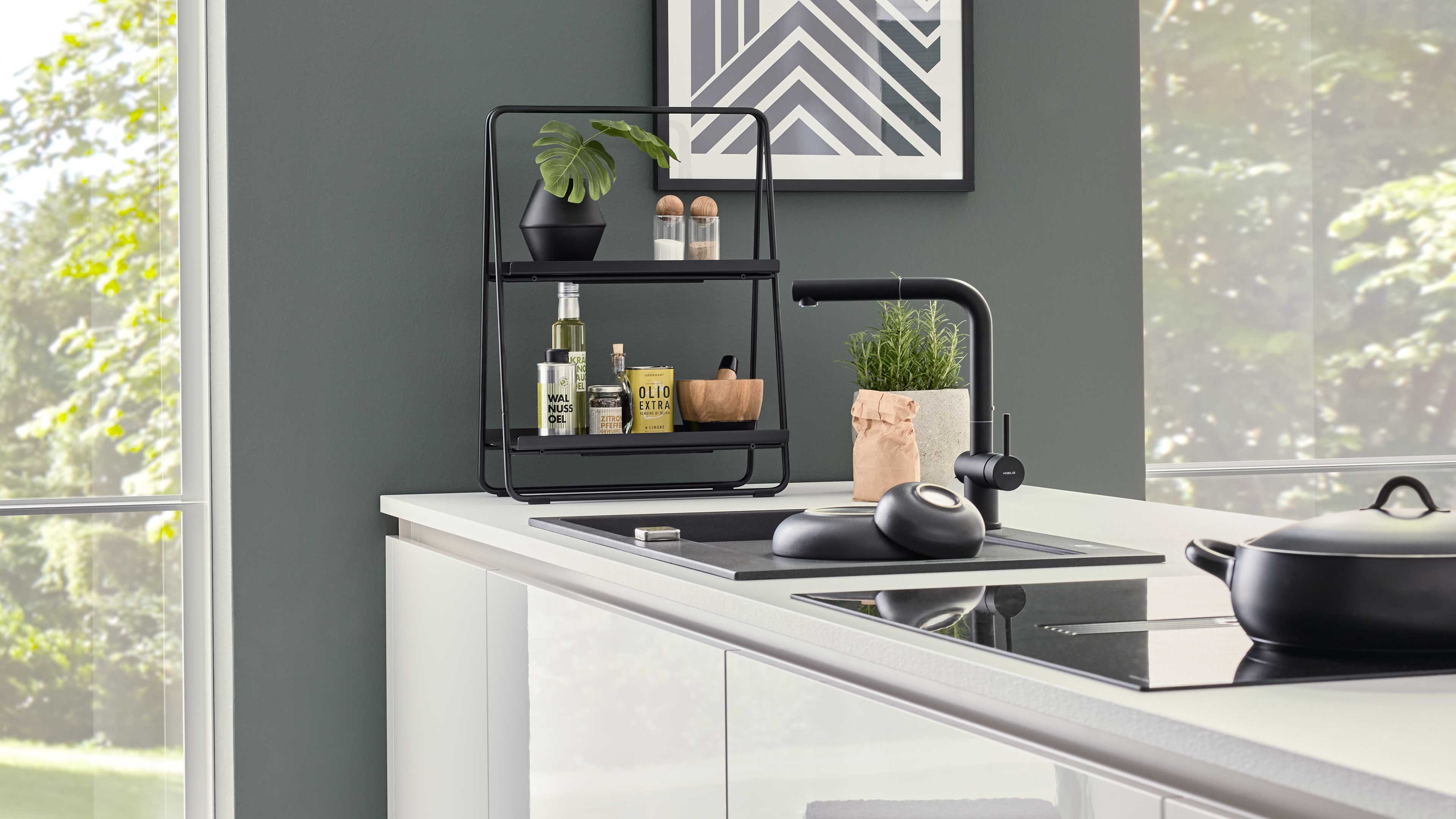 Zur Ausstattung gehören mehrere leistungsstarke Geräte von AEG, die modernes Kochen besonders komfortabel machen. Dazu zählen der Kühlschrank SD124ES mit der Energieeffizienzklasse E (Spektrum A bis G), der Steambake-Backofen BD31M mit einer Breite von ca. 60 cm und der Energieeffizienzklasse A (Spektrum A+++ bis D) sowie der TermaCook Muldenlüfter ML80-STYLO-U mit der Energieeffizienzklasse A+ (Spektrum A+++ bis D). Ergänzt wird das Ganze durch eine mattschwarze Einbauspüle samt passender Einhebel-Mischbatterie. Optional kannst du die Küche gegen Mehrpreis um einen leistungsstarken Geschirrspüler erweitern.