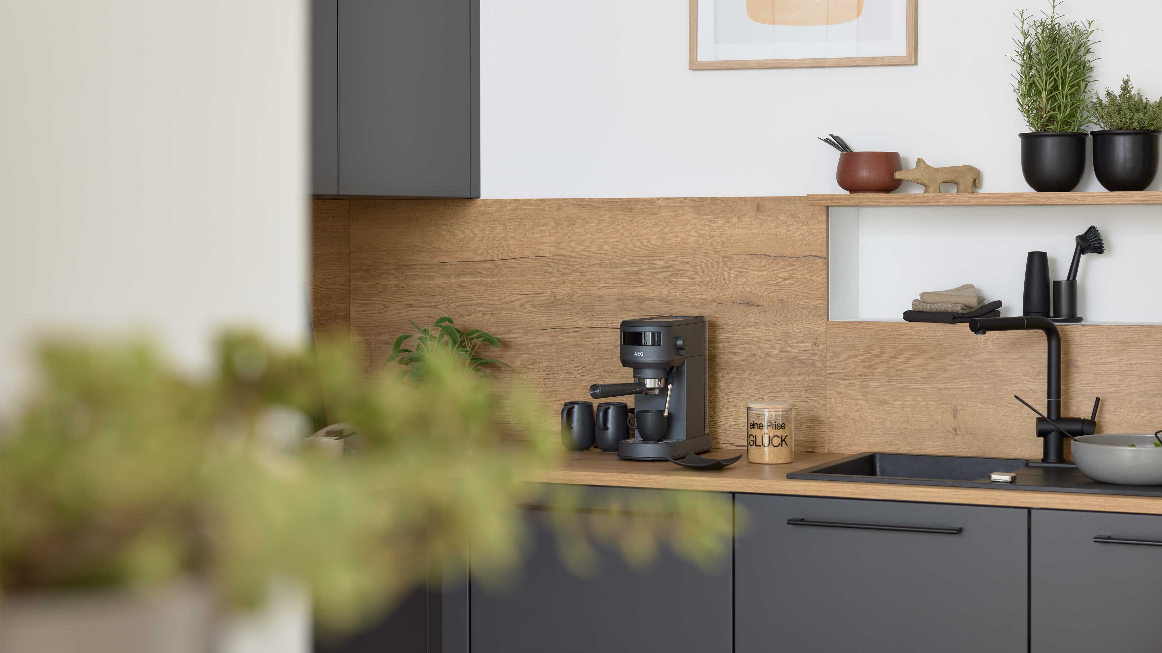 Moderne L-Küche in Anthrazit mit Holzarbeitsplatte und offenen Regalen