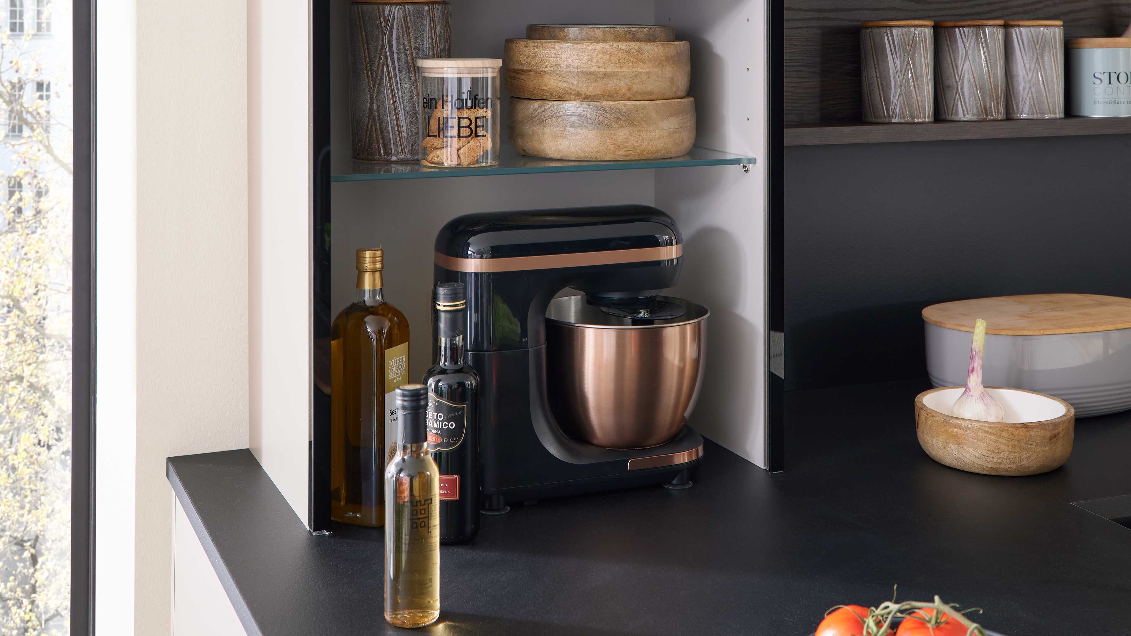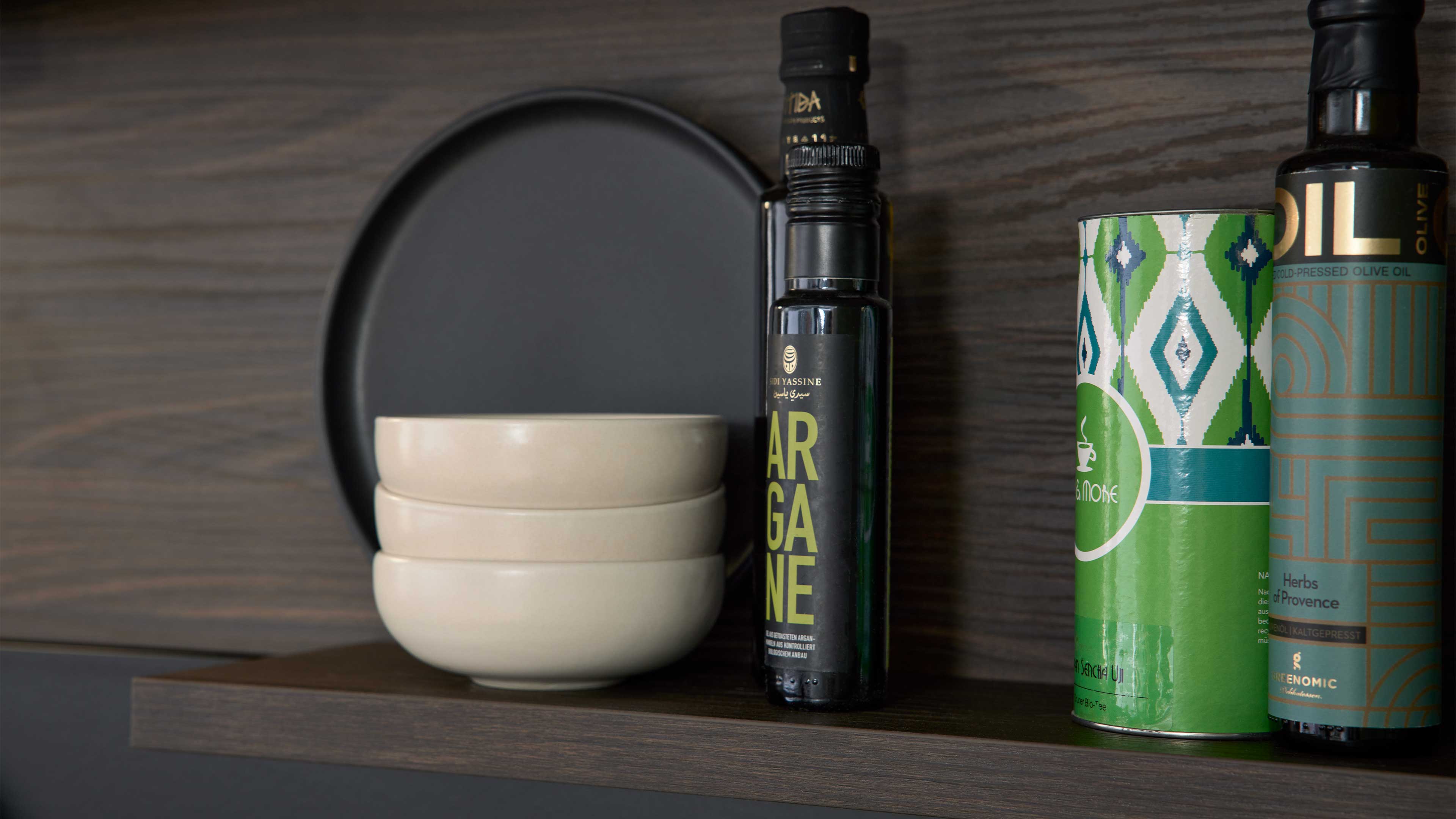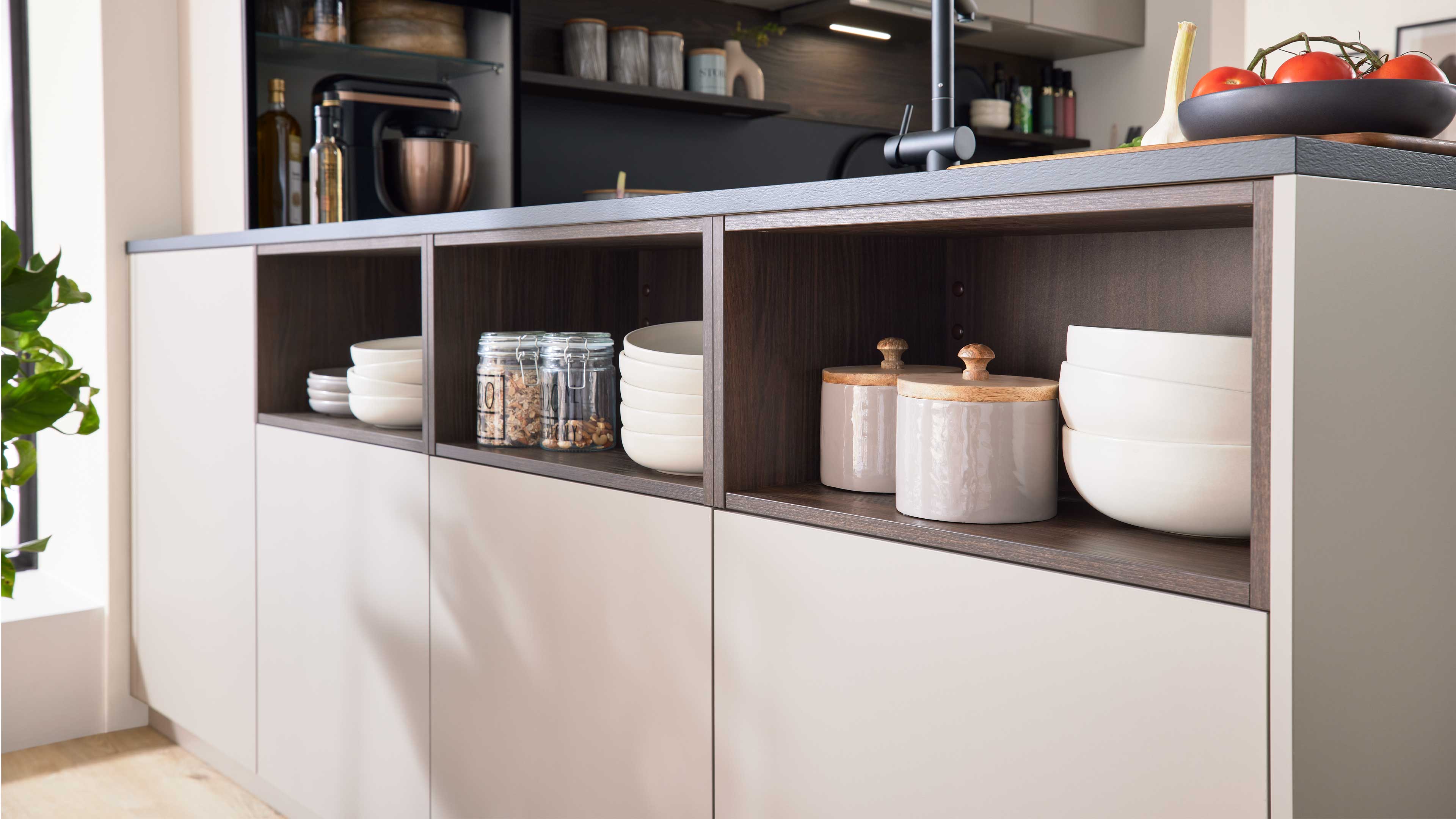 Die Interliving Küche Serie 3072 ist mehr als nur ein Ort zum Kochen – sie ist ein Raum voller Wohnlichkeit, Design und Genuss. Die Kombination aus softmattem Lava und warmer Nussbaum-Kuba-Nachbildung schafft ein stilvolles Ambiente, das zum Verweilen einlädt. Schwarze Arbeitsplatten und grifflos gestaltete Fronten unterstreichen den puristischen Charakter der Küche und machen sie zu einem echten Blickfang.