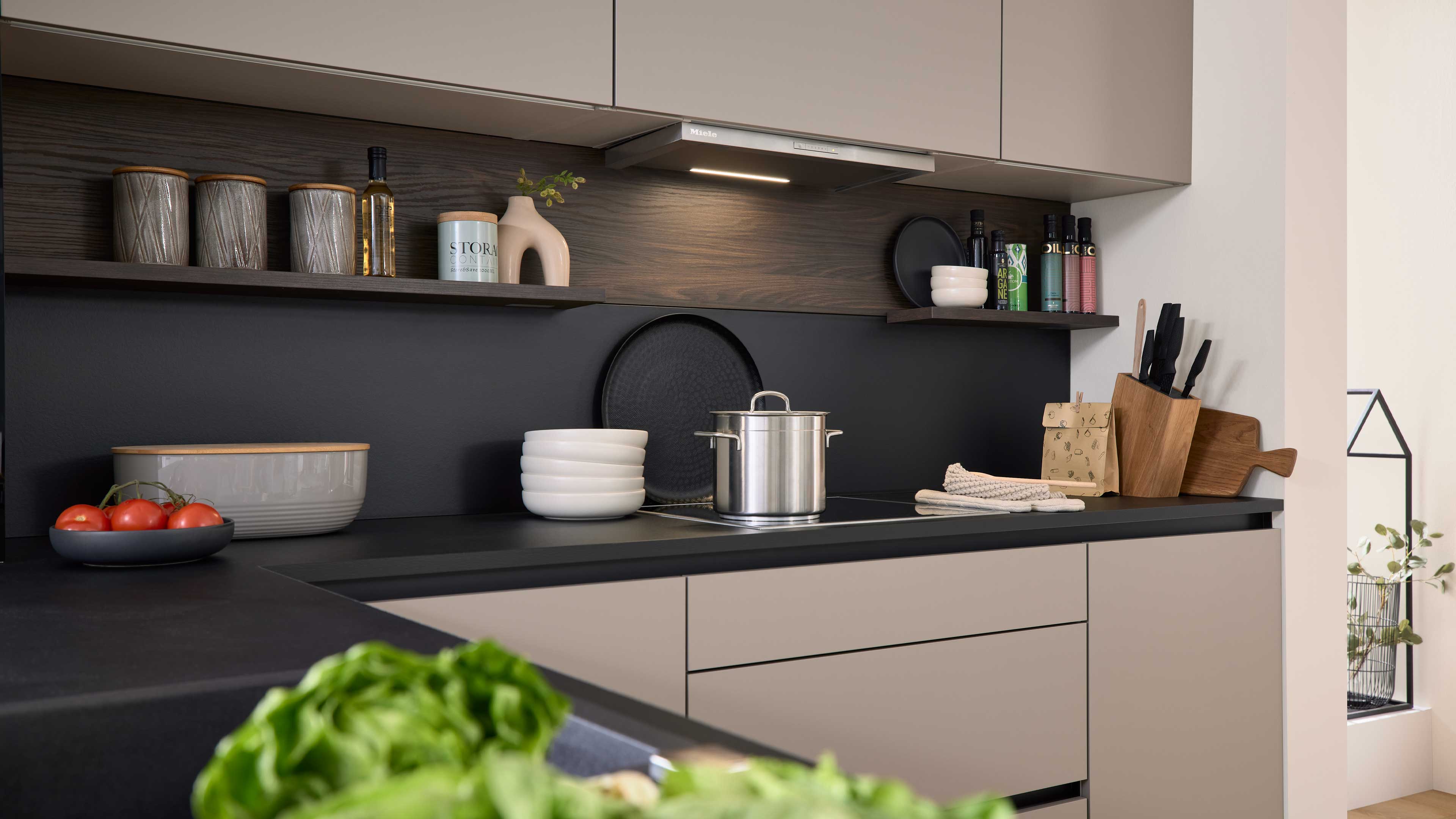 Moderne Küche in dunklem Beige mit schwarzen Akzenten