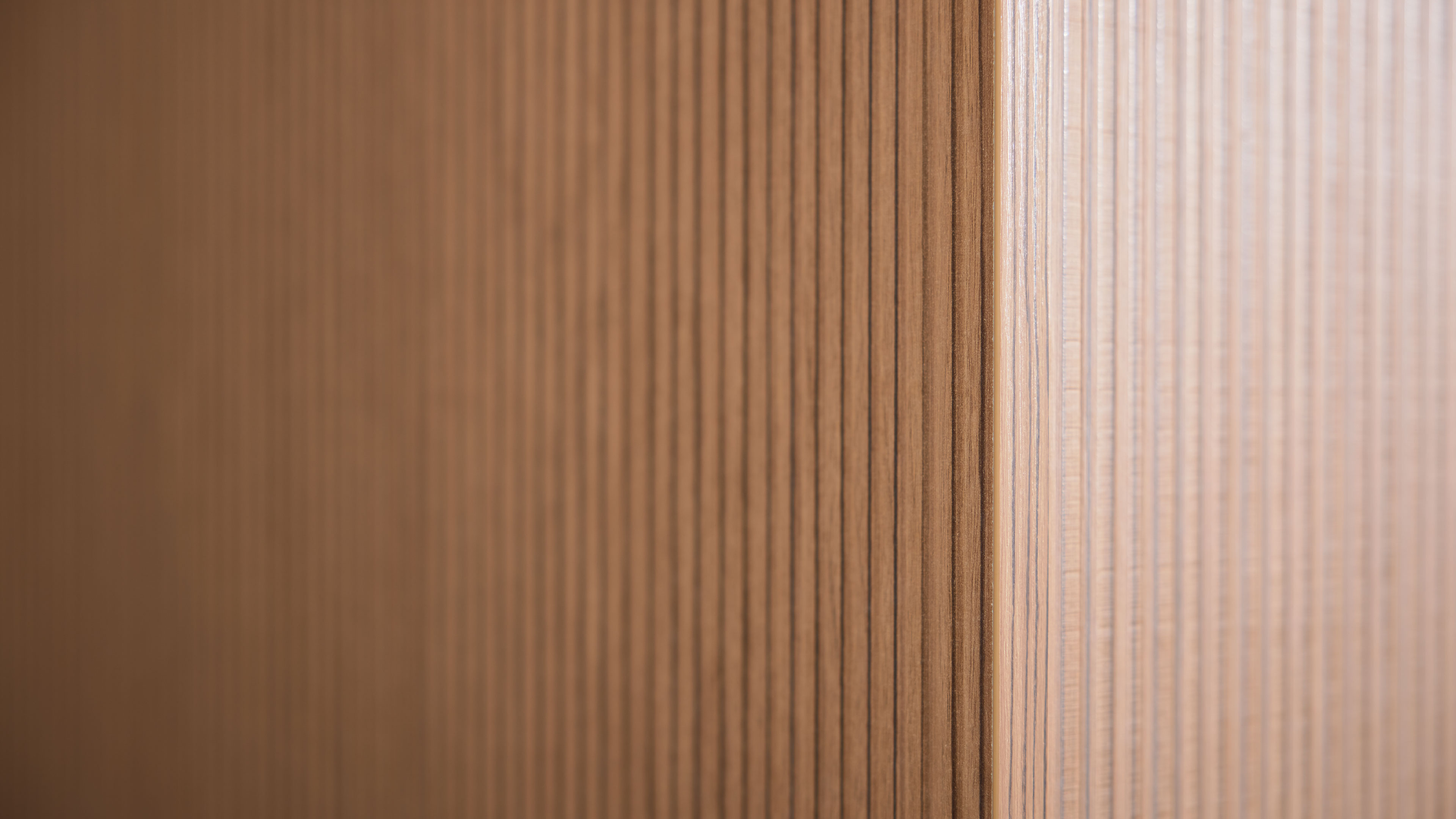 Moderne Designküche in Weiß mit Holzfronten in Lamellenoptik und Kochinsel