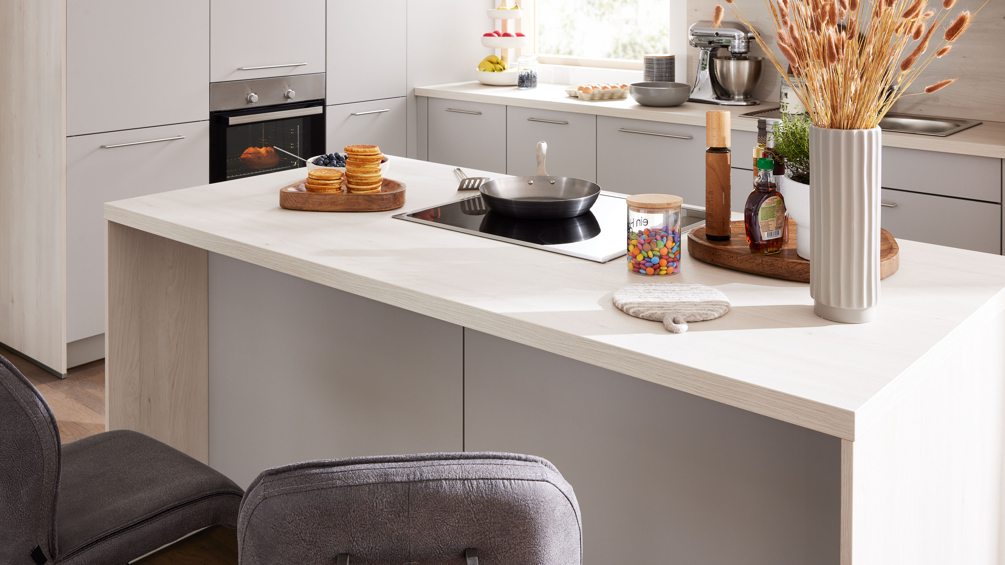 Die Interliving Küche Serie 3077 ist die perfekte Wahl, wenn du eine zeitlose, stilvolle Planküche suchst, die Funktionalität und Design harmonisch verbindet. Platingraue Fronten verleihen der Küche eine elegante Klarheit, während Akzente in Kiruna Birke Holznachbildung für eine wohnliche, natürliche Note sorgen. Die Mischung aus klaren Bügelgriffen und grifflosen Elementen mit Lifttüren setzt optische Highlights und bringt eine puristische Leichtigkeit ins Raumkonzept.