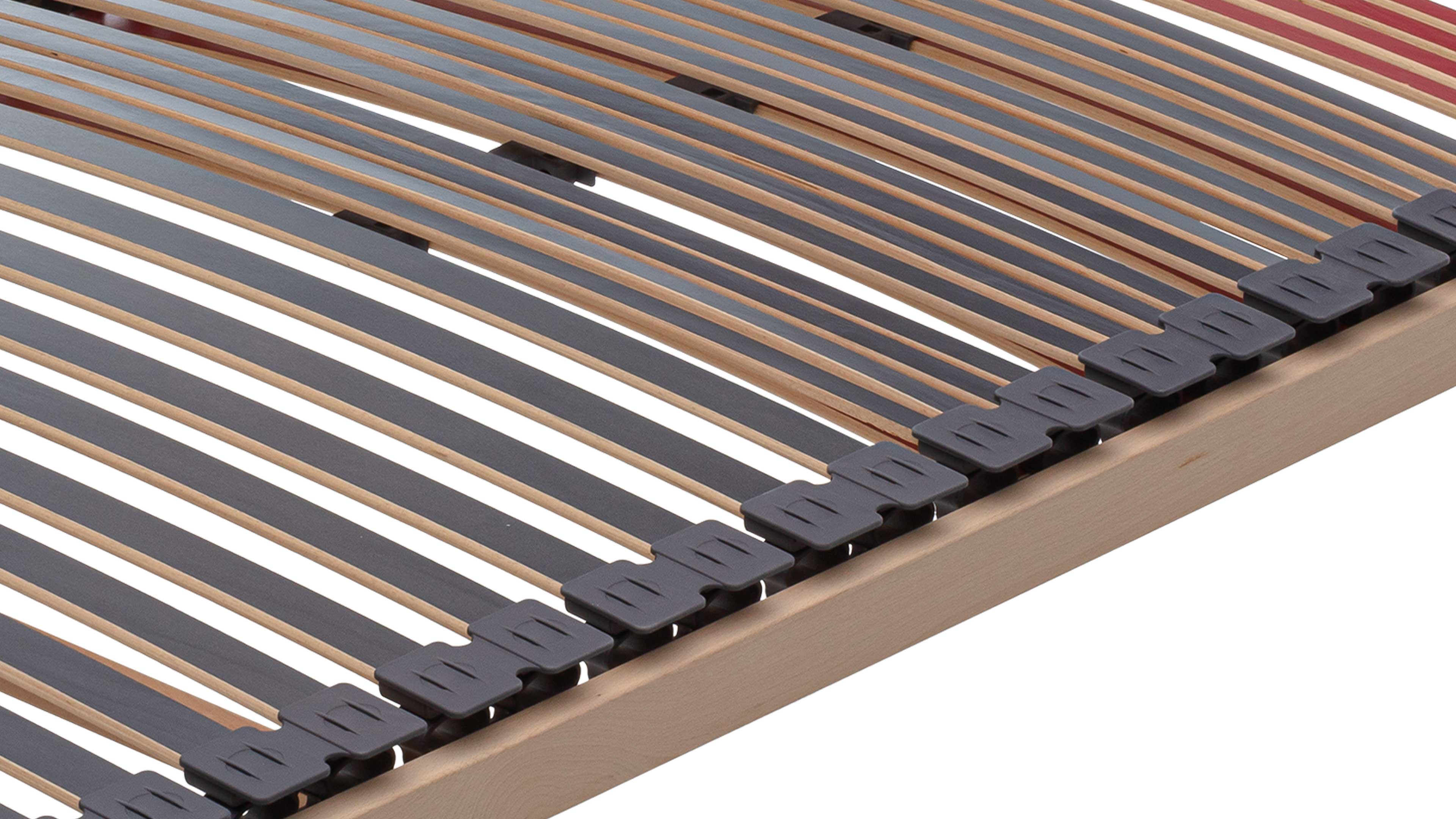 Der Rahmen besteht aus massivem, naturbelassenem Buchenholz, das besonders robust, formstabil und langlebig ist. Mit einer Rahmenhöhe von ca. 50 mm und einer Stärke von ca. 22 mm überzeugt der Lattenrost durch eine solide Bauweise und hohe Tragkraft. Für eine ideale Körperanpassung kommen zwei Leistentypen zum Einsatz: 13 breite, 5-fach verleimte Premium-Federleisten aus Buchenholz gewährleisten eine gleichmäßige Gewichtsverteilung und bieten auch bei höherer Belastung bis ca. 130 kg zuverlässigen Halt. Ergänzt werden sie durch 28 schmale, hochelastische Federleisten im Schulter-, Lordose- und Beckenbereich, die eine besonders präzise Anpassung an die Körperkonturen ermöglichen. Eine stabile Endleiste rundet die Konstruktion ab und sorgt für eine gleichmäßige Auflagefläche der Matratze.