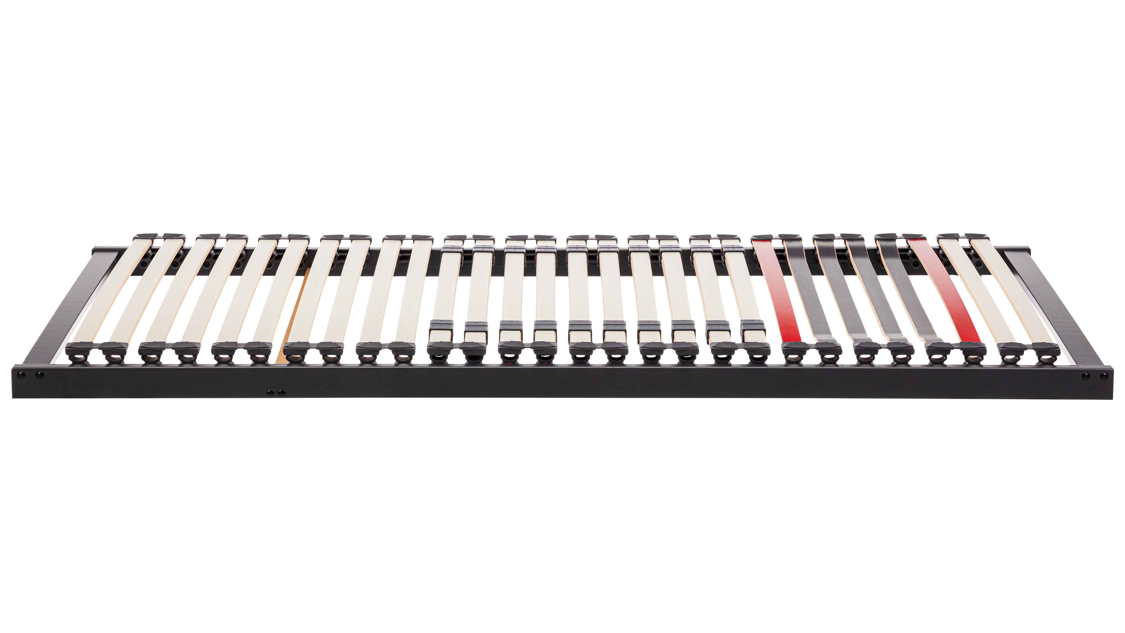 Die elastischen Federleisten sind in überstehenden, äußerst robusten Hightech-Kappen gelagert. Ergänzt wird die stabile Konstruktion durch verstärkte Querleisten mit Winkelsicherung und hochfeste Gelenkschrauben. Diese Kombination sorgt für außergewöhnliche Stabilität – auch bei hoher und dauerhafter Belastung.