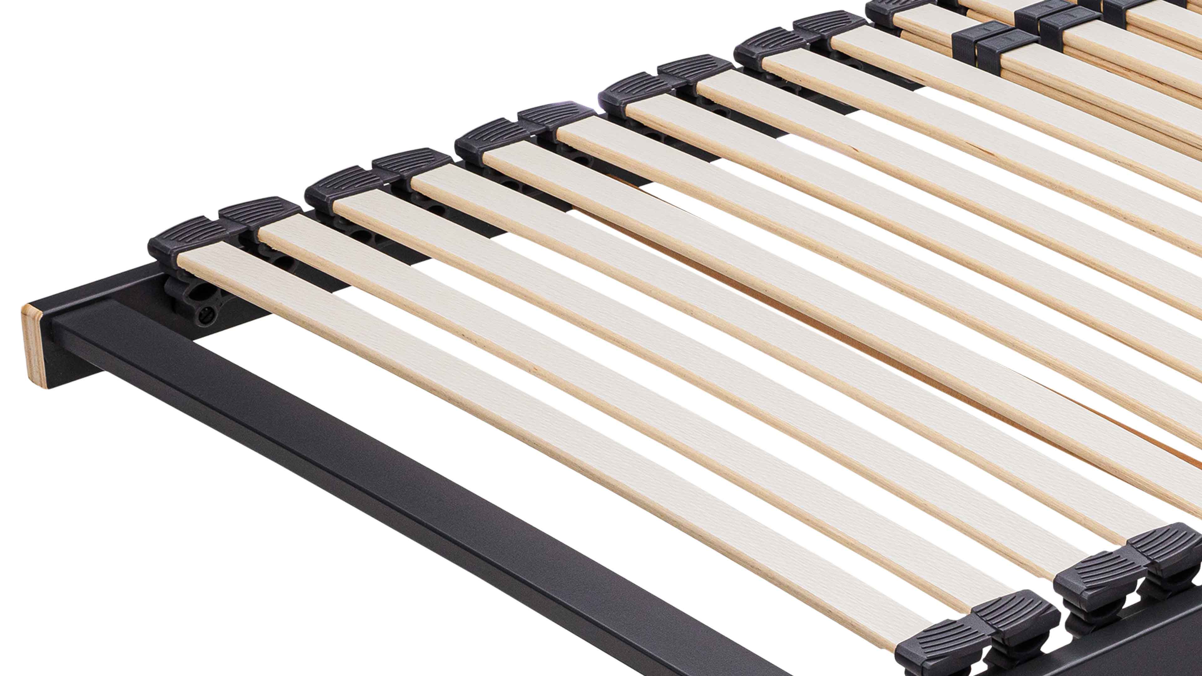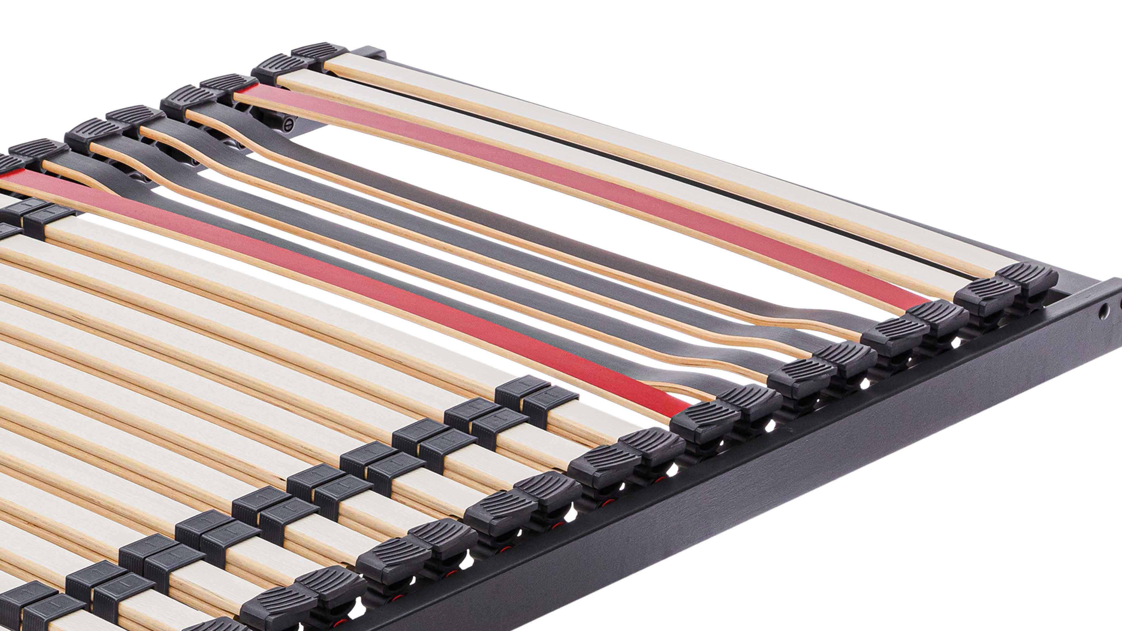 Der anthrazitfarbene Außenrahmen aus folienummanteltem Buchenschichtholz sorgt für höchste Stabilität und Langlebigkeit. Insgesamt 28 Federholzleisten – davon 22 weiß geprägte Leisten mit ca. 38 mm Breite und ca. 11 mm Stärke – garantieren eine gleichmäßige Druckverteilung und flexible Körperanpassung, auch bei der starren Variante.