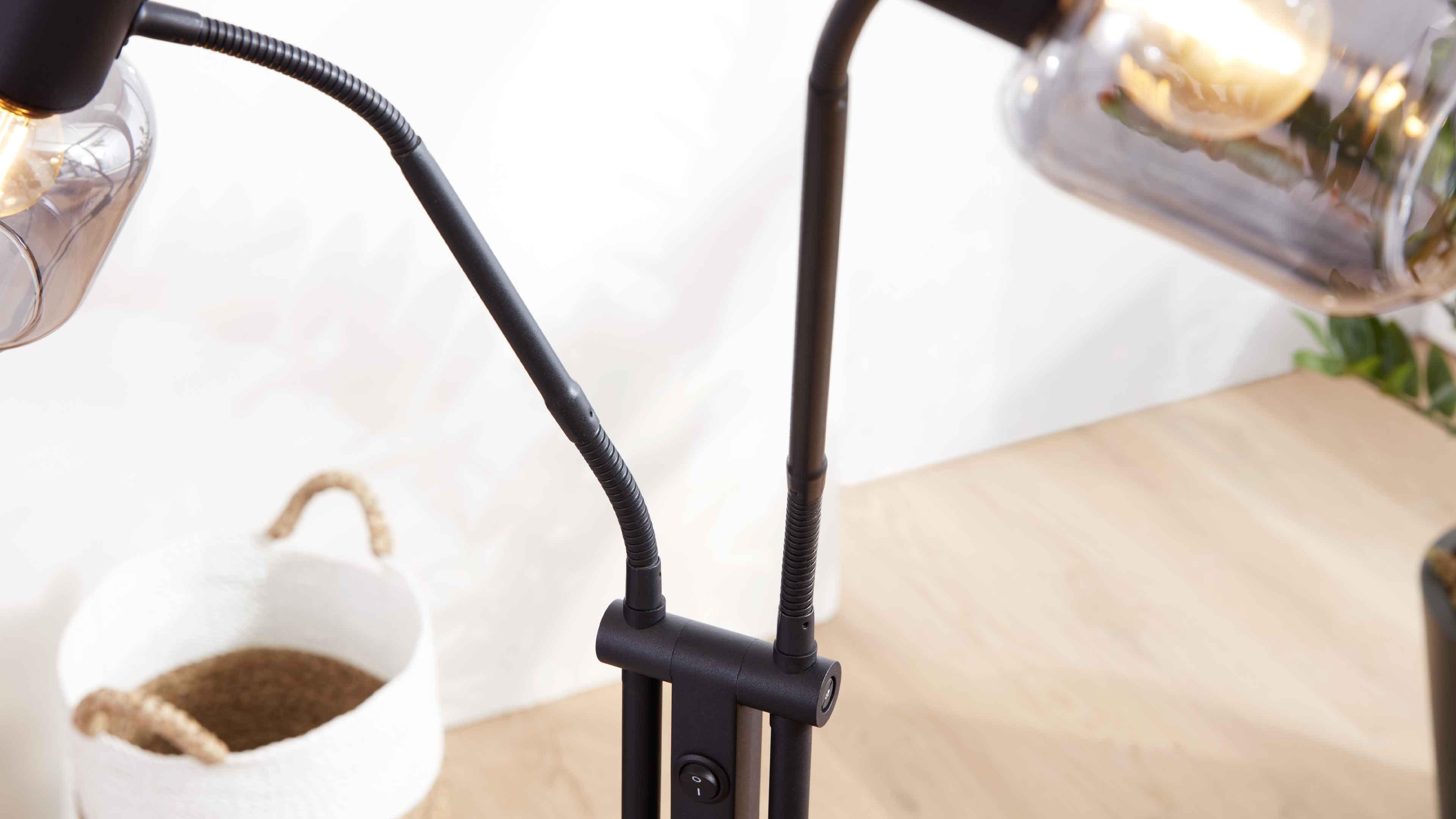 Stehleuchte mit schwarzem Metallgestell und zwei rauchgrauen Glas-Schirmen
