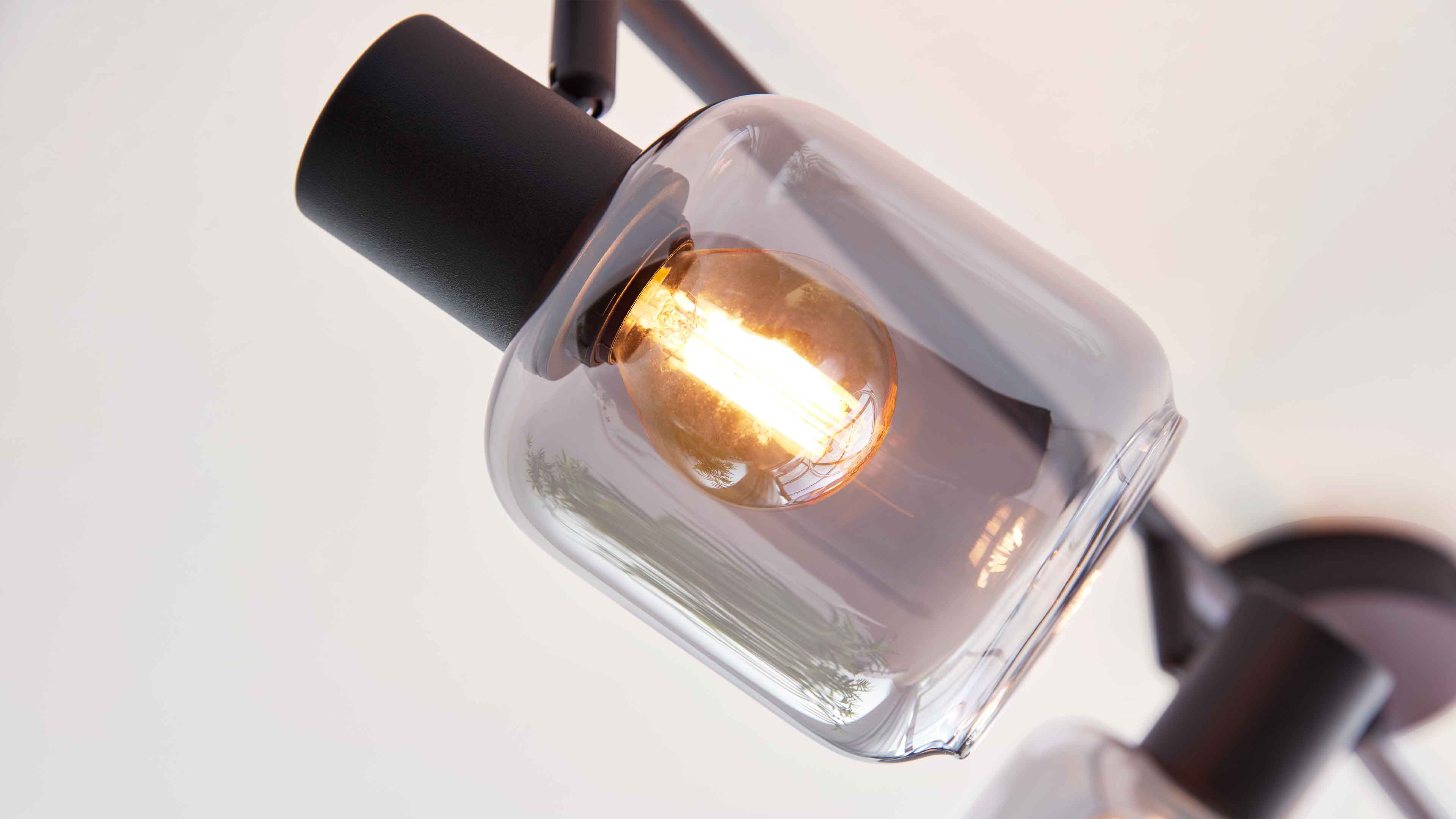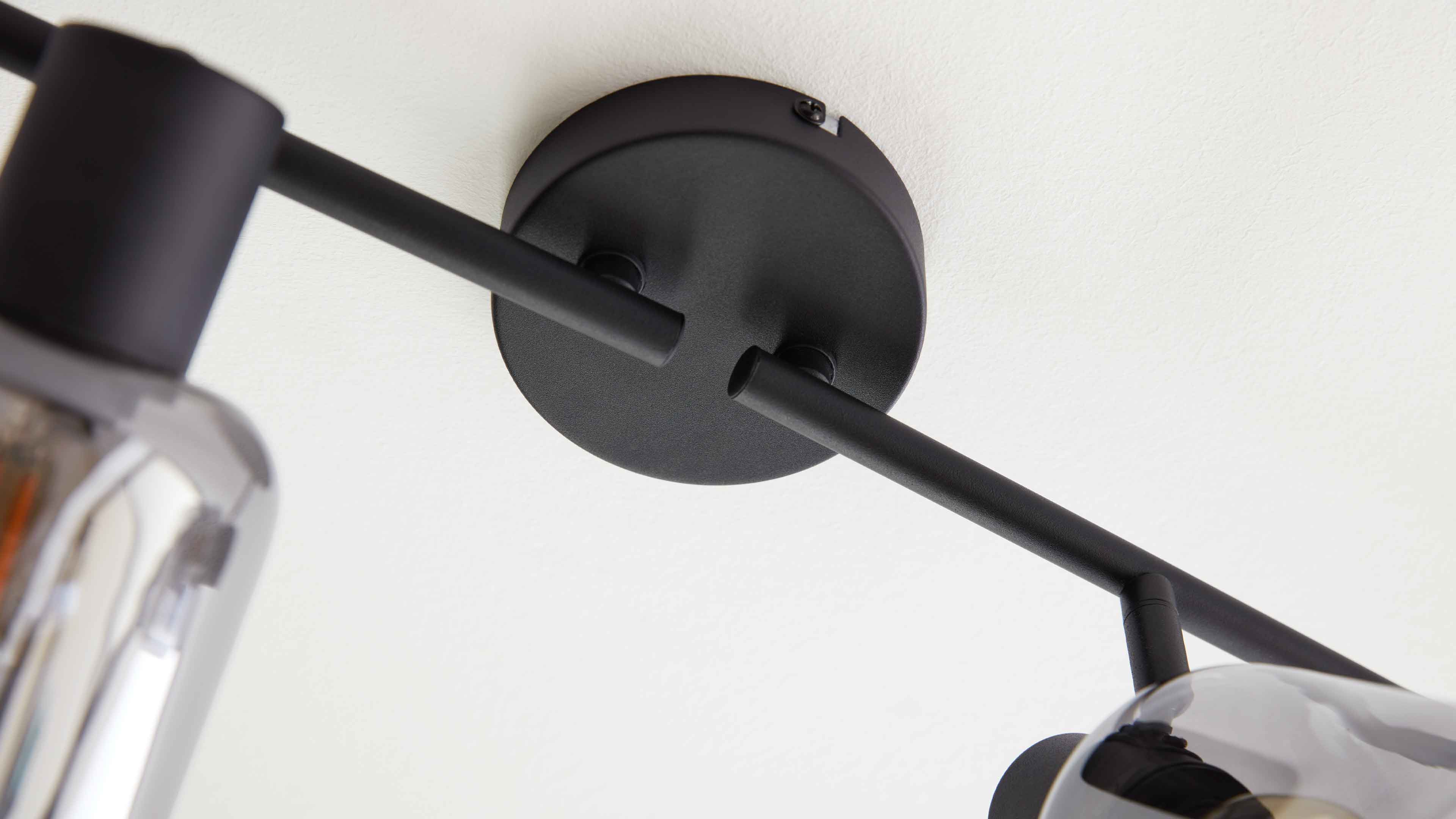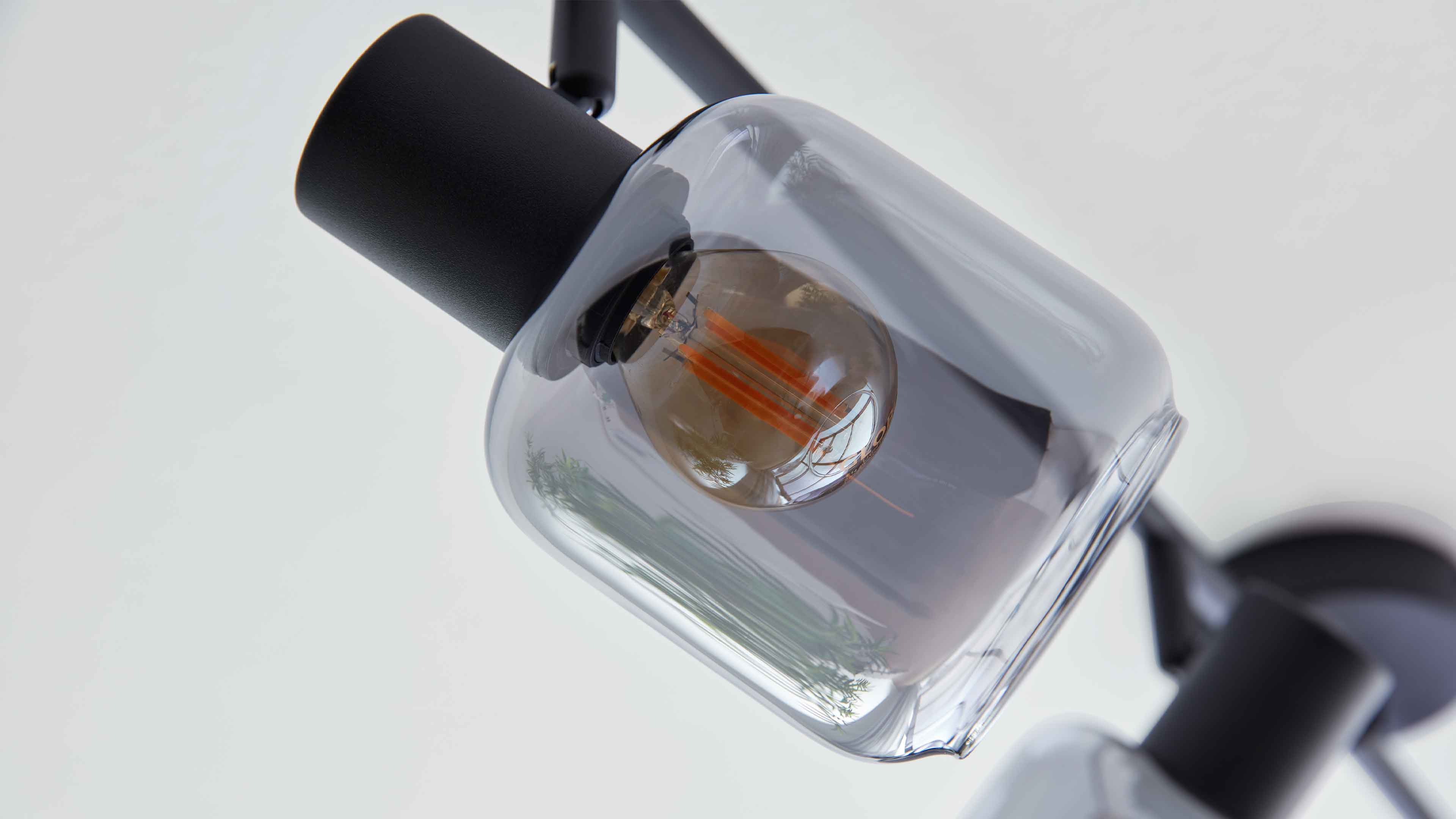 Deckenstrahler mit vier rauchgrauen Glaskugeln und schwarzen Fassungen