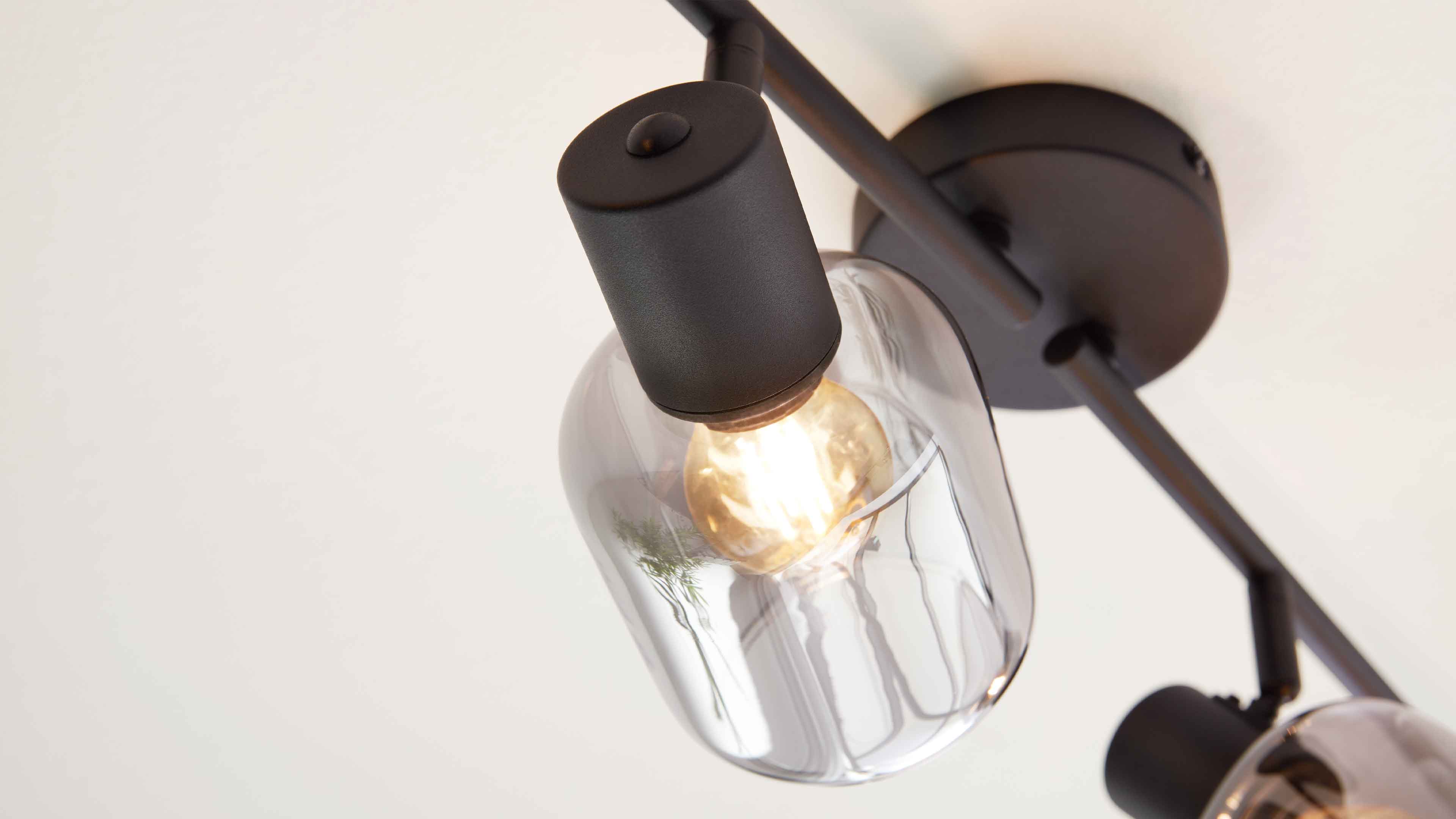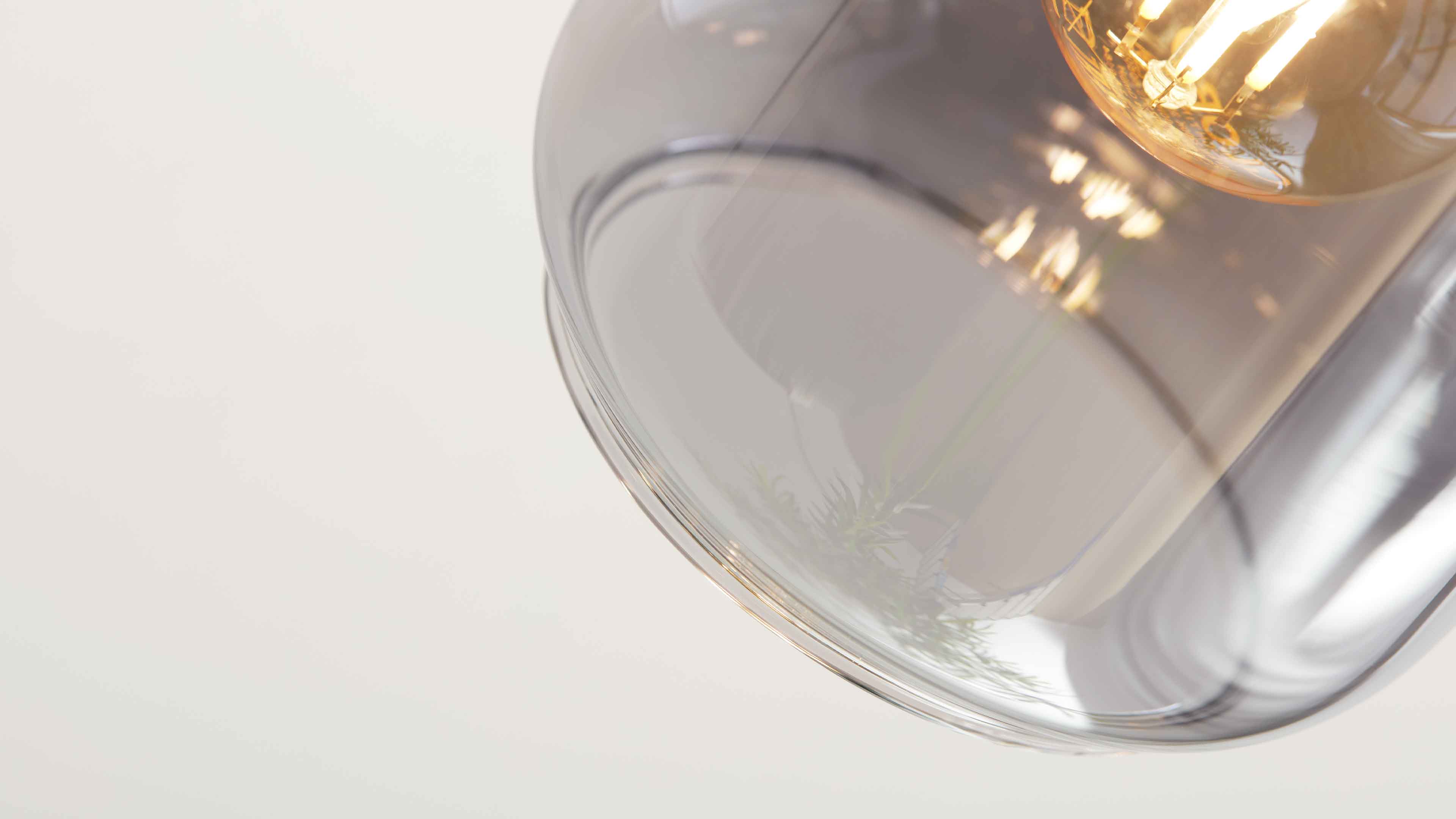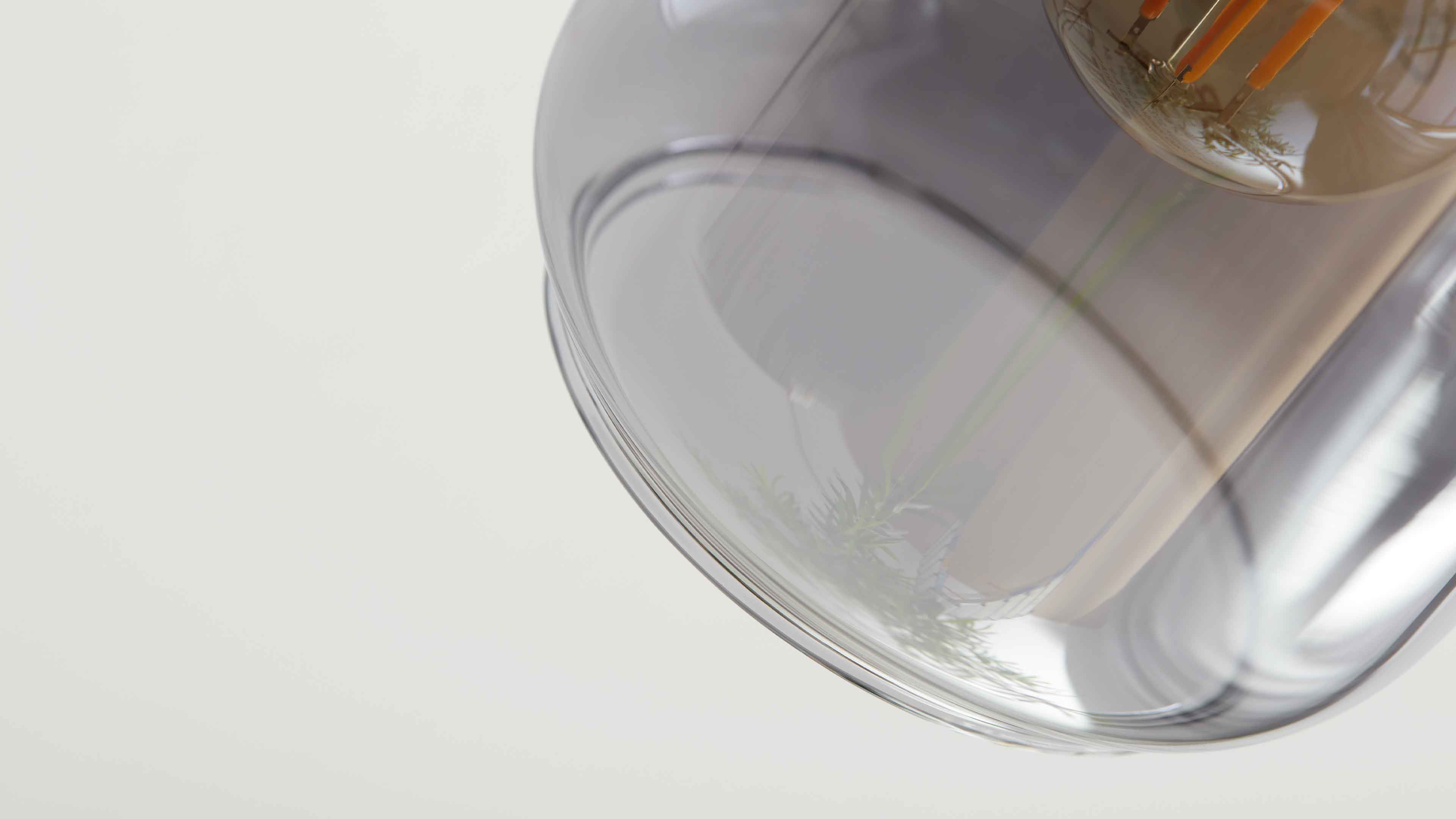 Deckenstrahler mit vier rauchgrauen Glaskugeln und schwarzen Fassungen
