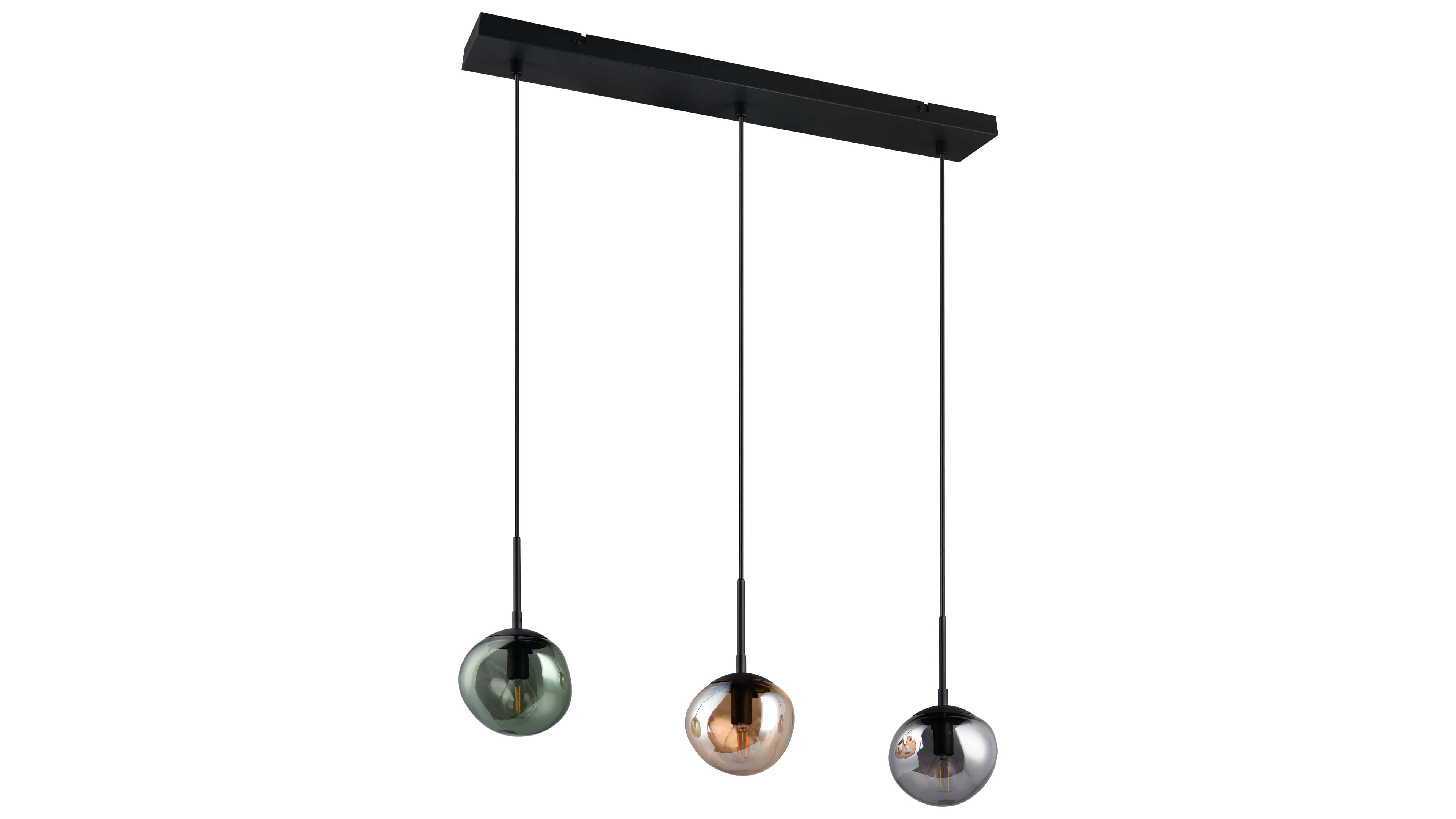 Dreiflammige Pendelleuchte mit Kugelschirmen aus Glas in Grün-, Bronze- und Rauchoptik
