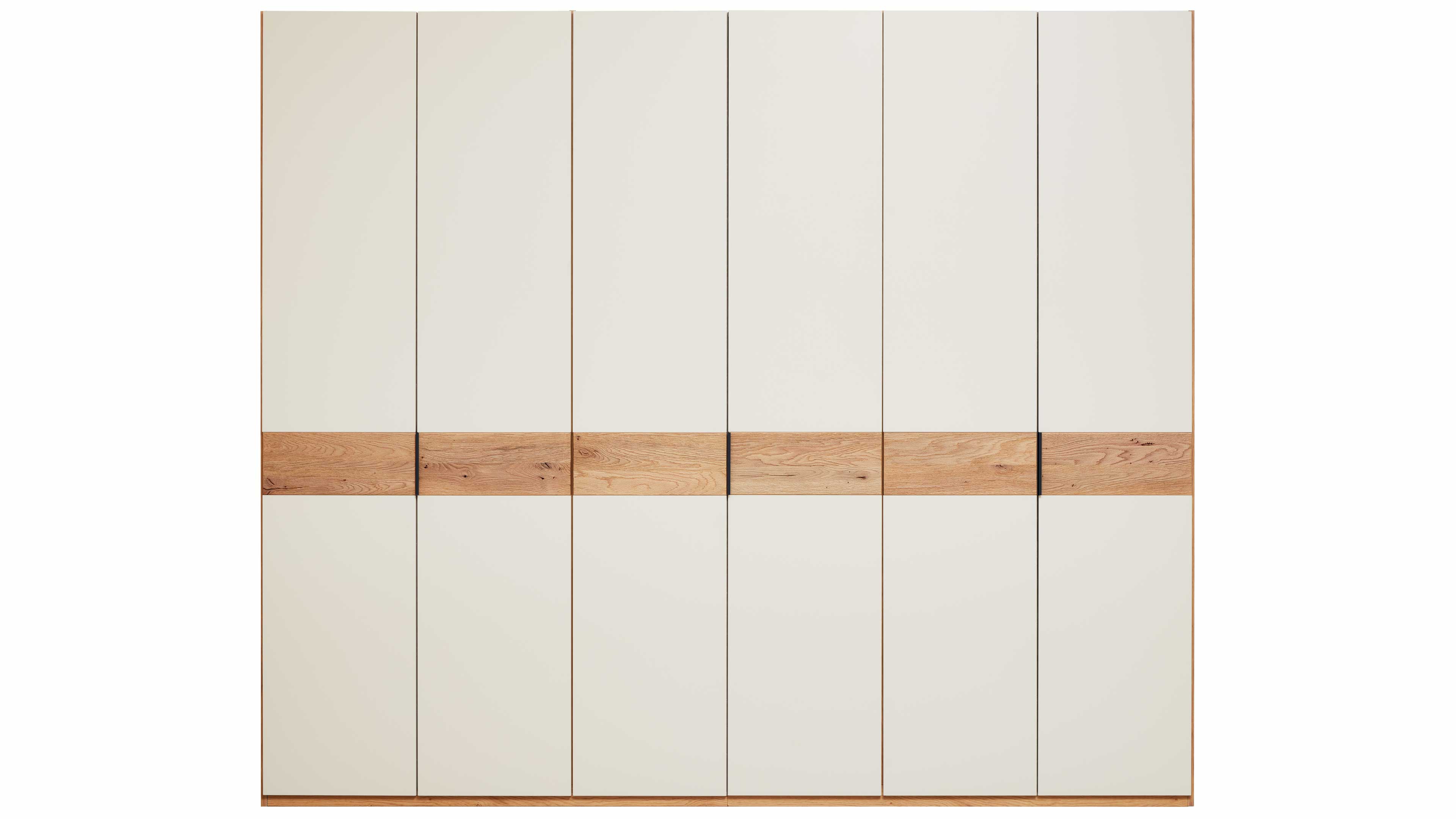 Drehtürenschrank in Weiß mit durchgehender Akzentleiste in Eiche-Optik