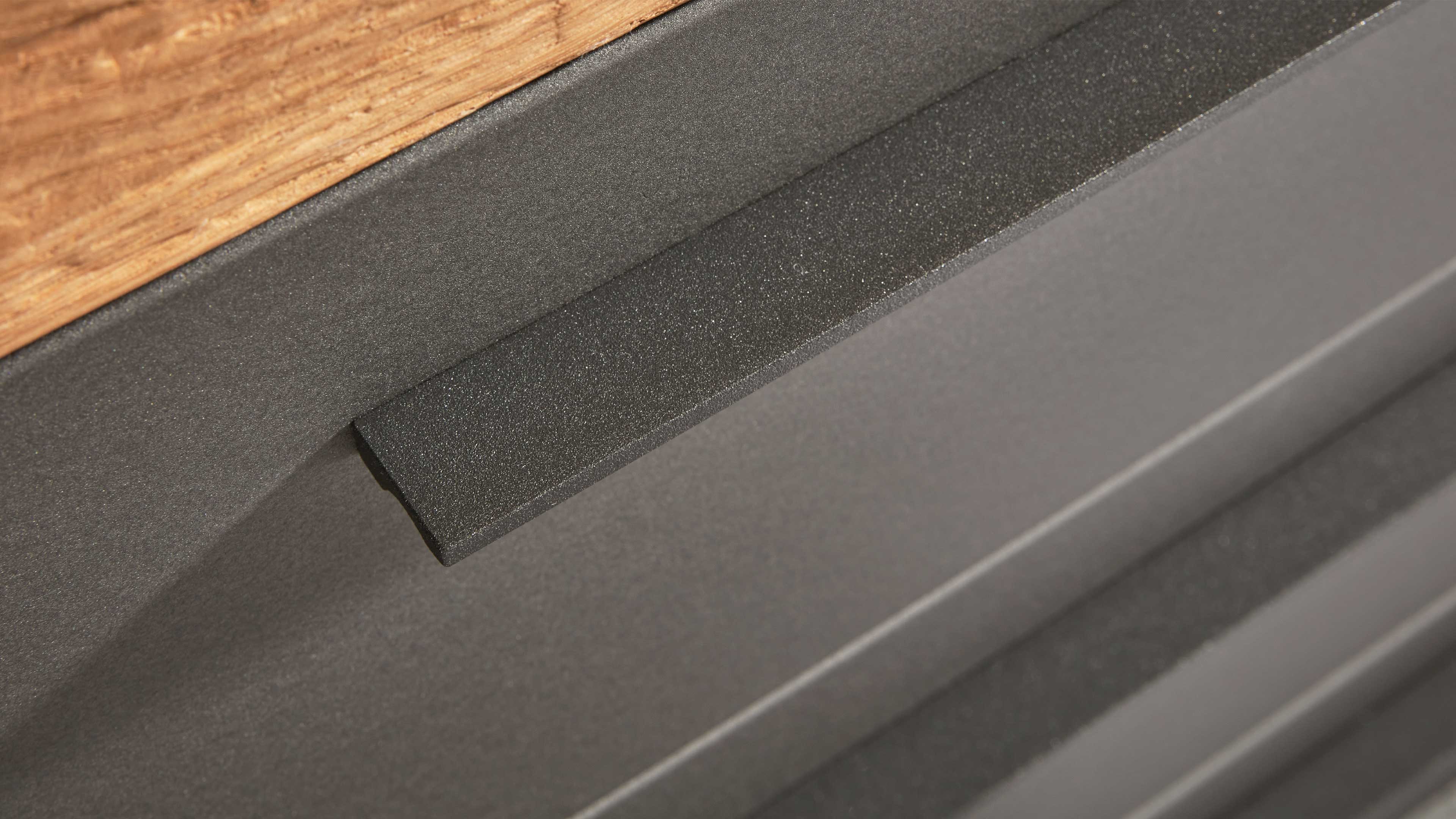 Die Stauraumkommode aus der Interliving Schlafzimmer Serie 1025 kombiniert graphitfarbenen Mattlack mit charaktervoller Balkeneiche gehackt – eine Verbindung, die deinem Schlafzimmer moderne Eleganz und natürlichen Charme verleiht. Graphitfarbene Metallgriffe mit Eisenglimmerlack setzen stilvolle Akzente, während die grifflosen Holzfronten mit push-to-open-Funktion für ein cleanes, zeitgemäßes Design sorgen.