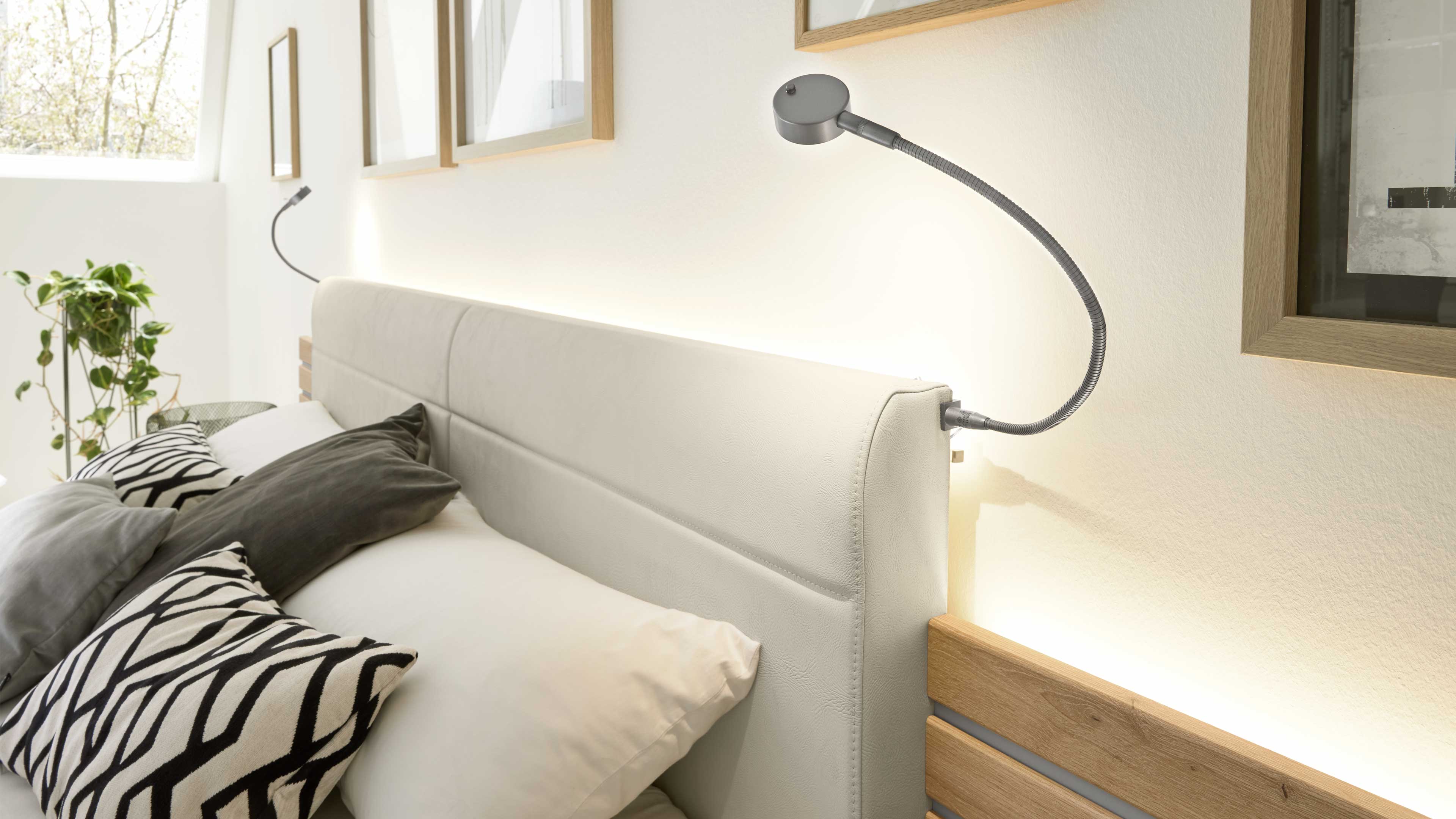 Zwei schieferfarbene Flexleuchten (Typ 341100) aus Metall mit fest verbauten, energieeffizienten LED-Leuchtmitteln (Energieeffizienzklasse G) bieten punktgenaue Ausleuchtung zum Lesen – bequem steuerbar über einen Druckschalter an der Oberseite.
