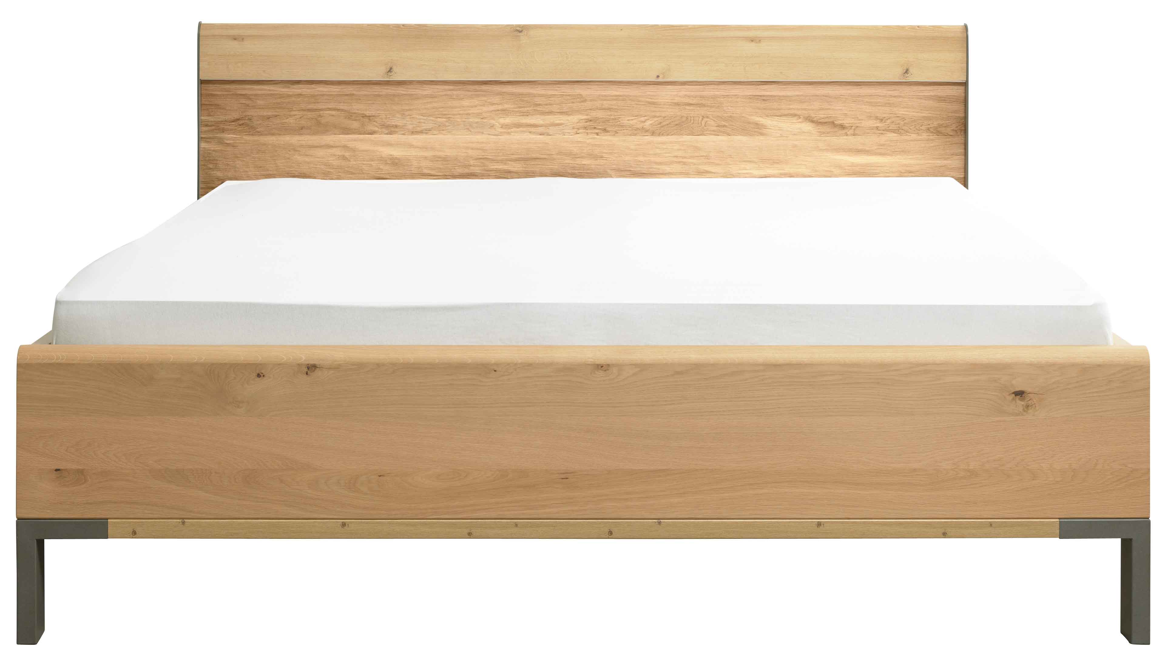 Das Bettgestell kombiniert biancofarbene Eiche-Nachbildung mit markanten Riffholz-Akzenten am Kopfteil – für eine gemütliche, natürliche Ausstrahlung. Die schieferfarbenen Metall-Winkelfüße setzen einen modernen Kontrast und verleihen dem Bett einen eleganten, zeitgemäßen Look.