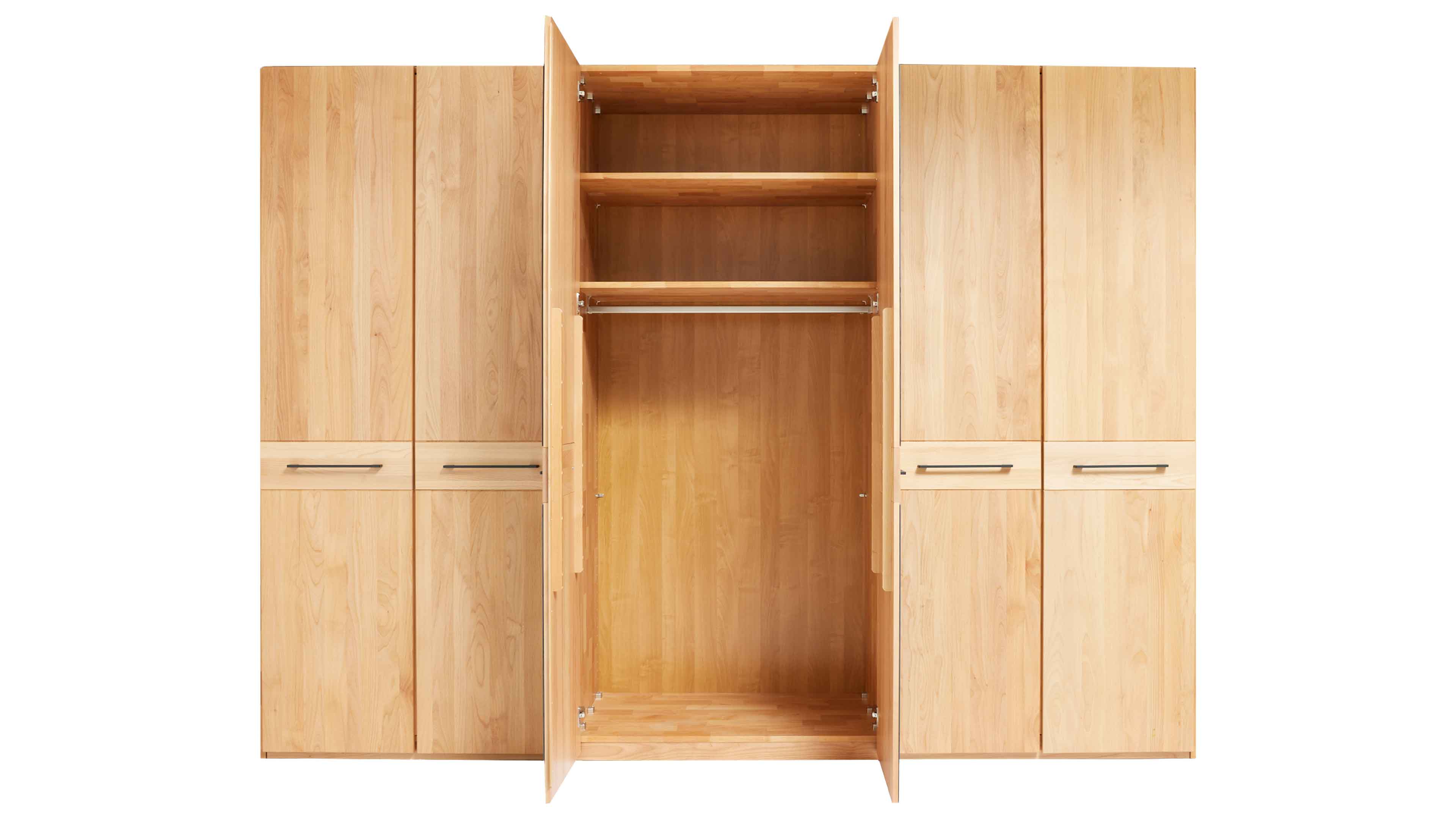 Schlafzimmer aus massiver Erle mit 6-türigem Kleiderschrank und Bett mit Polsterkopfteil