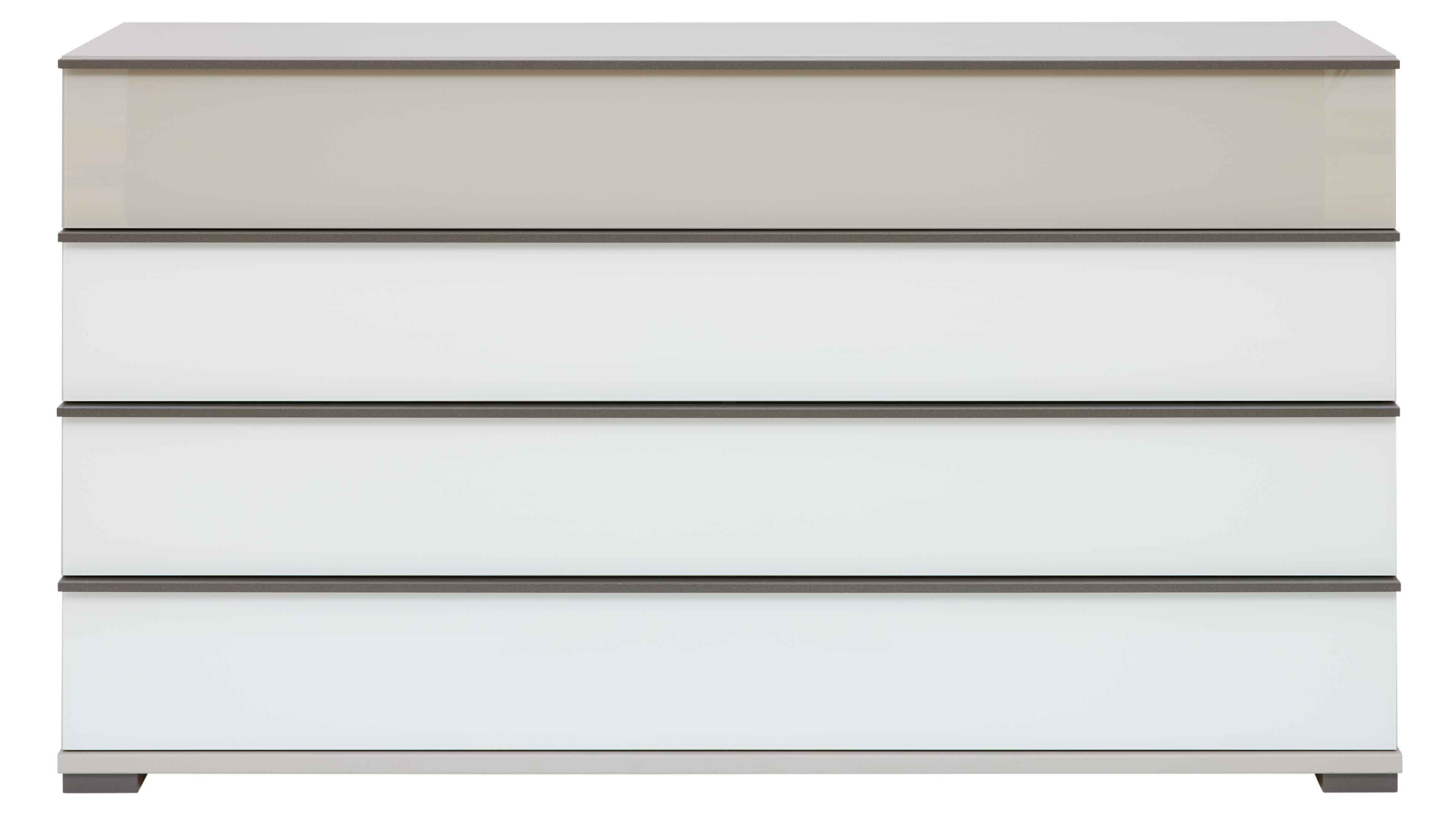 Die Schubladenkommode aus der Interliving Schlafzimmer Serie 1032 vereint modernes Design mit durchdachter Alltagstauglichkeit. Die Kombination aus weißen und kieselgrauen Glasfronten und pflegeleichten weißen Kunststoffoberflächen verleiht der Kommode eine helle, elegante Ausstrahlung. Griffleisten aus schieferfarbenem Metall setzen stilvolle Kontraste, während das silbergrau gestreifte Innendekor den hochwertigen Charakter des Möbels unterstreicht.