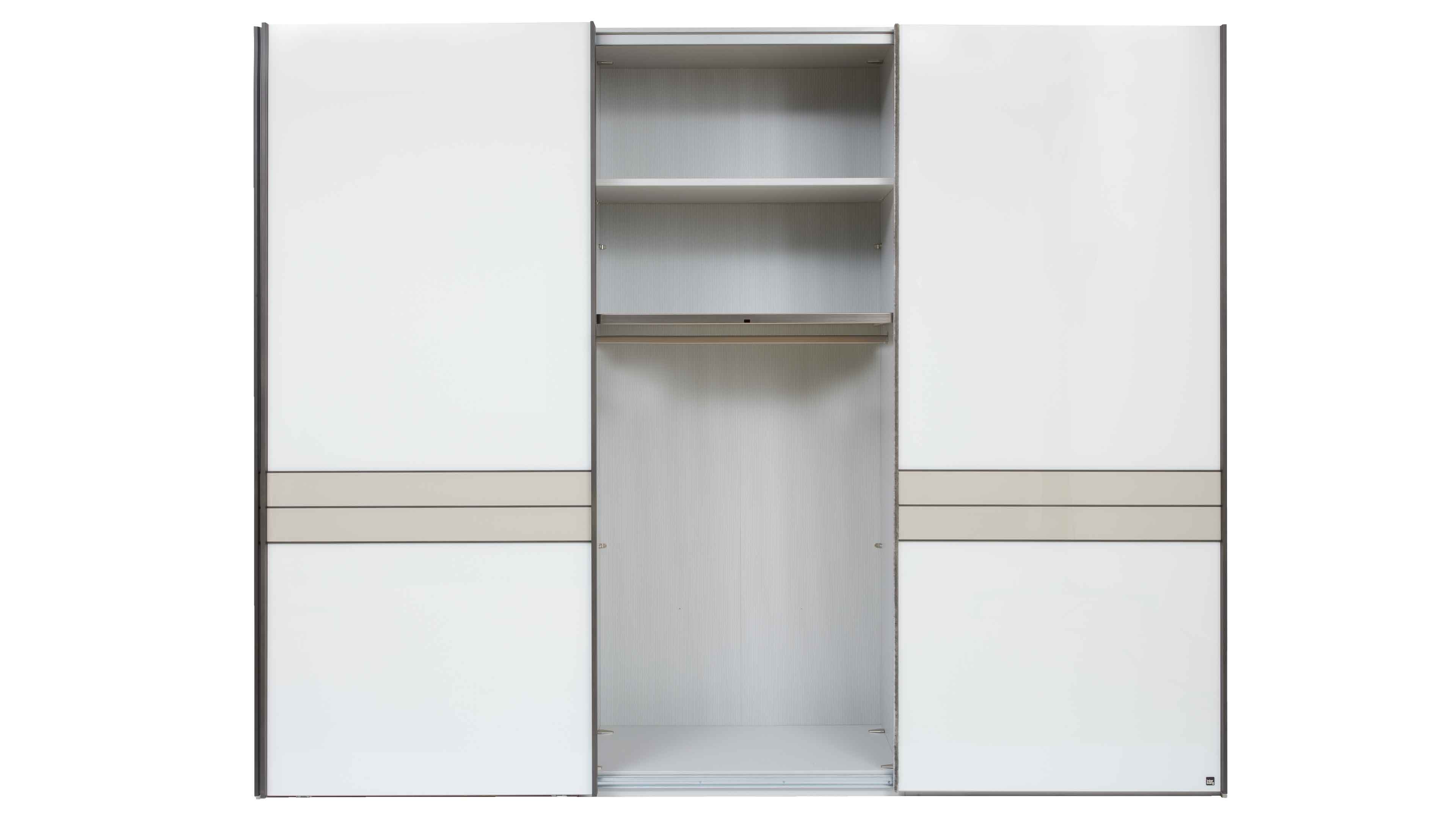 Das silbergrau gestreifte Innendekor macht auch das Innere zum Blickfang. Hinter den drei Schwebetüren erwarten dich drei höhenverstellbare und drei feste Kleiderböden sowie drei Metall-Kleiderstangen – perfekt, um Kleidung, Wäsche und Accessoires übersichtlich zu verstauen. Maße: ca. 300 x 217 x 67 cm (B/LxHxT) – ideal für großzügige Schlafräume.