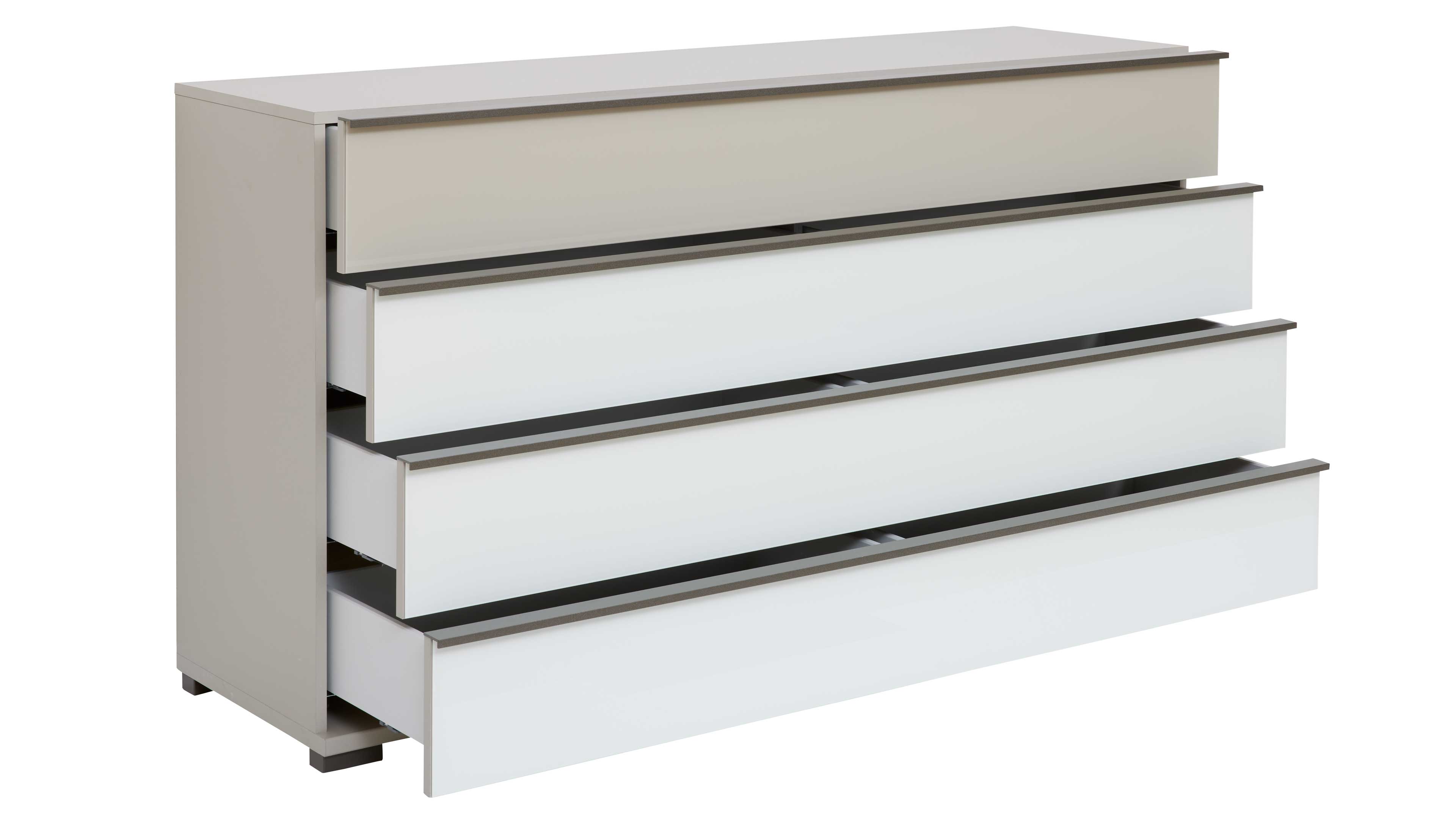 Die Schubladenkommode 275 kombiniert drei weiße und eine kieselgraue Glasfront mit einem mattweißen Korpus und schieferfarbenen Metall-Griffleisten. Ausgestattet mit Softeinzug und Soft-Close-Funktion. Das silbergrau gestreifte Innendekor unterstreicht die hochwertige Optik. Maße: ca. 149 x 82 x 42 cm (B/LxHxT) – vier großzügige Schubladen bieten reichlich Stauraum.