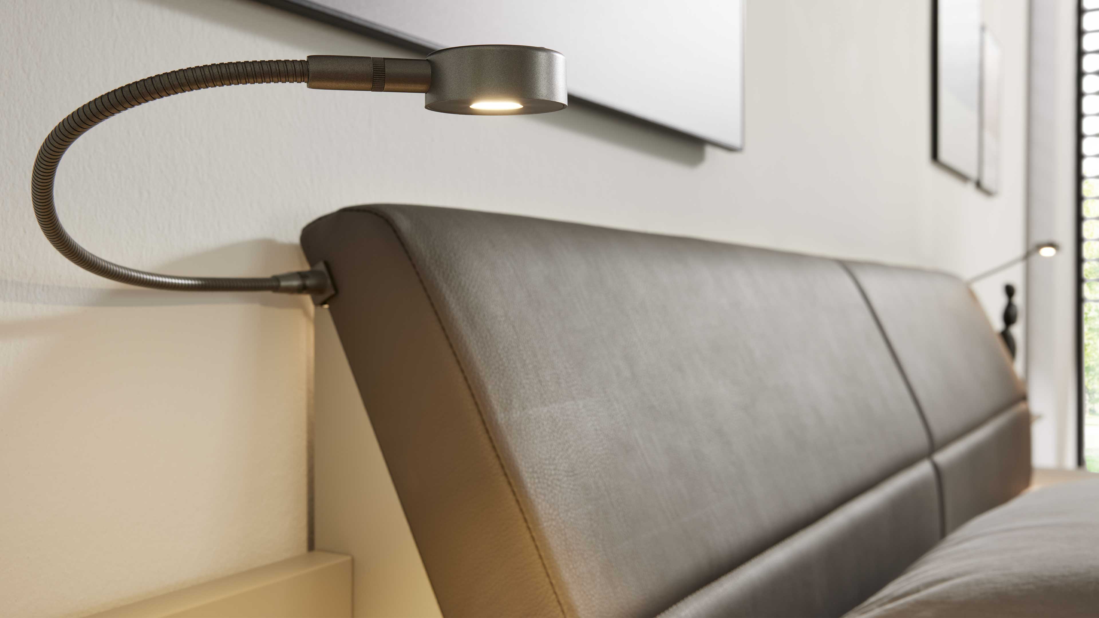 - Flexleuchten-Set 101 aus schieferfarbenem Metall, seitlich am Kopfteil befestigt, Maße: ca. 50 x 2 x 4 cm (LxHxT), punktgenaue Beleuchtung für Lesen oder stimmungsvolles Licht, fest verbaute LED-Leuchtmittel der Energieeffizienzklasse G (Spektrum A bis G), Kippschalter.