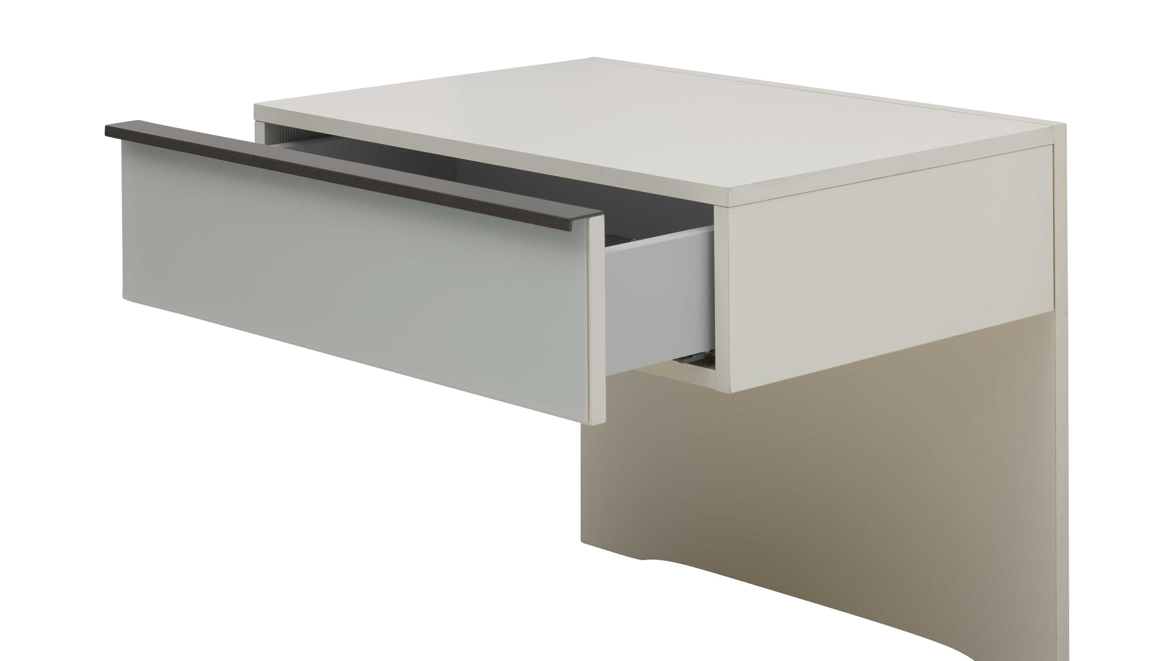 - Zweiteiliges Hängekonsolen-Set mit weißen Glasfronten und mattweißem Korpus, je eine Schublade mit Vollauszug und Softclose. Maße: ca. 60 x 48 x 43 cm (B/LxHxT).