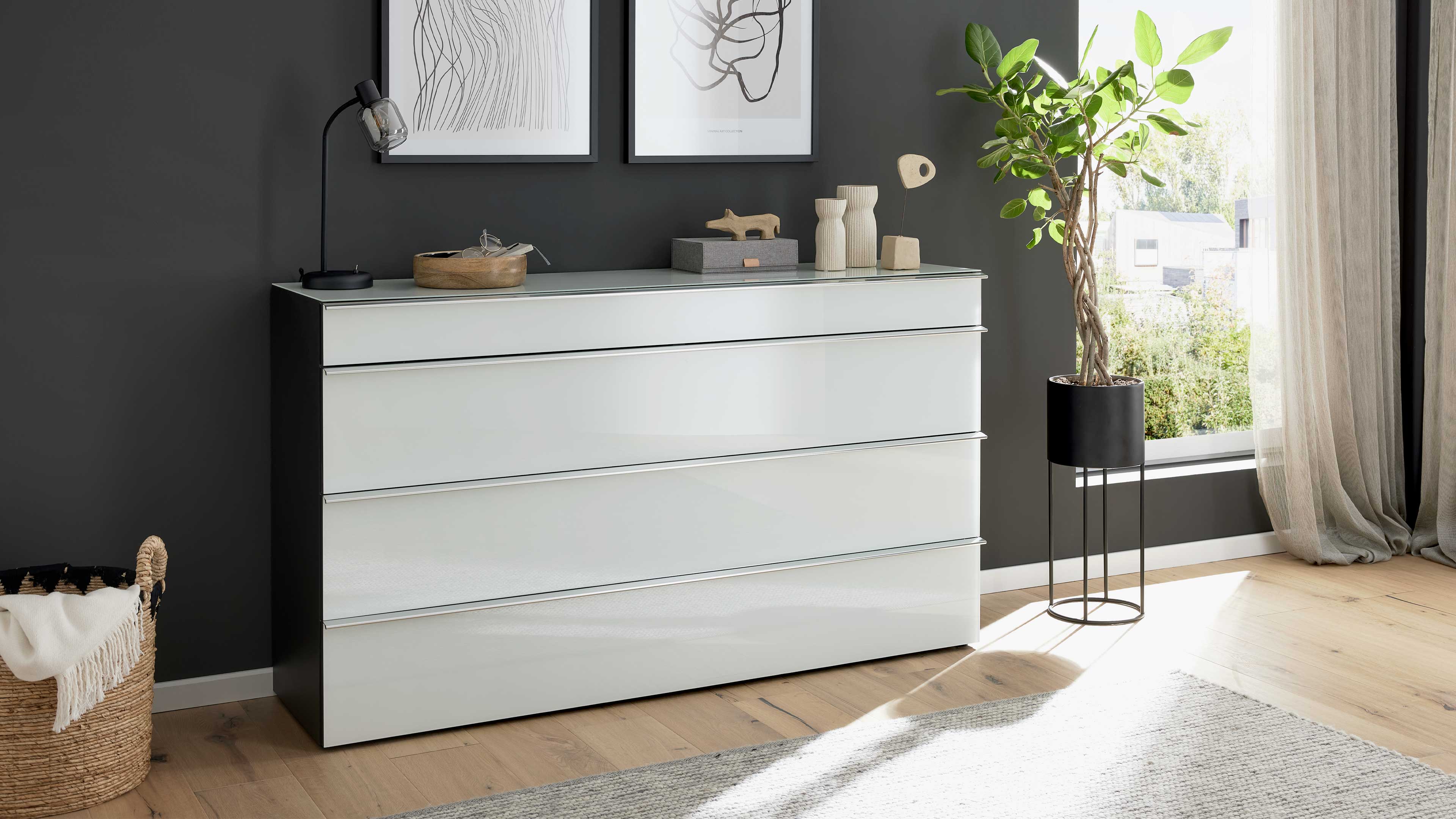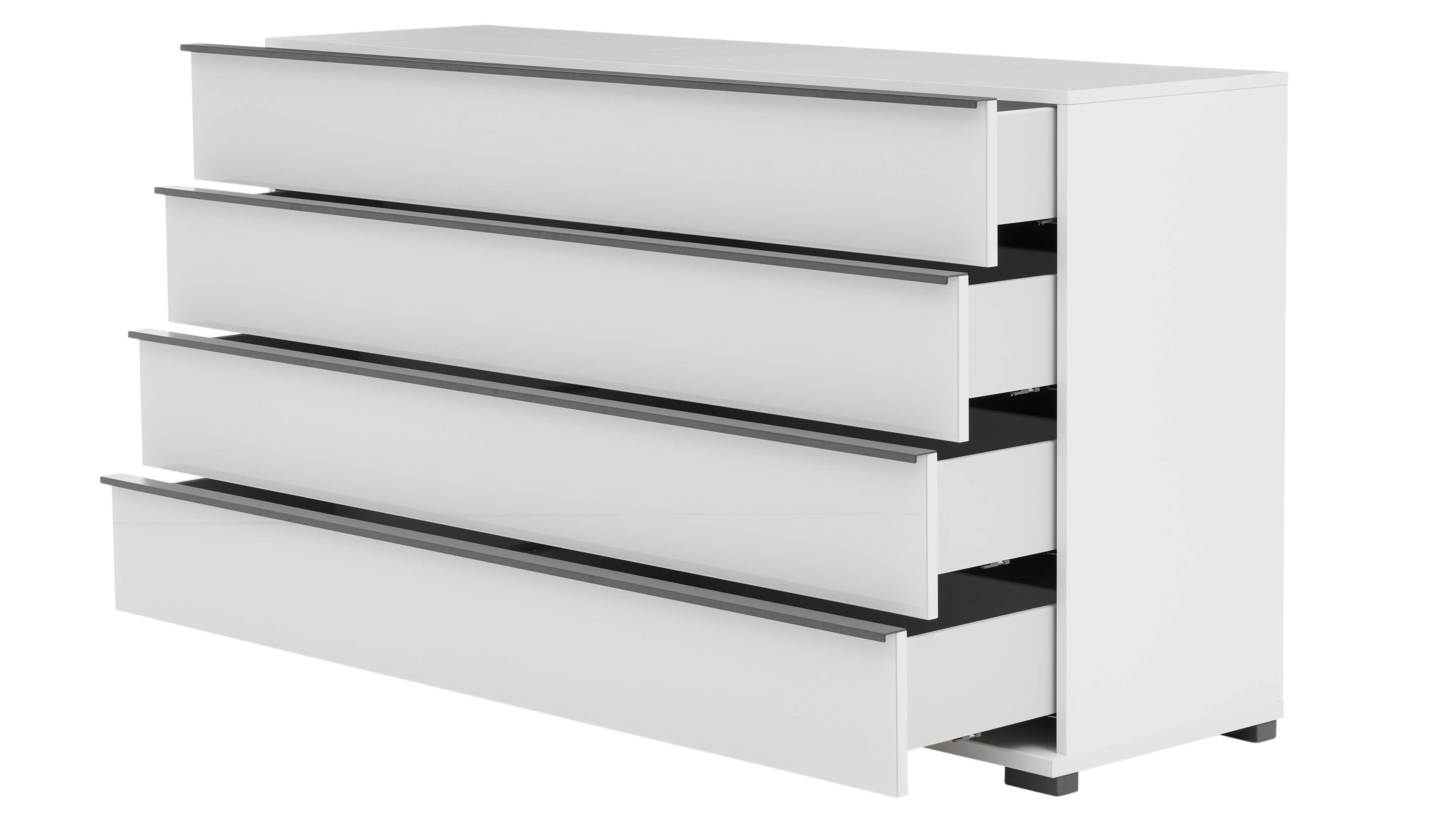 Abgerundet wird das Komplettzimmer durch die Schubladenkommode mit mattweißem Korpus, weißen Glasfronten und schieferfarbenen Griffleisten und Maßen von ca. 149 × 82 × 42 cm (B/LxHxT), ausgestattet mit Vollauszug und Softclose-Funktion. Die Kommode wird fertig montiert geliefert.