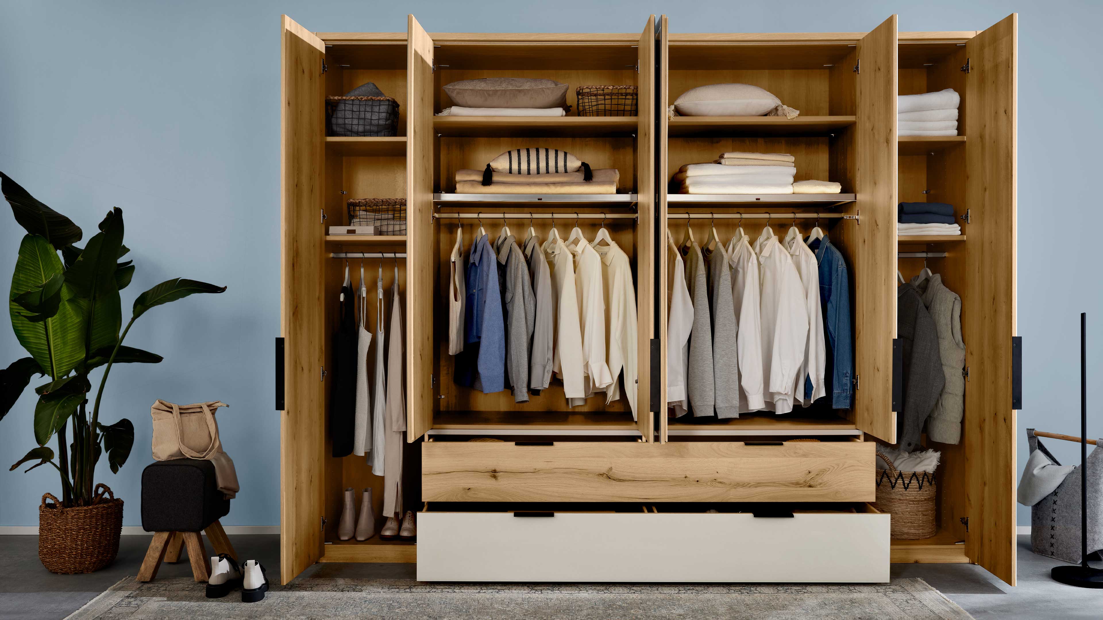Gestalte dein Schlafzimmer mit individuellen Akzenten – etwa durch Passepartout-Rahmen oder LED-beleuchtete Kranzleisten, die für eine elegante Lichtstimmung sorgen. Neben klassischen Drehtürenschränken umfasst das Programm auch Kombischränke, Ankleideschränke und Wäscheschränke, sodass du deinen persönlichen Stauraumbedarf optimal und stilvoll umsetzen kannst.