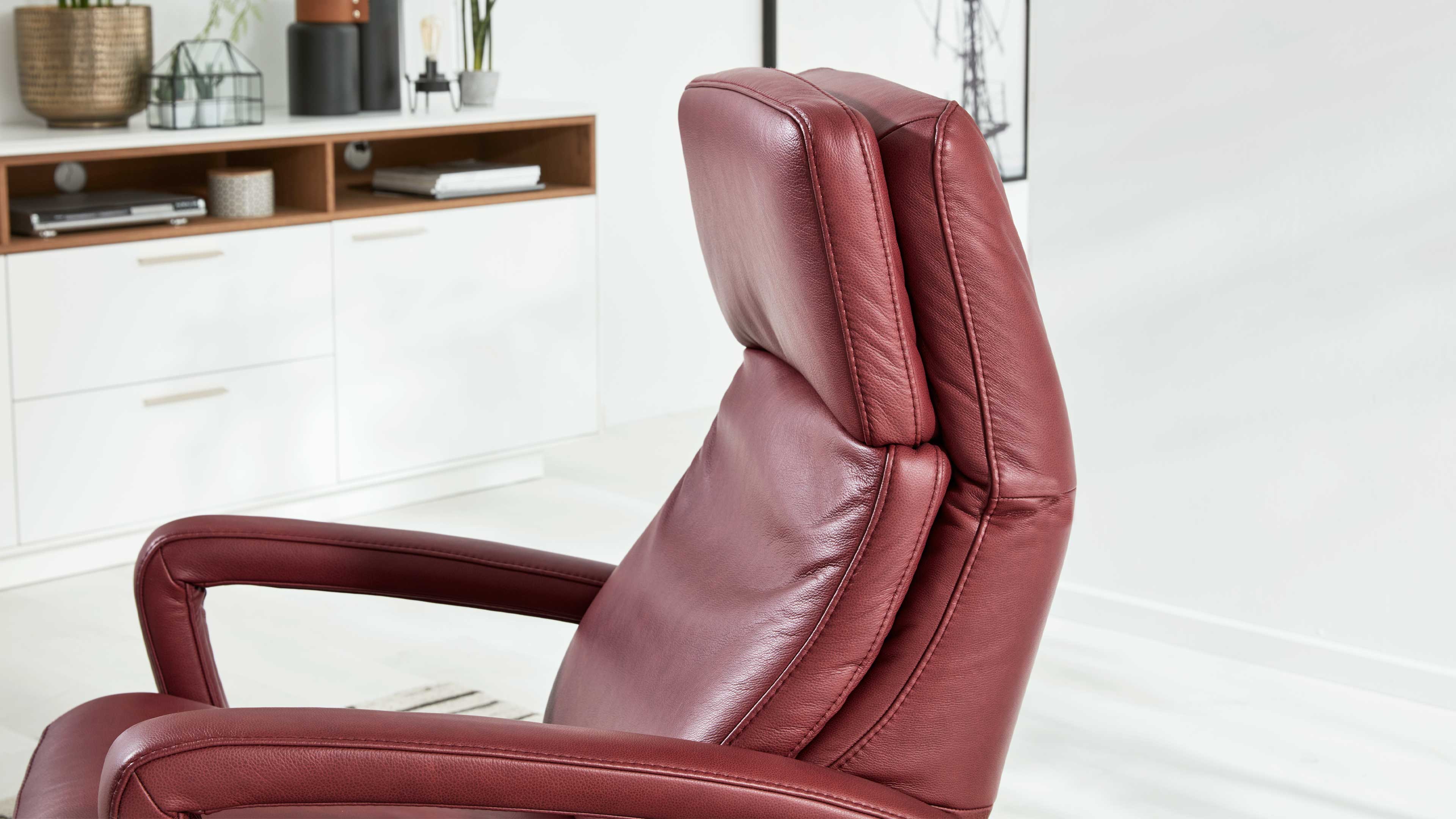 Für höchsten Sitzkomfort sorgt die leger-weiche Kaltschaumpolsterung, die in drei verschiedenen Sitzhärten – weich, mittel oder fest – erhältlich ist, jeweils ohne Aufpreis. Die vollgepolsterte Leder-Armlehne lädt zum gemütlichen Verweilen ein, während das manuell verstellbare Kopfpolster mit Rast-Klemm-Beschlag individuellen Halt bietet. Zwei weitere Armlehnenvarianten stehen optional zur Auswahl.