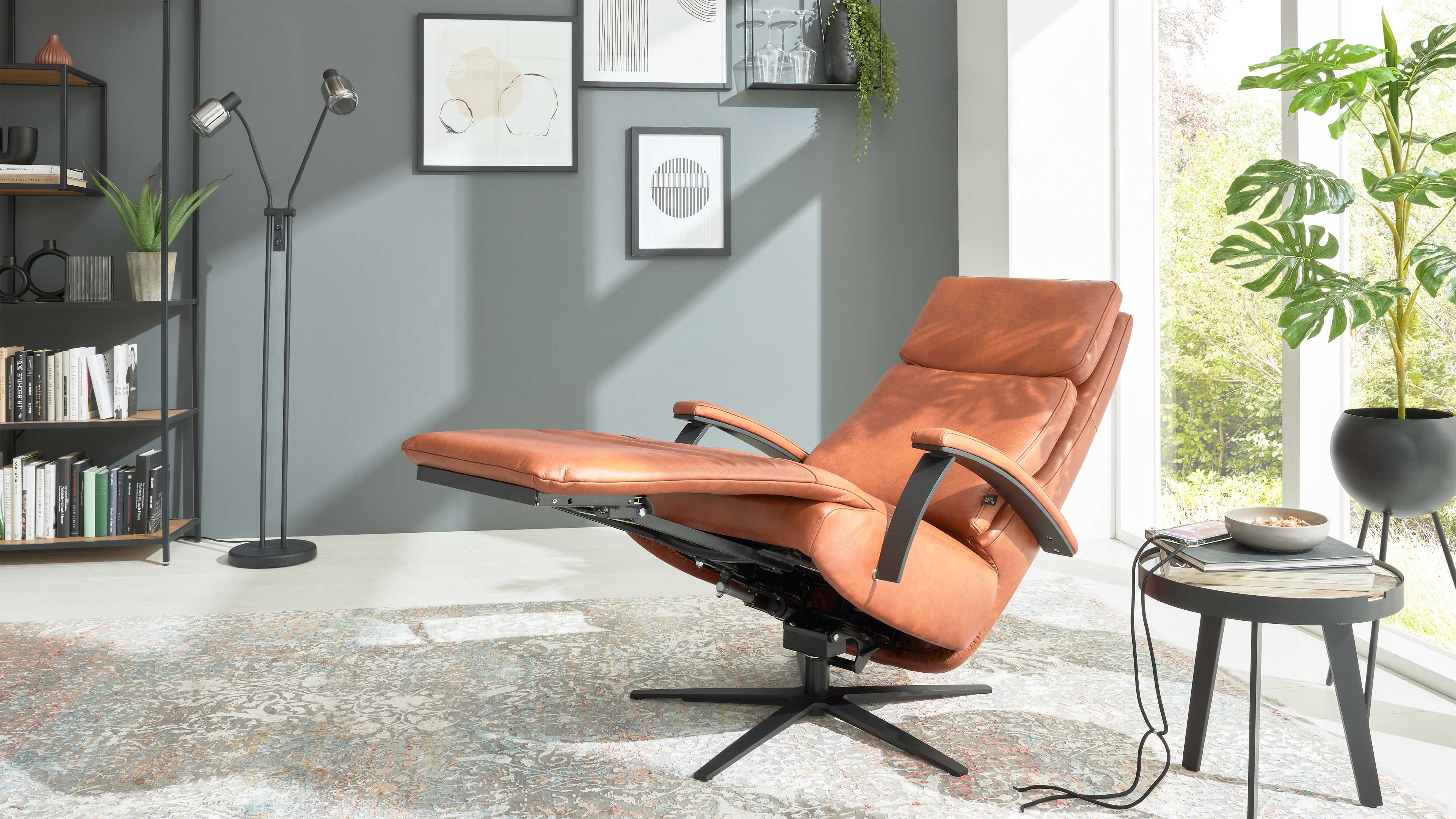 Der Relaxsessel mit manueller Relaxfunktion aus der Interliving Sessel Serie 4541 vereint edles Design mit hochwertigem Sitzkomfort. Der cognacfarbene LongLife-Lederbezug mit feiner Struktur in eleganter 2-Ton-Optik verleiht dem Sessel eine warme, luxuriöse Ausstrahlung. Der mattschwarze Metall-Sternfuß sorgt für moderne Leichtigkeit und Stabilität. Der Sessel wird in der Ergonomiegröße Small gefertigt und verfügt über eine vollgepolsterte Armlehne (nicht wie abgebildet in Kombination mit Metall) für ein besonders harmonisches Gesamtbild.
