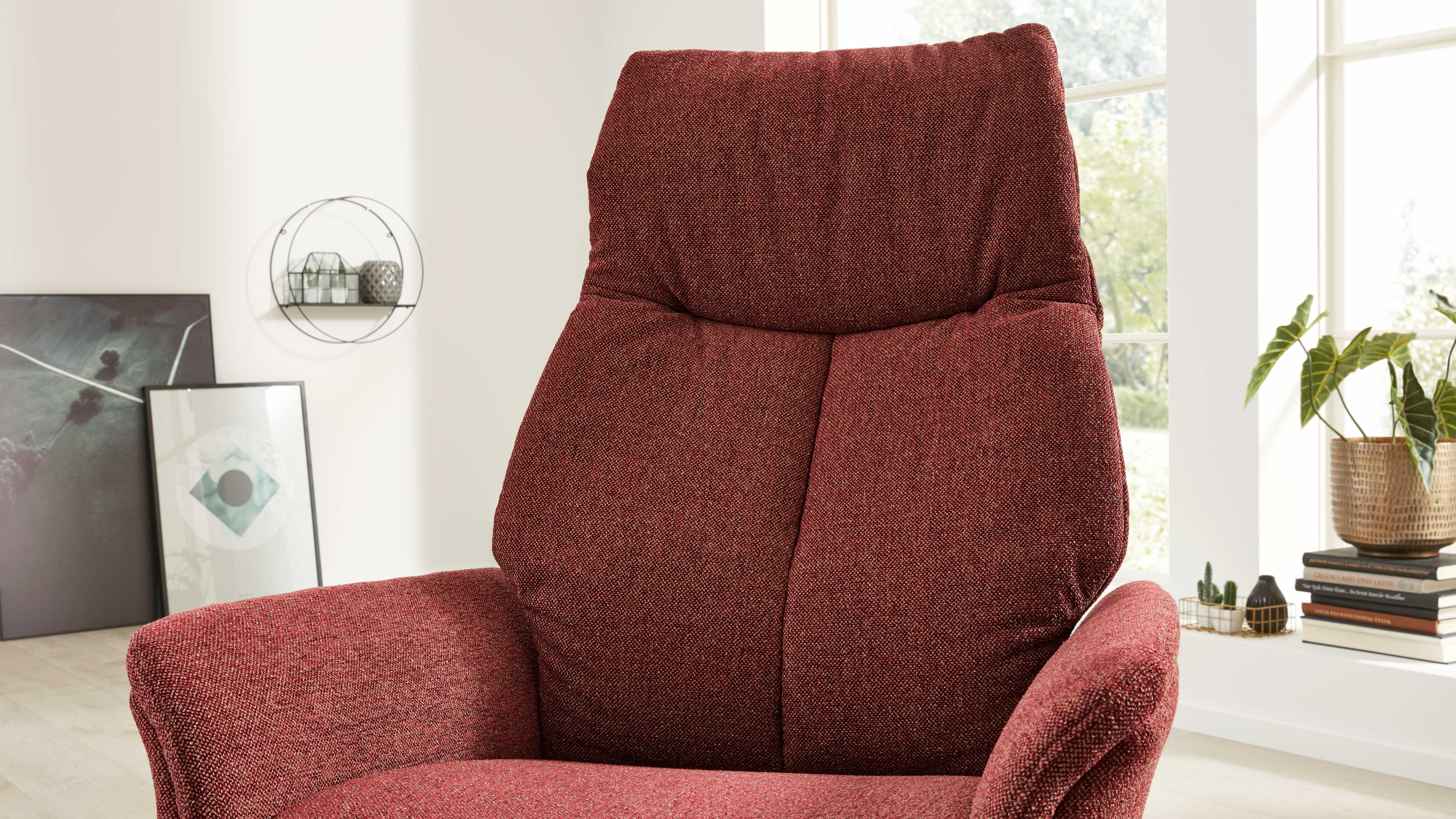 Der Drehsessel aus der Interliving Sessel Serie 4550 vereint elegantes Design mit hohem Sitzkomfort und handwerklicher Qualität. Der chiantifarbene Melange-Stoffbezug verleiht dem Sessel eine warme, wohnliche Note, während der anthrazitfarben pulverbeschichtete Sternfuß für einen modernen, leichten Look und stabilen Stand sorgt.