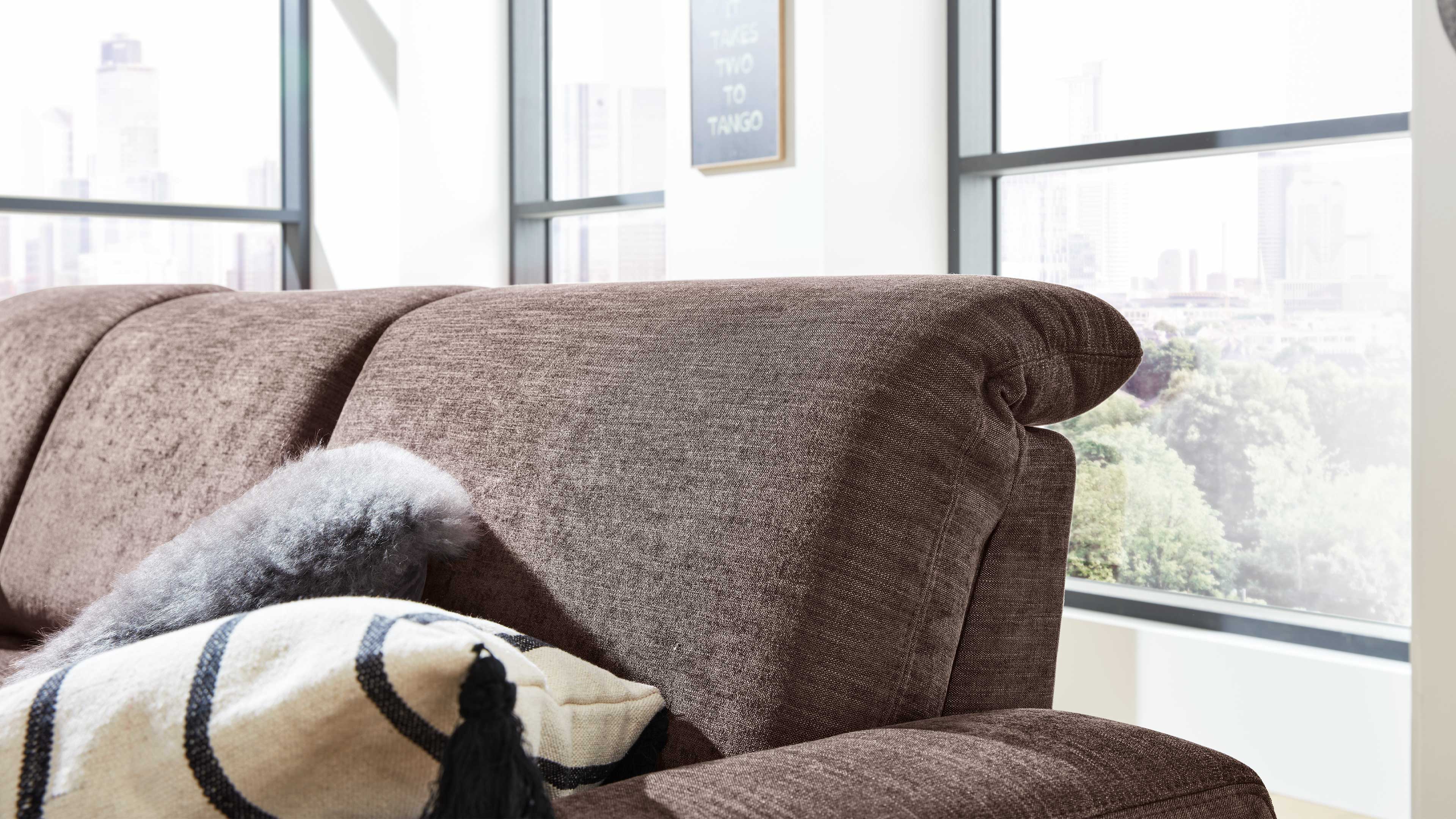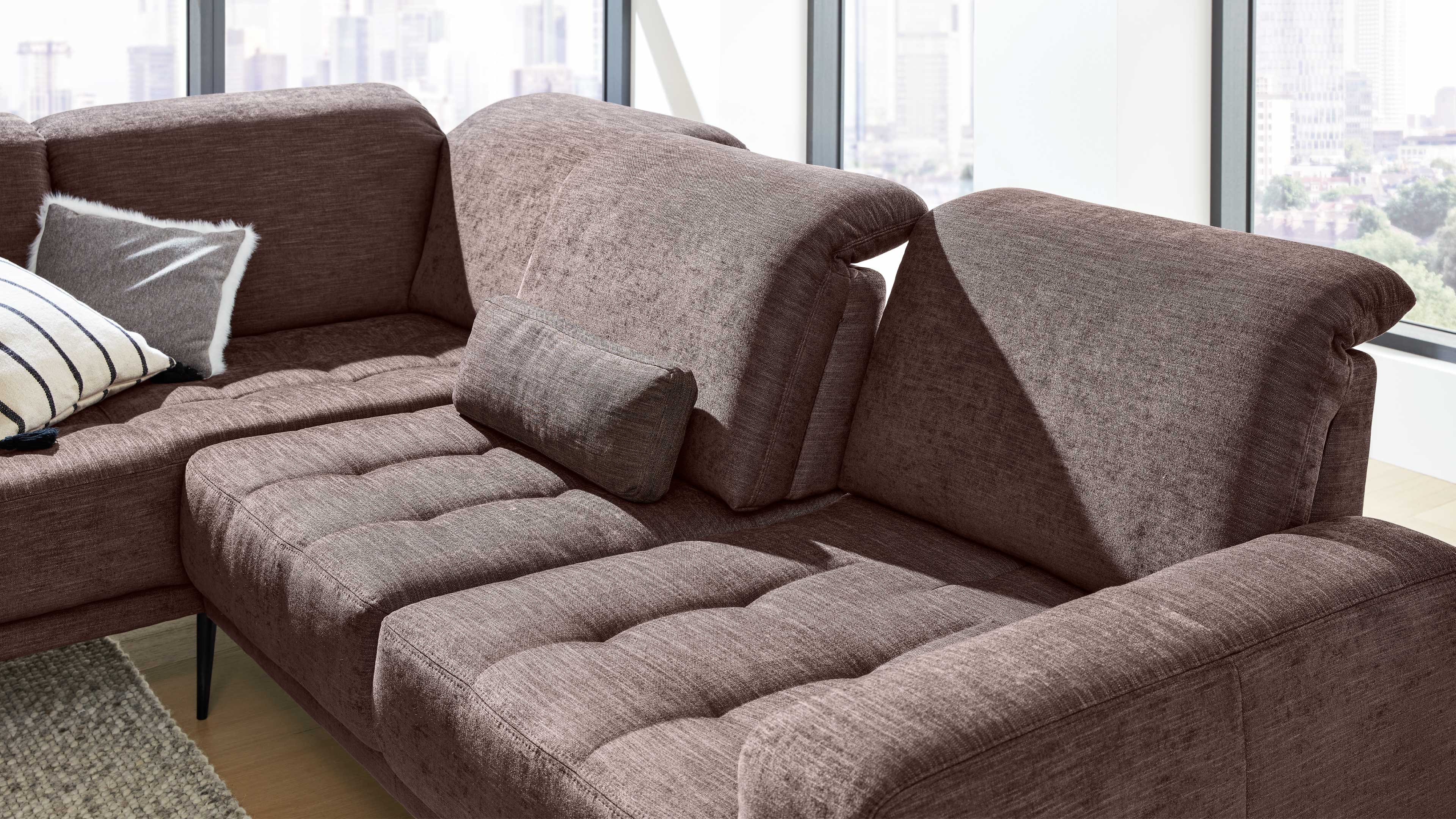 Für zusätzlichen Komfort lässt sich das Ecksofa optional mit verstellbaren Kopfstützen ausstatten – perfekt für ergonomisches Sitzen und entspanntes Zurücklehnen.