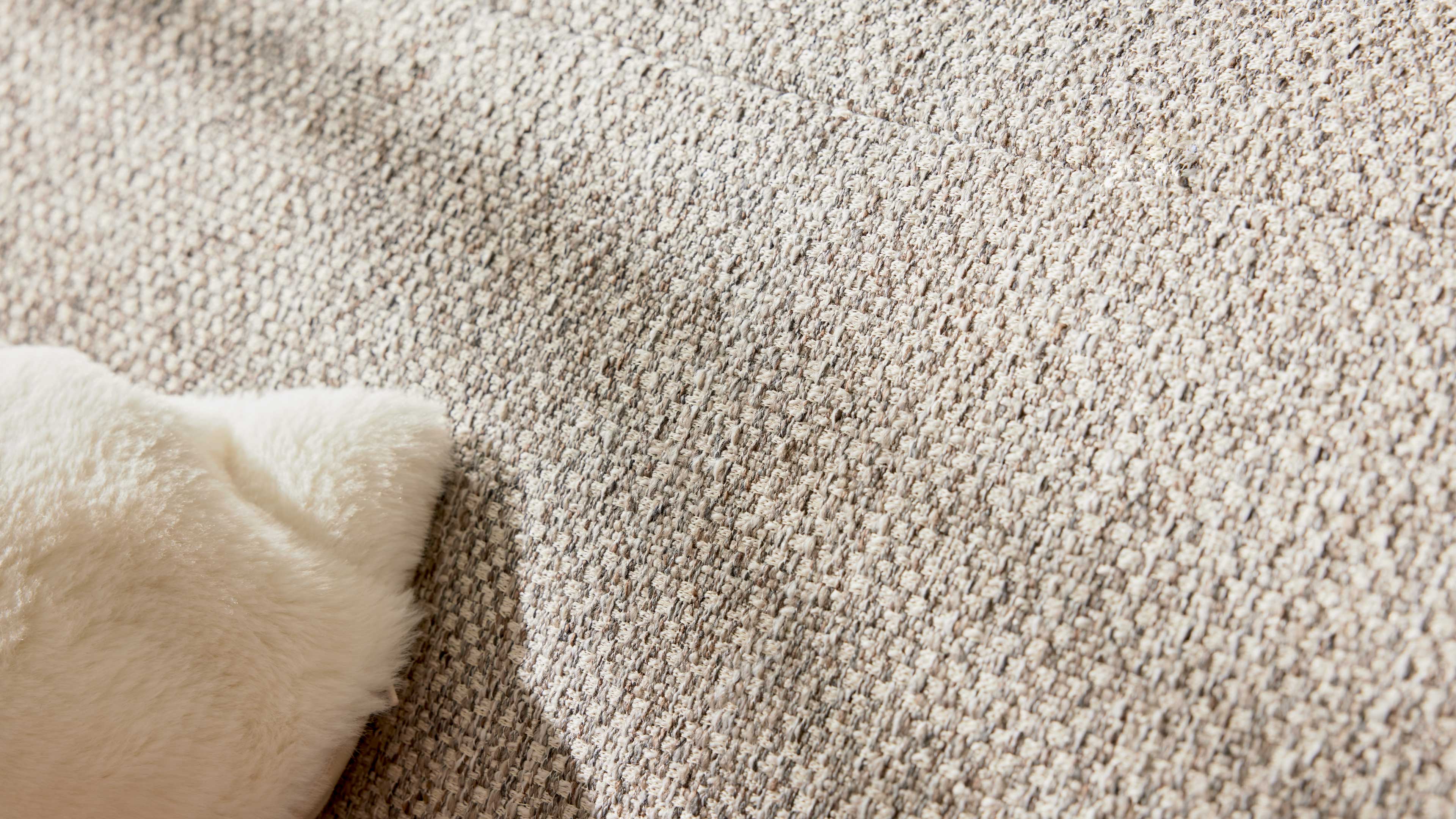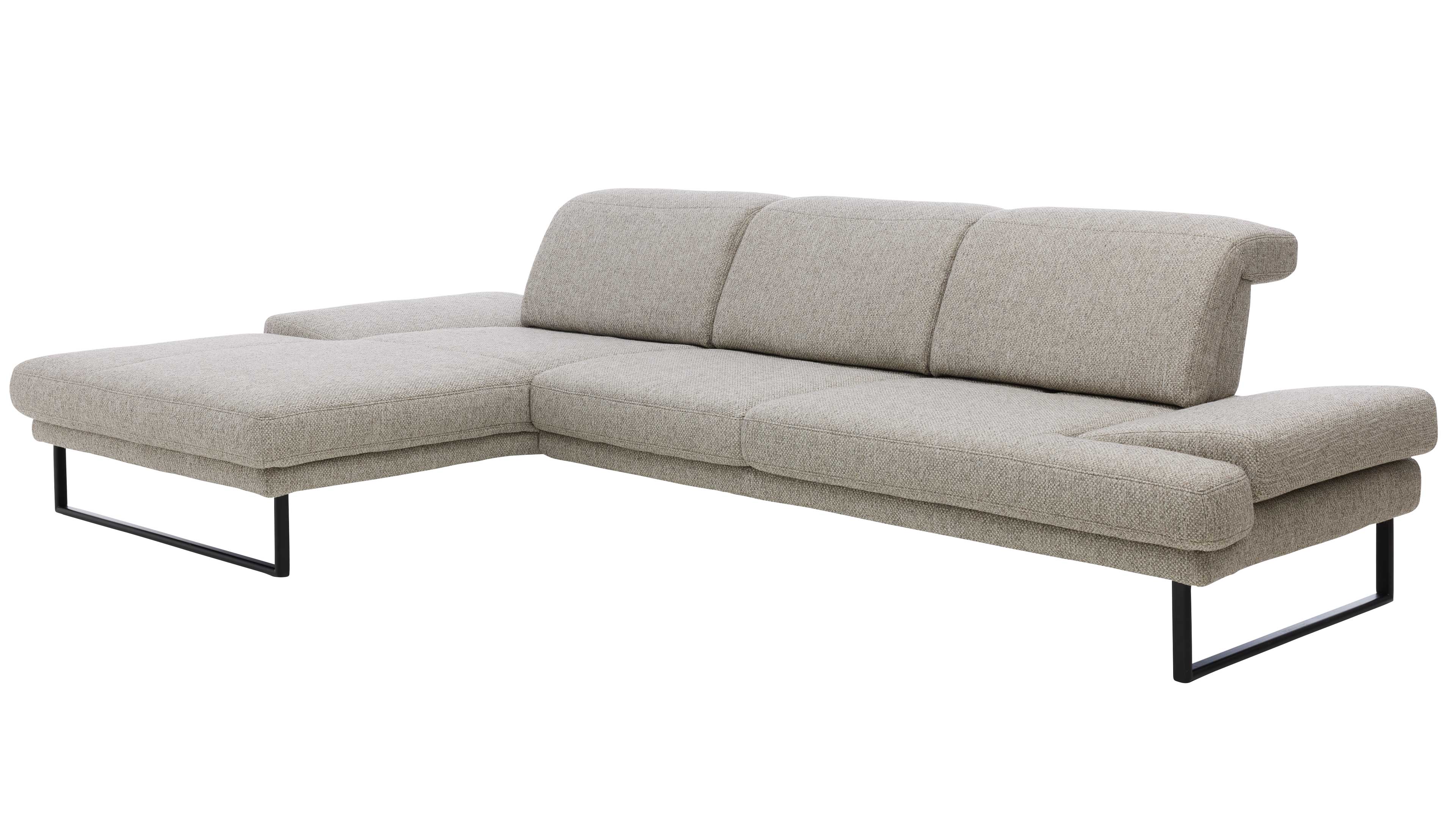 Der zeitlose Webstoff in Silbergrau trifft auf filigrane Metallrundfüße in Schwarz und verleiht dem Sofa eine leichte, moderne Anmutung. Die Kombination wirkt elegant und zugleich wohnlich – für eine Couchlandschaft, die sich nahtlos in zeitgemäße Einrichtungsstile einfügt.