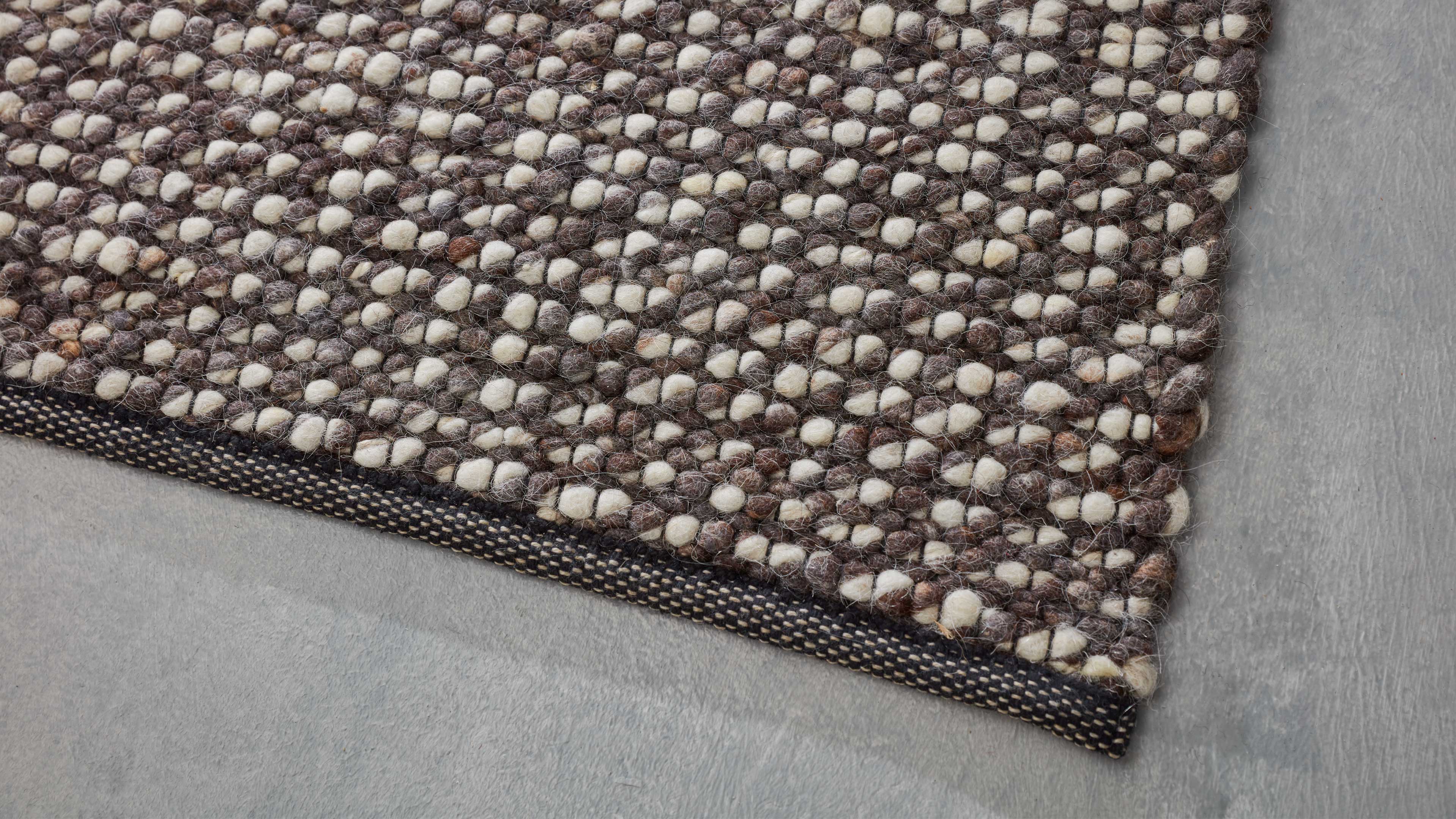 Die Nutzschicht besteht zu 100 % aus gewalkter Schurwolle, die Rückseite aus 55 % gewalkter Schurwolle und 45 % Jute. Beide Materialien sind nachhaltig, strapazierfähig und fördern ein angenehmes Raumklima. Der Teppich ist traditionell in Europa handgewebt und überzeugt durch seine feine Struktur und langlebige Verarbeitung.
