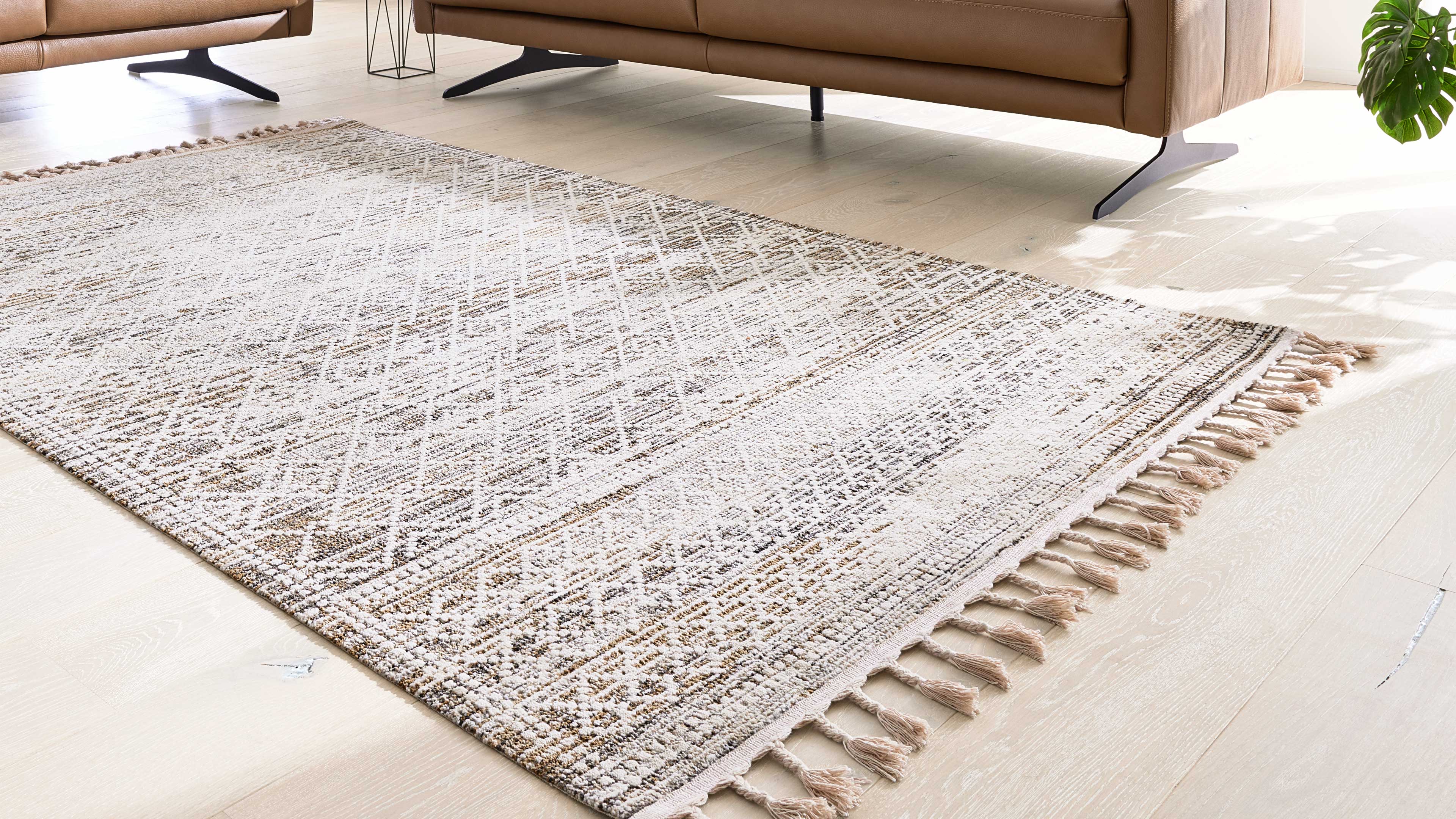 Das Vintagemuster in Naturtönen verleiht dem Teppich seine moderne, zugleich gemütliche Ausstrahlung. Die dekorativen Fransen setzen charmante Akzente und sorgen für eine leichte, verspielte Optik – ein stilvoller Blickfang, der jedes Wohnkonzept abrundet.