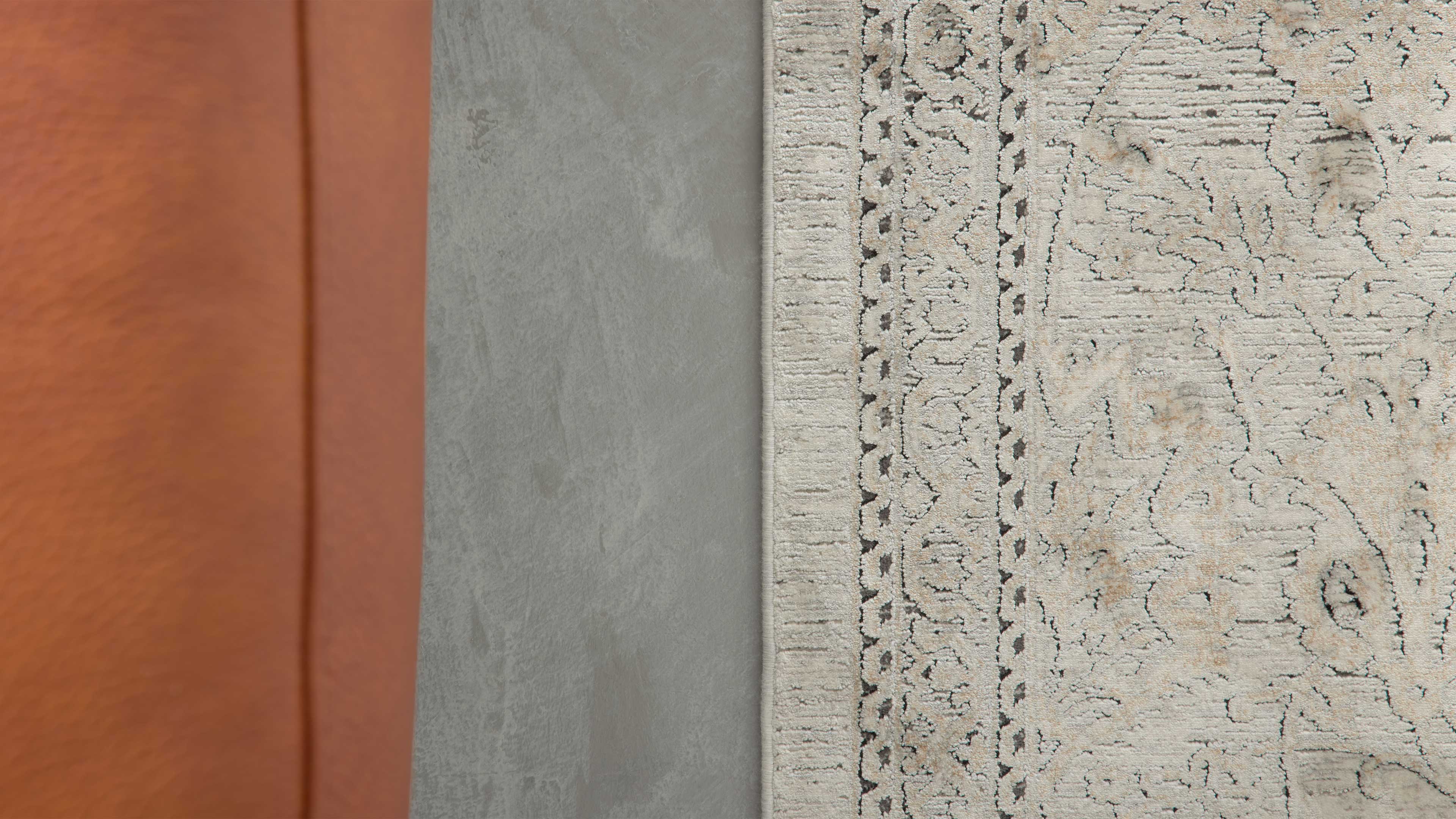 Der maschinell gewebte Teppich besteht aus einem edlen Mischgewebe aus 80 % Viskose und 20 % Acrylgarn. Diese Kombination sorgt für eine besonders weiche Oberfläche und gleichzeitig hohe Widerstandsfähigkeit. Mit einer Grammatur von ca. 2.700 g/m² und einer Florhöhe von ca. 6 mm bietet er angenehmen Gehkomfort bei stabiler Form. Seine Maße betragen ca. 133 x 190 cm (BxL) – ideal für Wohn- oder Esszimmer.
